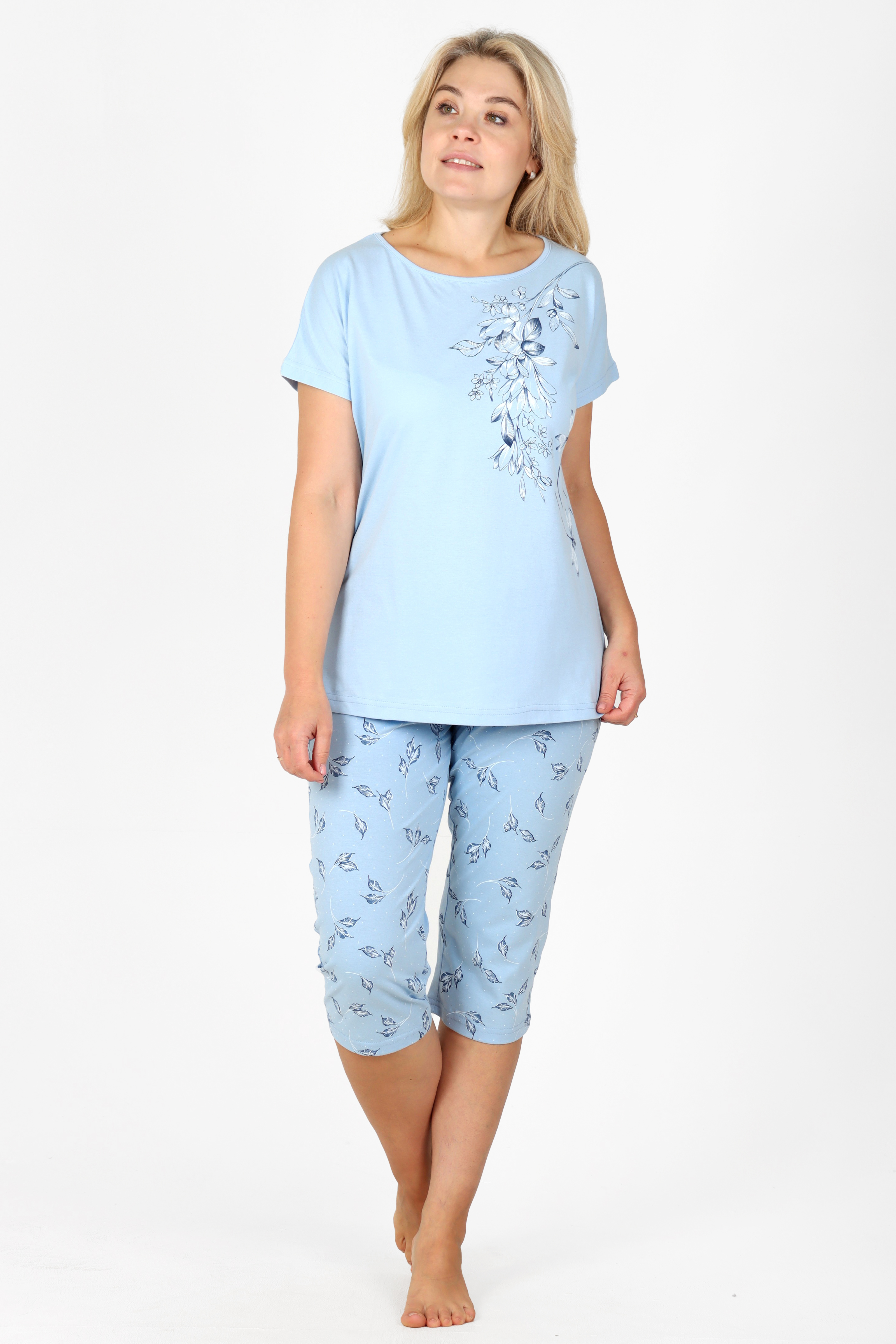 Однотонная футболка со свободным спущенным рукавом дополнена принтом по низу полочки с изображением нежной цветочной гирлянды, подобранной в тон набивной ткани бриджей.