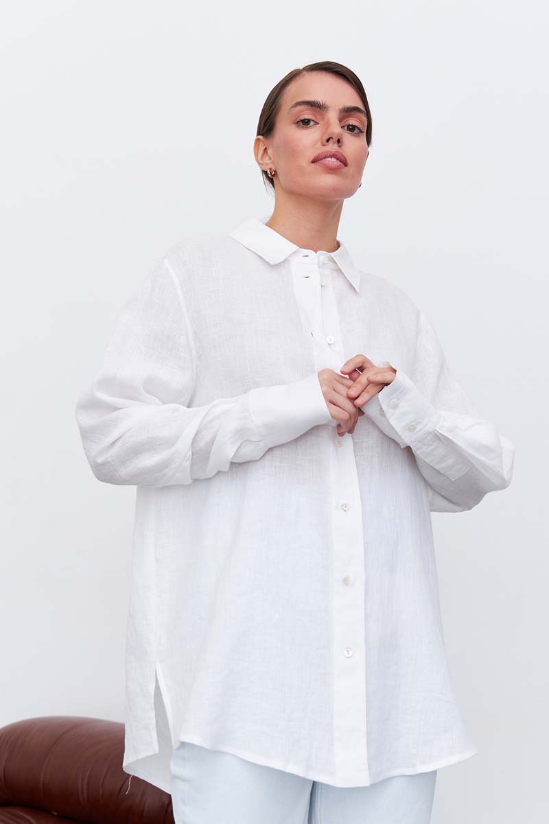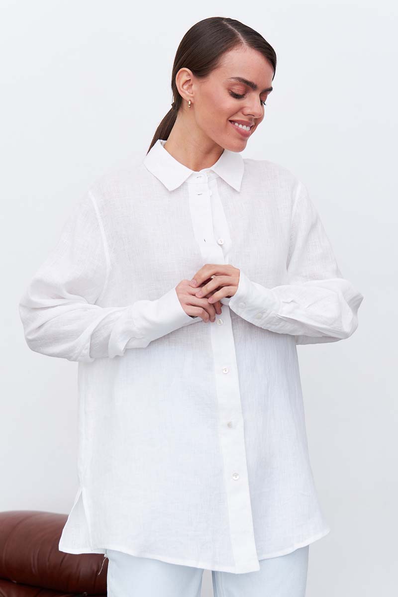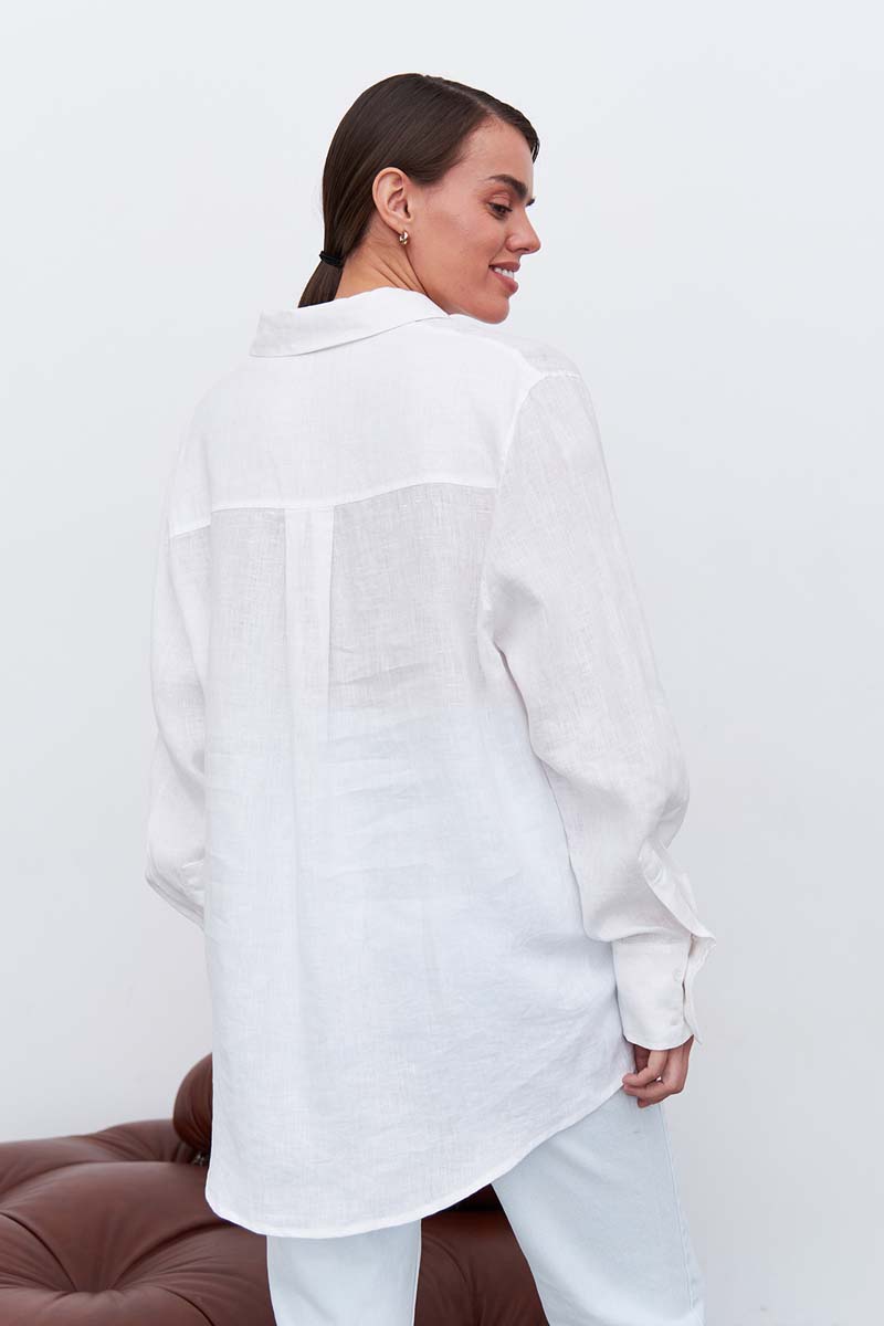 Качественная женская рубашка изо льна свободного кроя, пудрового цвета, с кокеткой на спине, и разрезами по бокам. Рубашка подходит как для офиса, так и для повседневных образов. Тонкий длинноволокнистый лен особенно прочный, отлично пропускает воздух и впитывает влагу, что делает его идеальным выбором для гардероба. Свободная и удлиненная, эта легкая рубашка может дополнить образы для отдыха с шортами и короткими топами, легинсами, джинсами, брюками и юбками. Рубашку можно носить как блузку, а можно носить как второй слой поверх футболки или топа. Сделано в России на собственном производстве.