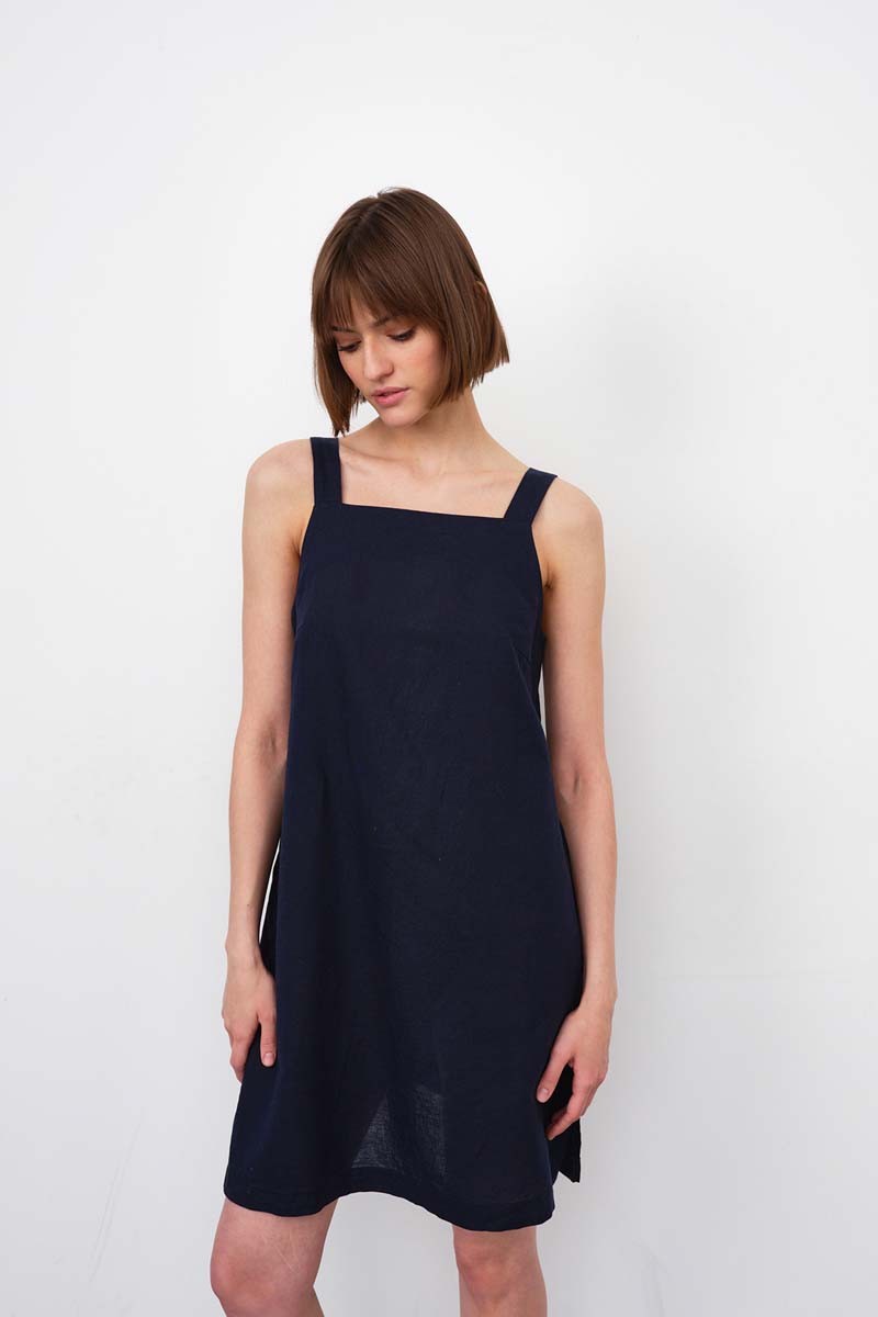 Короткий льняной сарафан на широких бретелях брусничного цвета. Платье А-образного силуэта, c маленькими разрезами по бокам. Модель выполнена из 100% льна высокого качества. Сделано в России на собственном производстве.