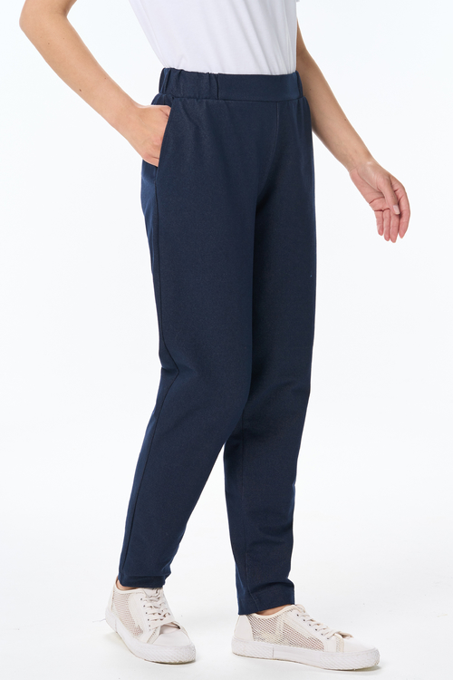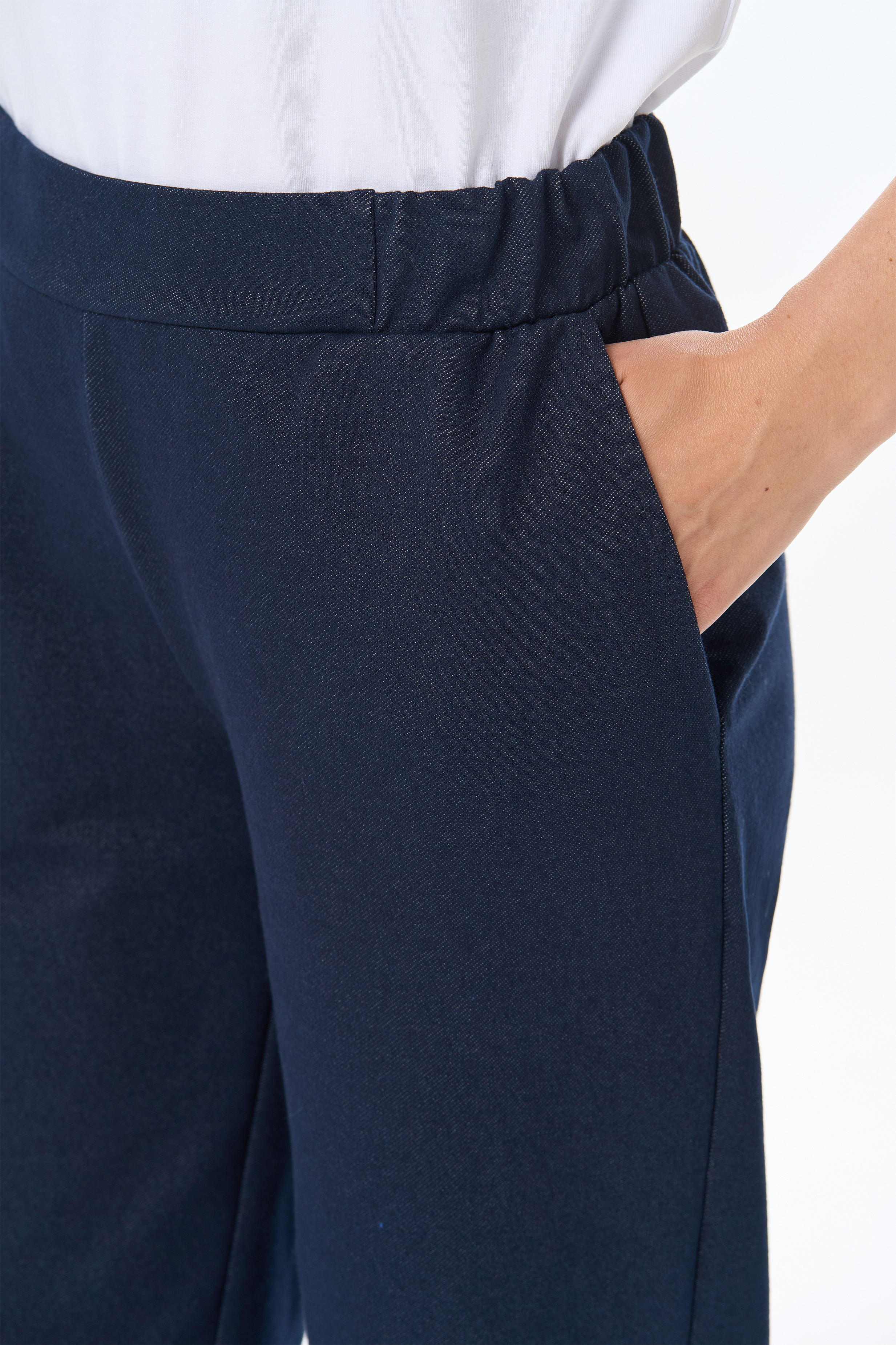 Описание: Длинные чуть зауженные брюки с карманами из хлопкового полотна джинскотт. Пояс с планкой и эластичной тесьмой внутри. Длина по боковому шву (без учета пояса) 95см. Рост модели на фото 177.