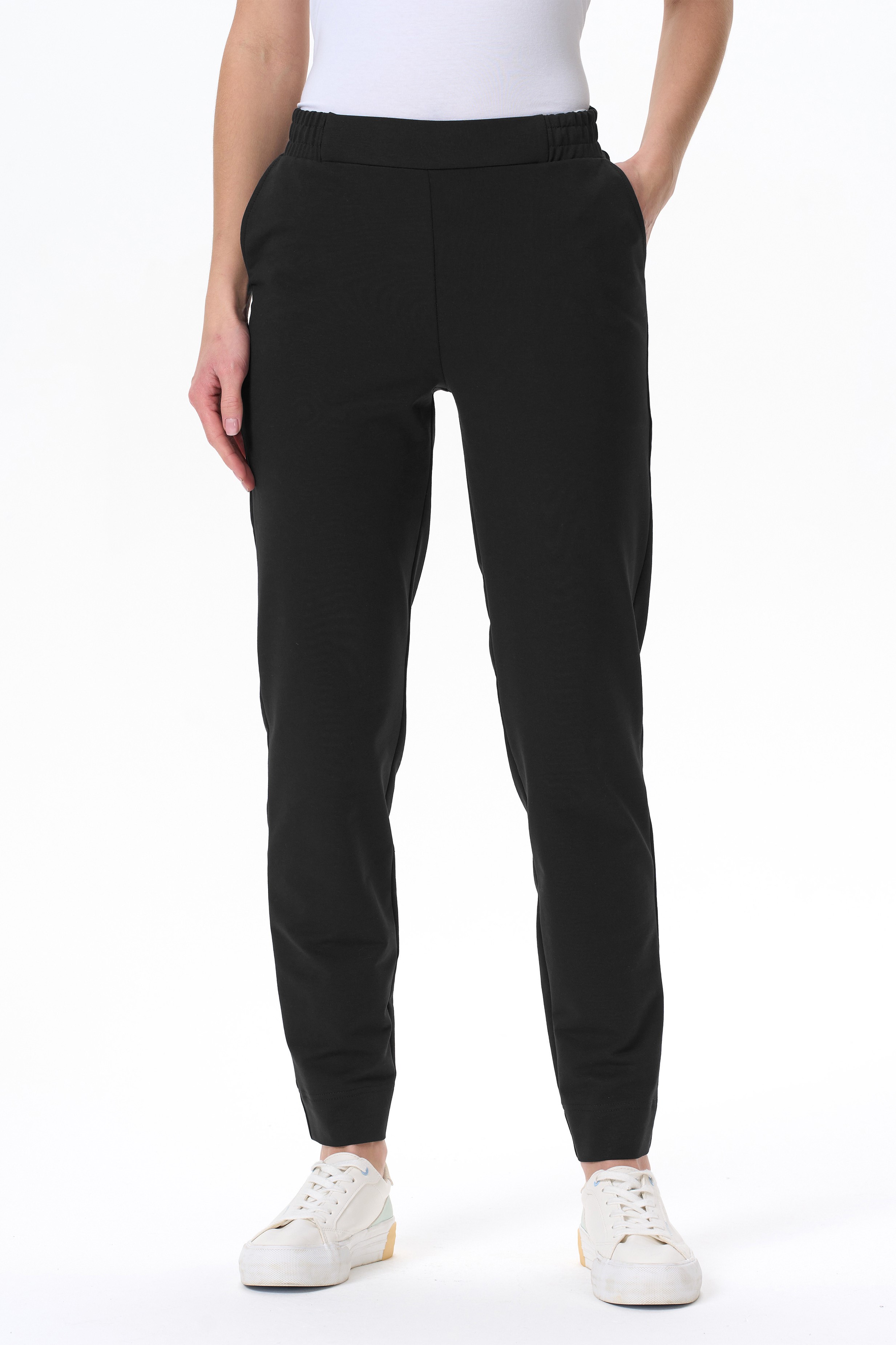 Описание: Зауженные брюки с карманами, из хлопкового полотна футер (без начеса). Пояс с планкой и эластичной лентой внутри. Длина брюк регулируется подворотом. Длина по боковому шву (без учета пояса) в 44 размере 98см. Рост модели 177.