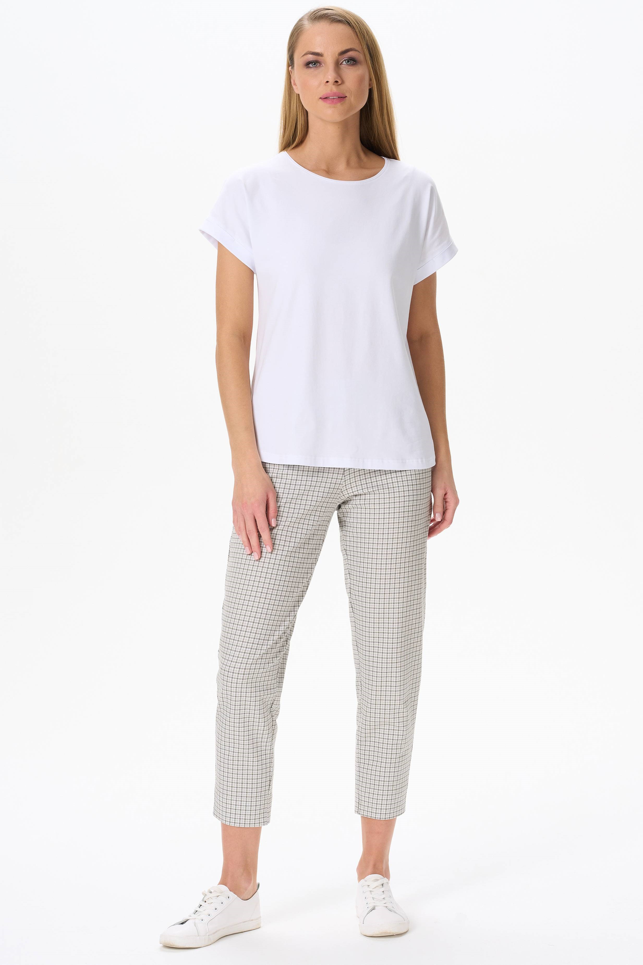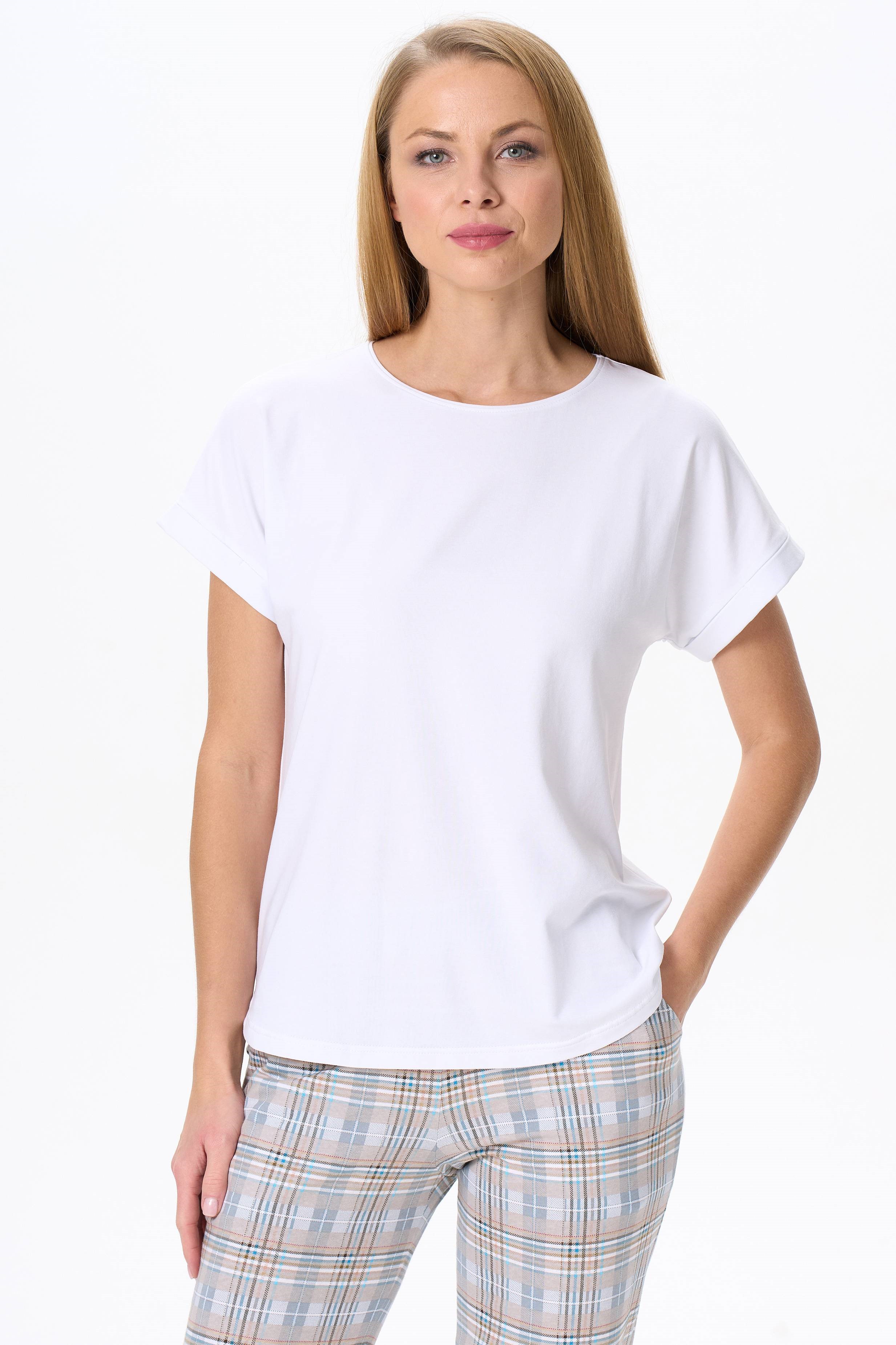 Описание: Футболка из хлопкового полотна с эластаном. Круглый вырез горловины, цельнокроеные короткие рукава с отворотами, фигурная линия низа. Рост модели на фото 175 см.