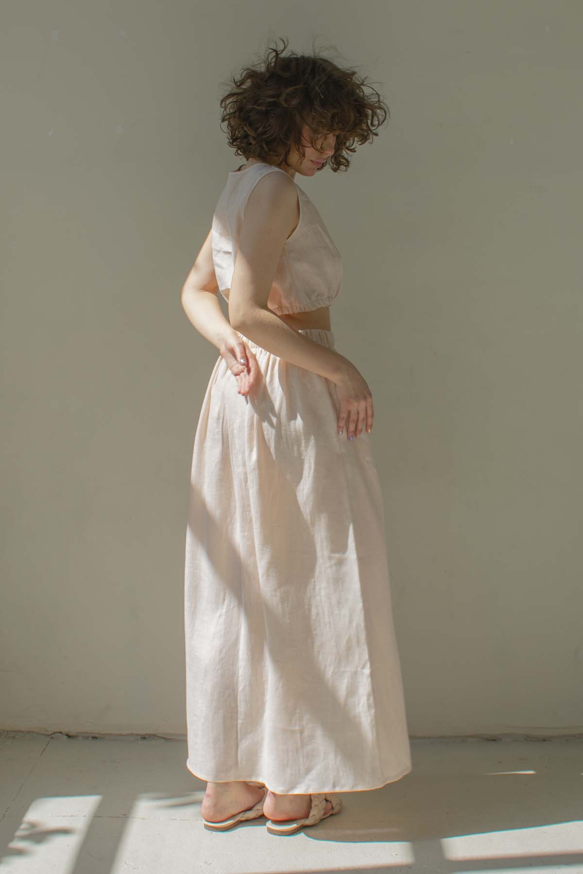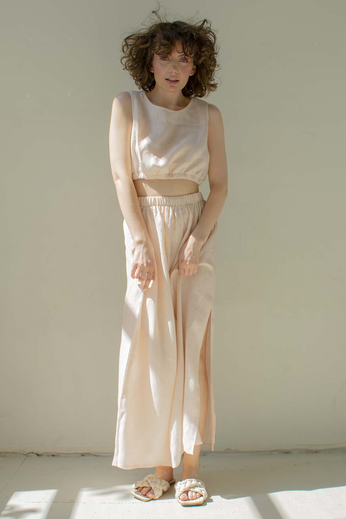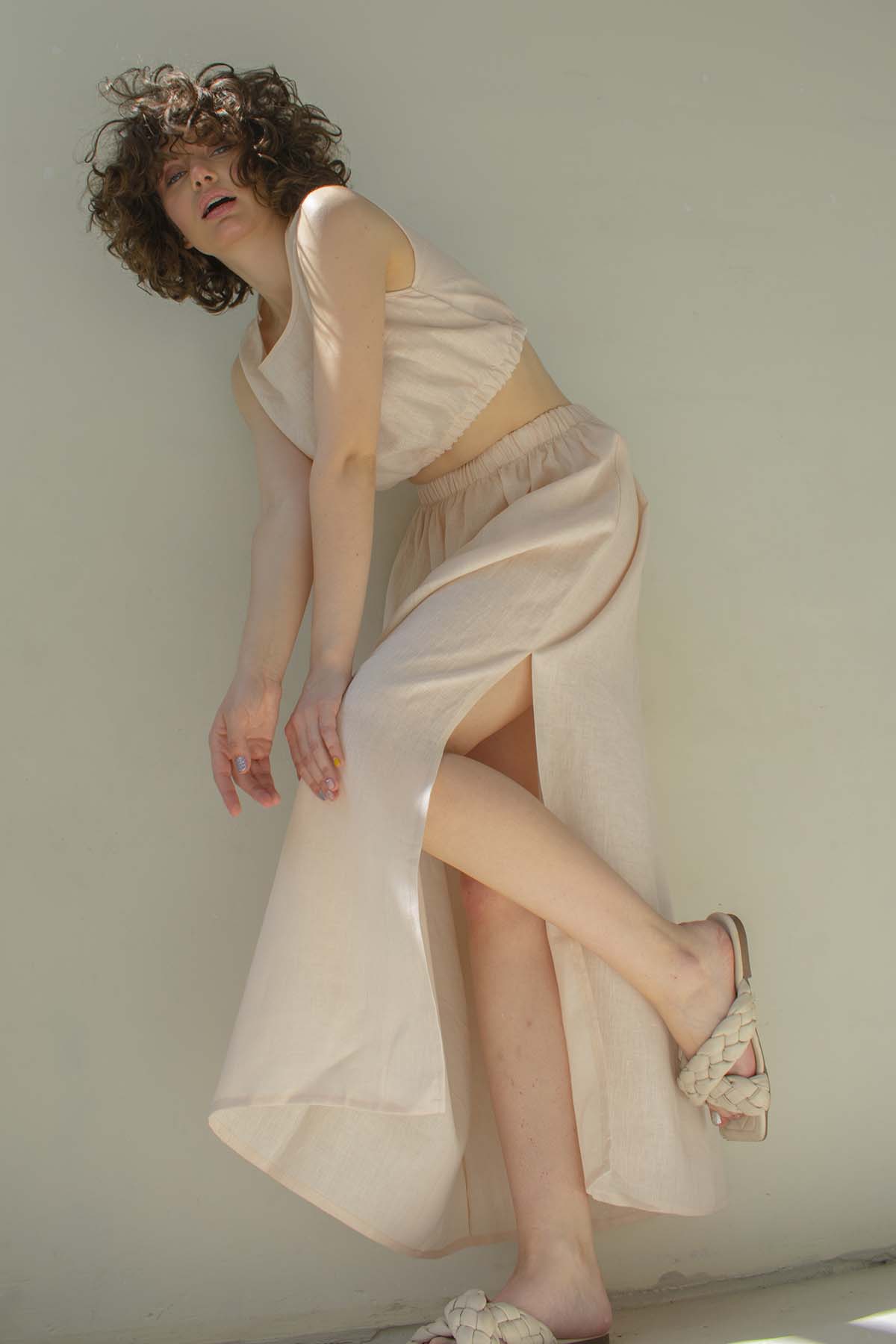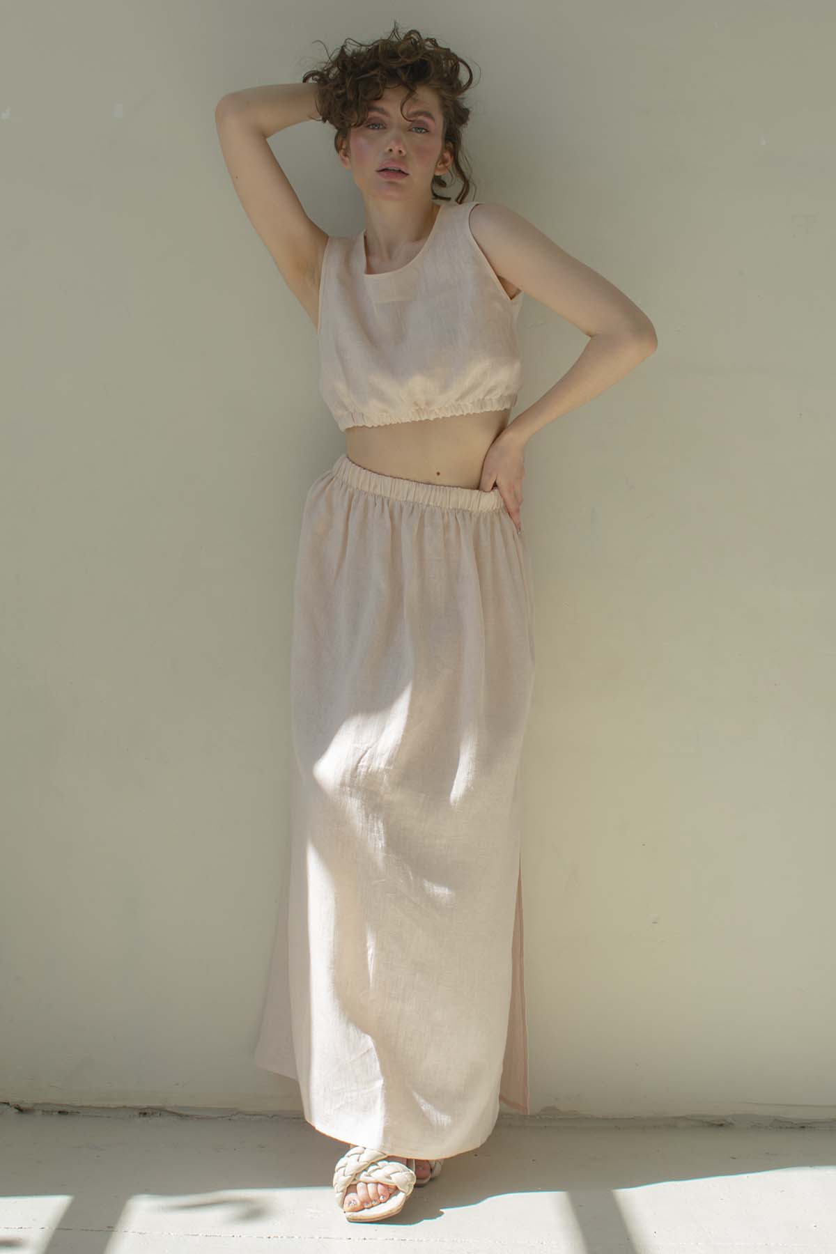 Описание: Стильный костюм с длинной юбкой из 100% умягченного льна. Юбка с высокой линией талии, немного расширяются от пояса с разрезом. Она прекрасна подчёркнет особенности женской фигуры. Топ укороченный свободного кроя на резинке. Для кроя костюма используются качественные лекала и премиум ткань, что опеспечивает ровную посадку по фигуре, удобство и практичность в уходе и долгую носку.