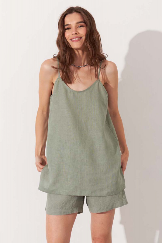 Льняной топ классического кроя на тонких бретелях, светло-зеленого цвета. Топ немного расклешен расклешен к низу, по бокам разрезы, посадка свободная. Модель выполнена из 100% льна высокого качества. онкий длинноволокнистый лен особенно прочный, отлично пропускает воздух и впитывает влагу, что делает его идеальным выбором для гардероба. Сделано в России на собственном производстве.