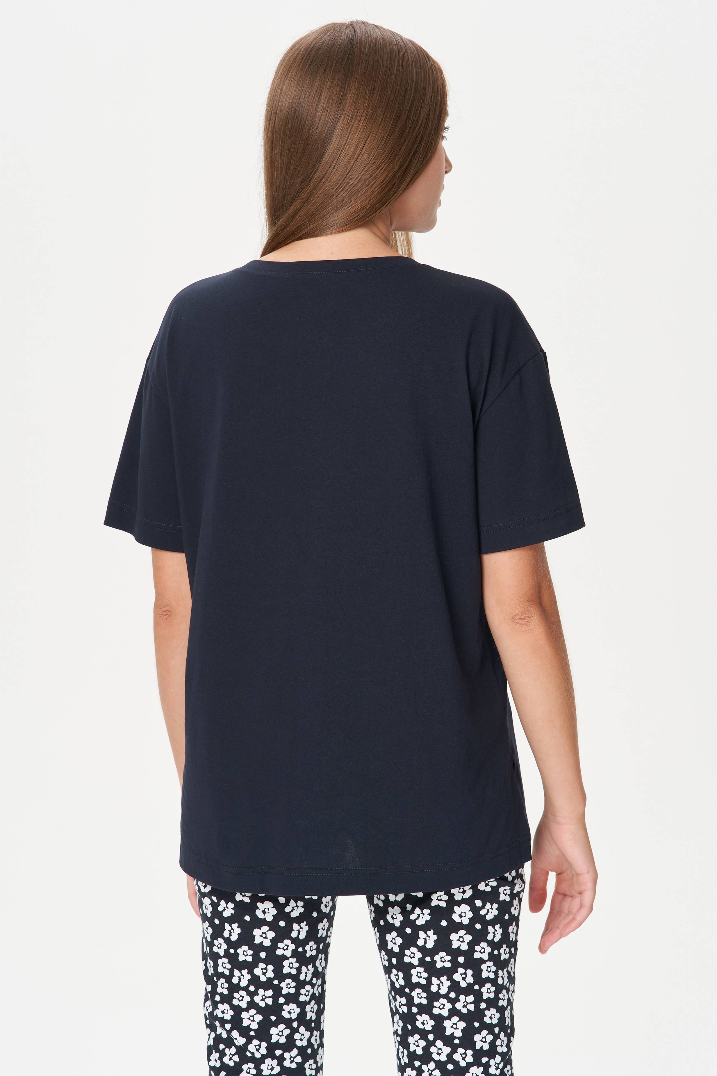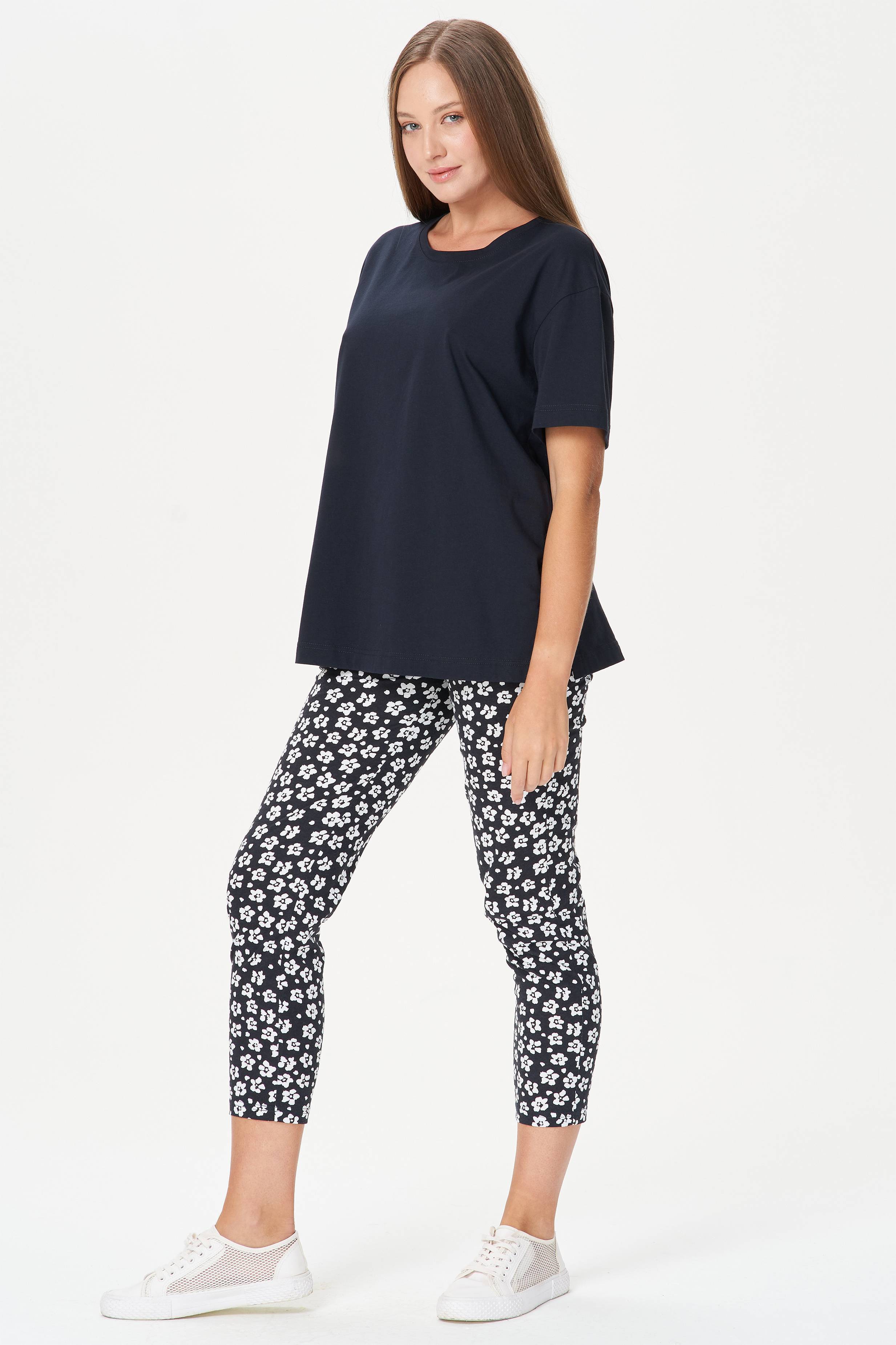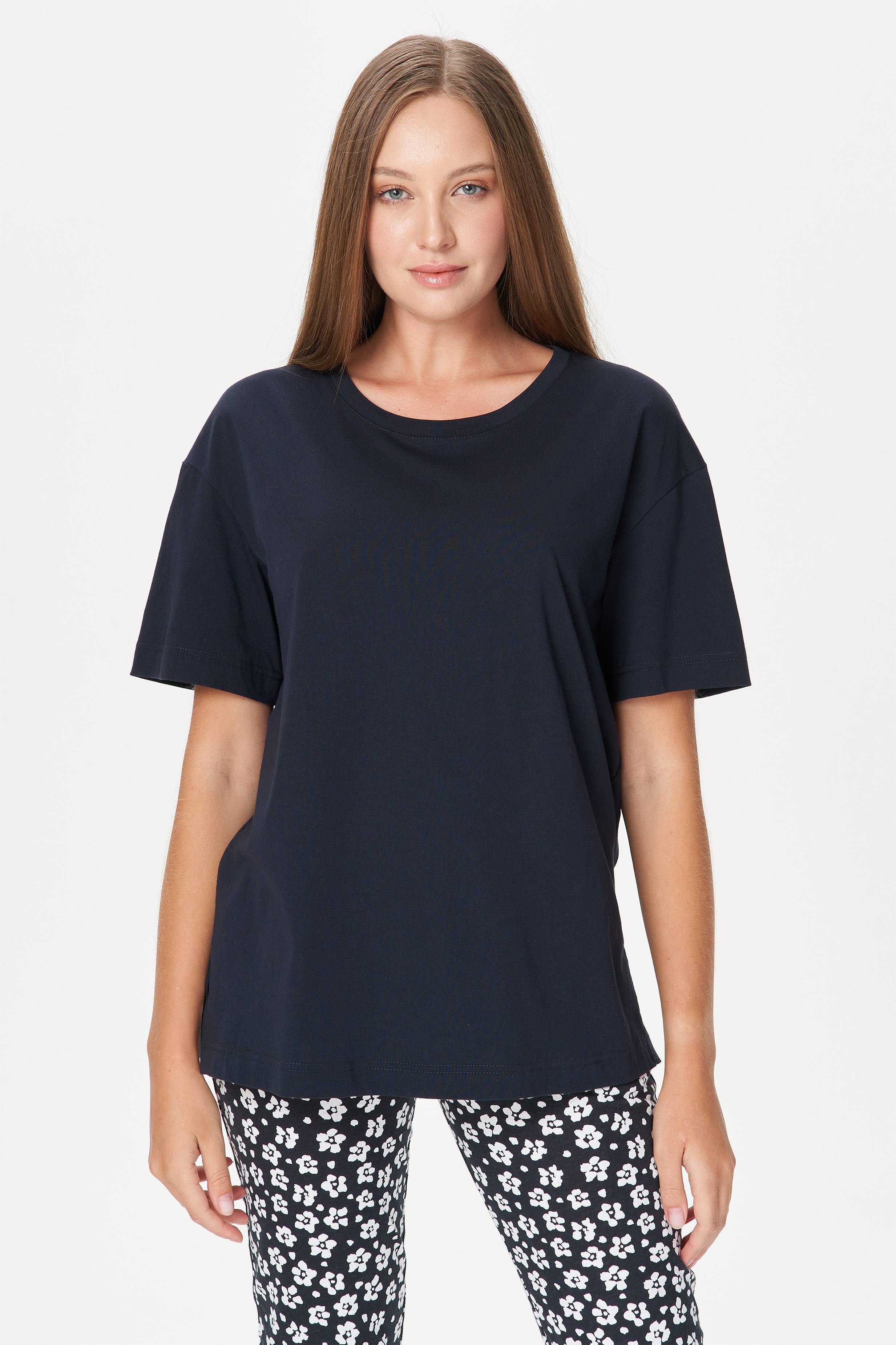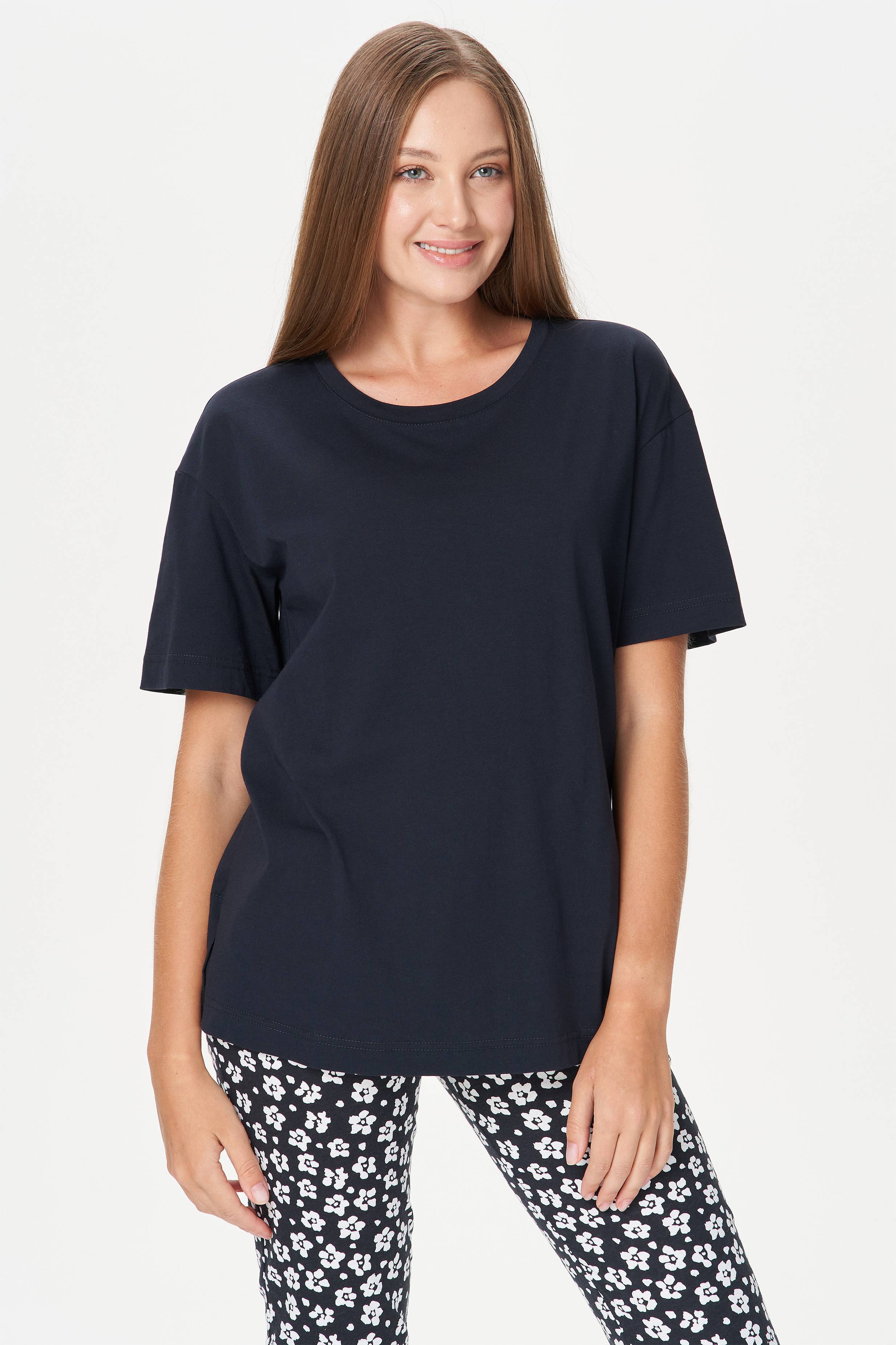 Описание: Удлиненная футболка свободного силуэта из хлопкового трикотажного полотна. Круглый вырез горловины, широкие рукава, по низу изделия в боковых швах разрезы. Рост модели на фото 175.