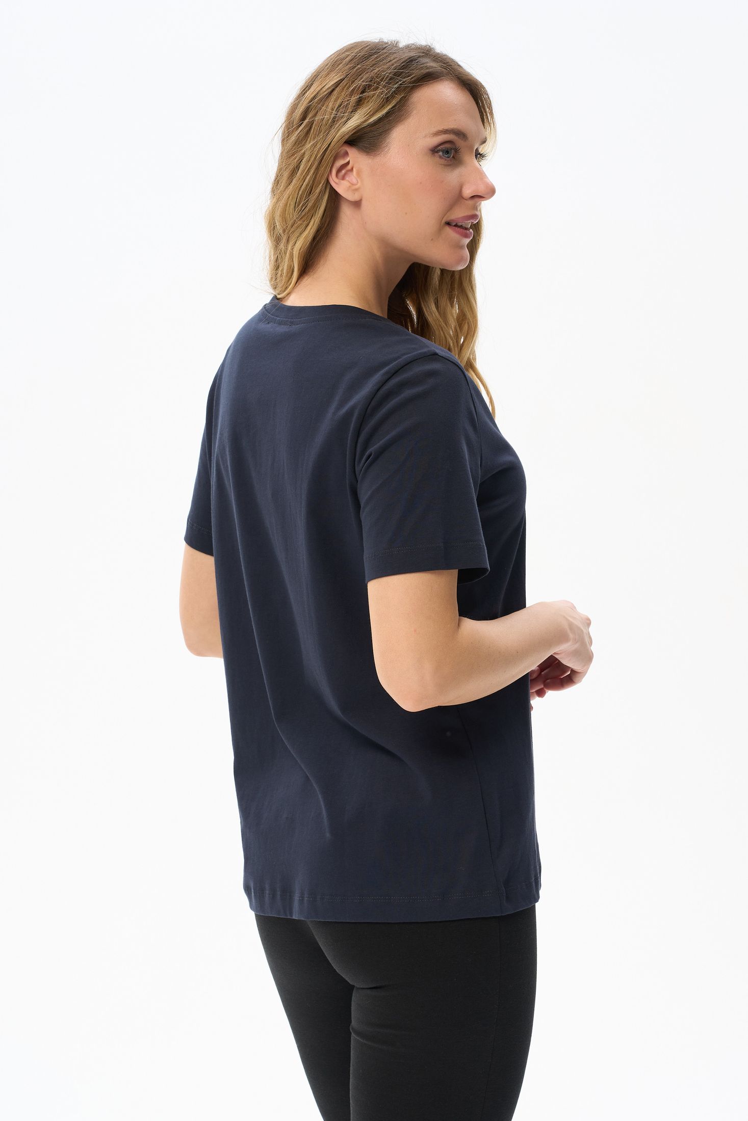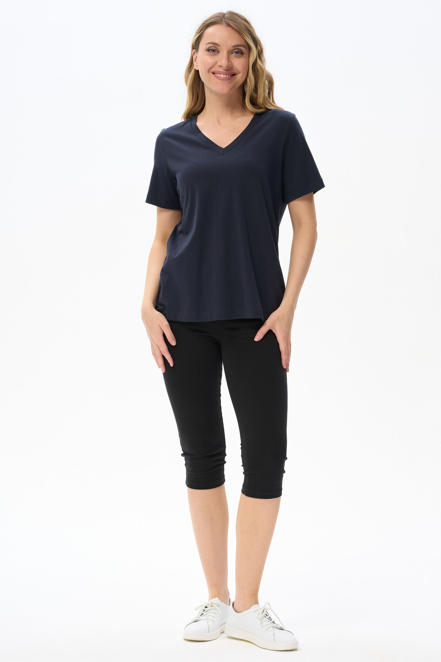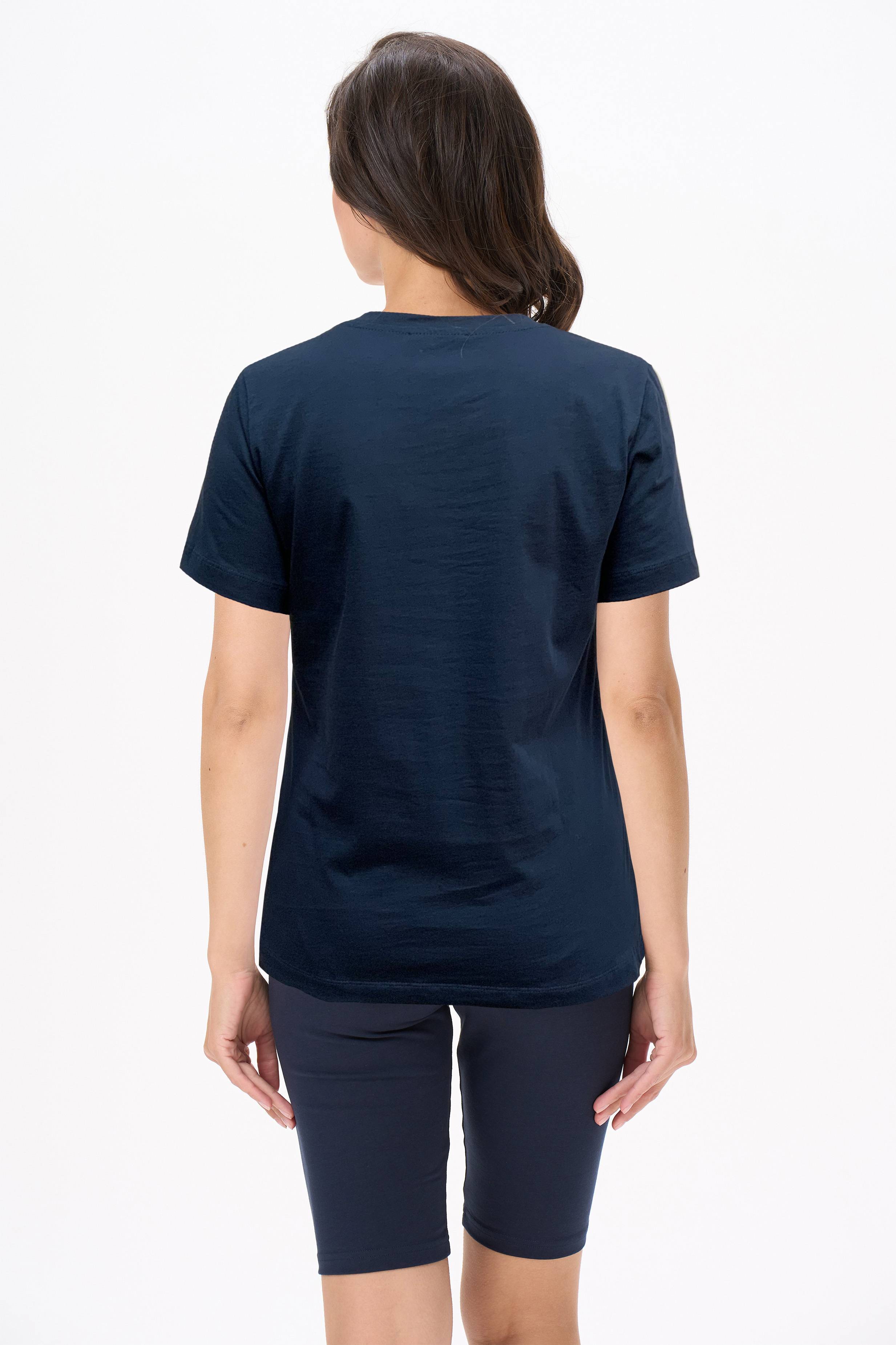 Описание: Футболка выполнена из хлопкового полотна. V-образный вырез горловины, короткие рукава. Рост модели на фото 170