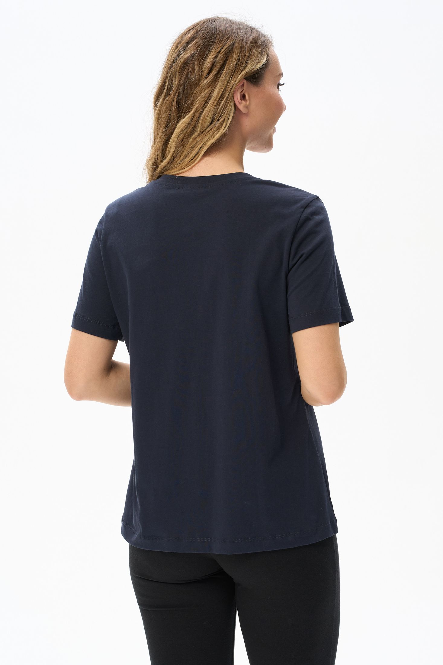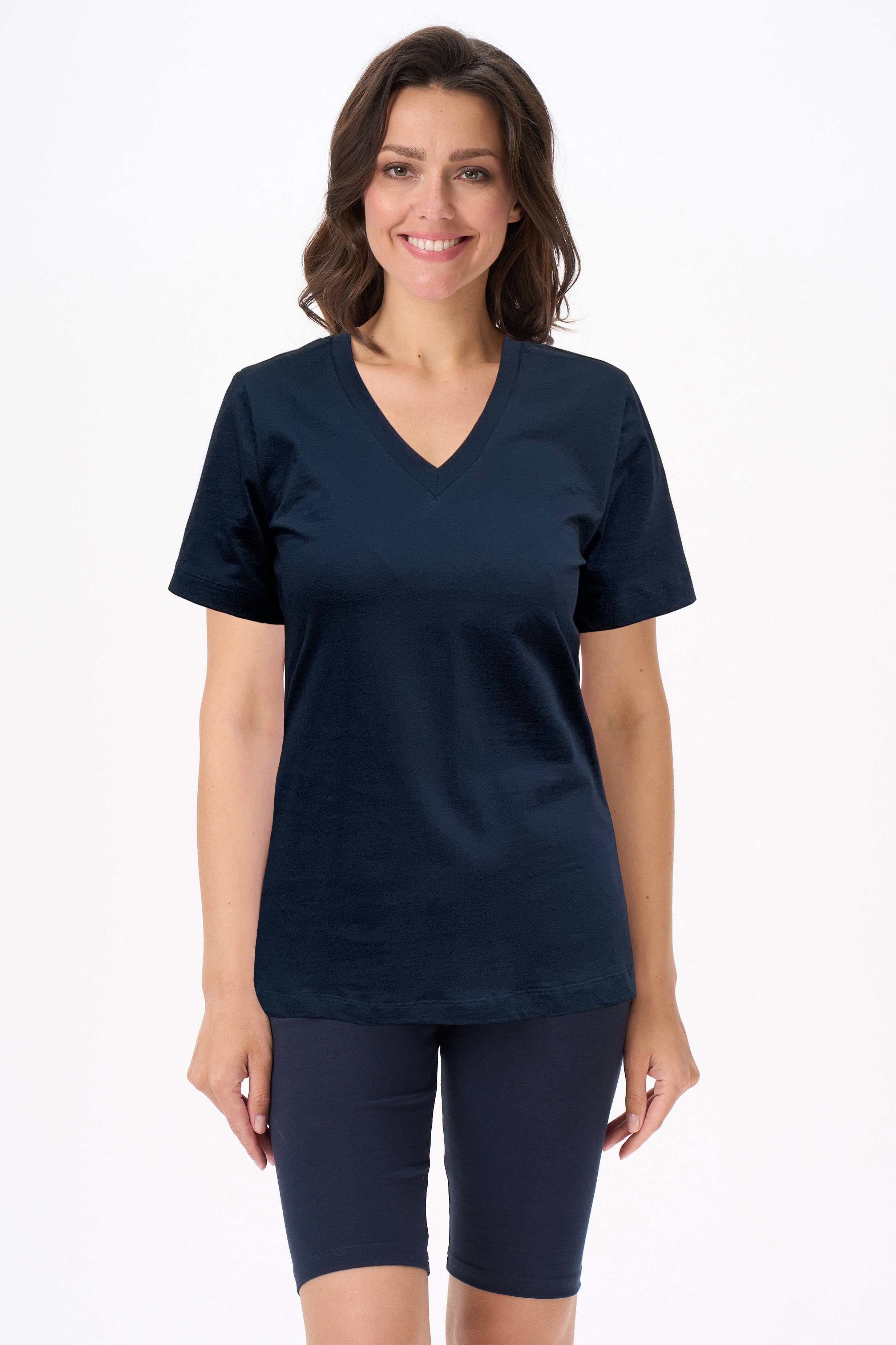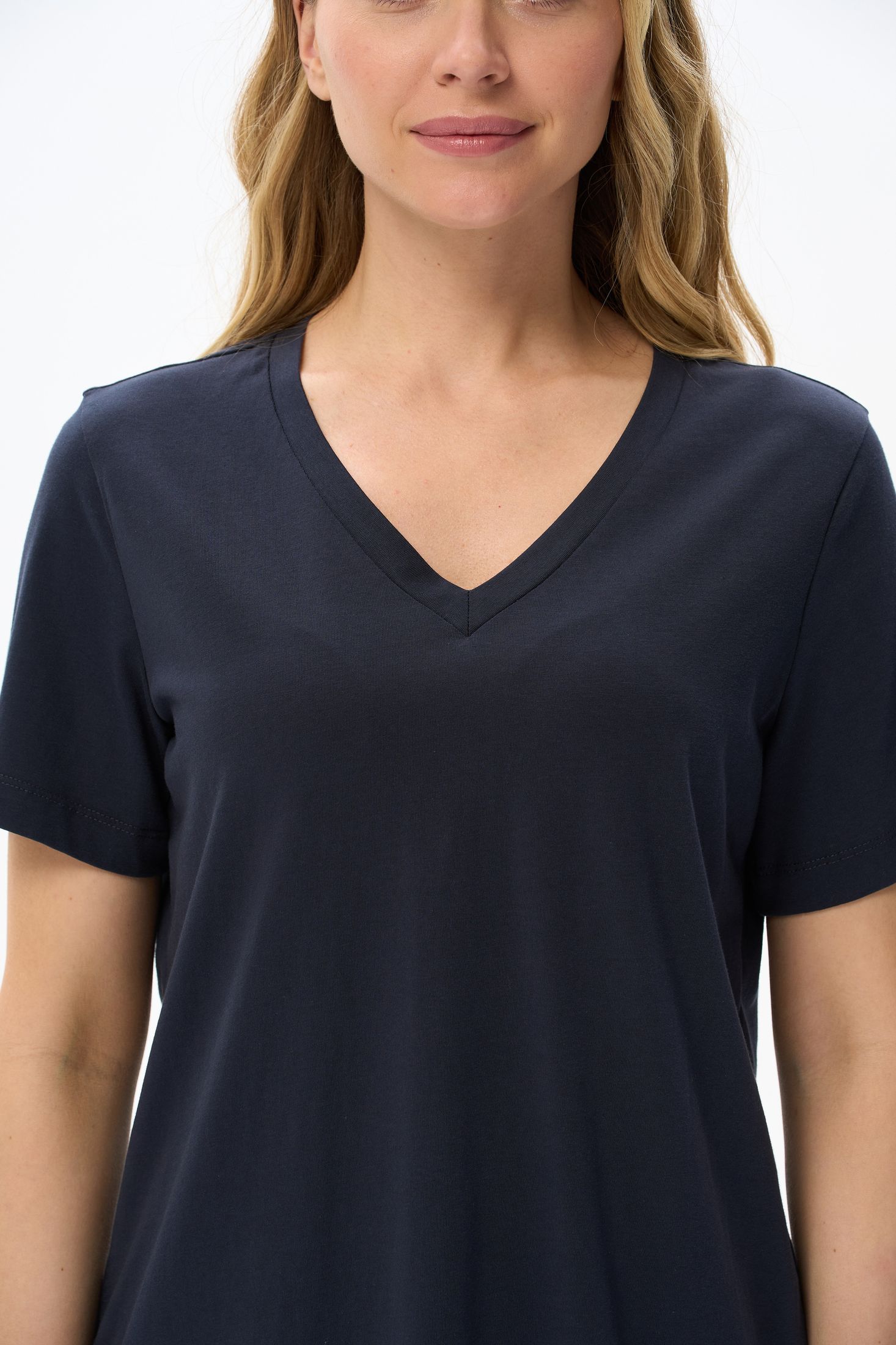 Описание: Футболка выполнена из хлопкового полотна. V-образный вырез горловины, короткие рукава. Рост модели на фото 170