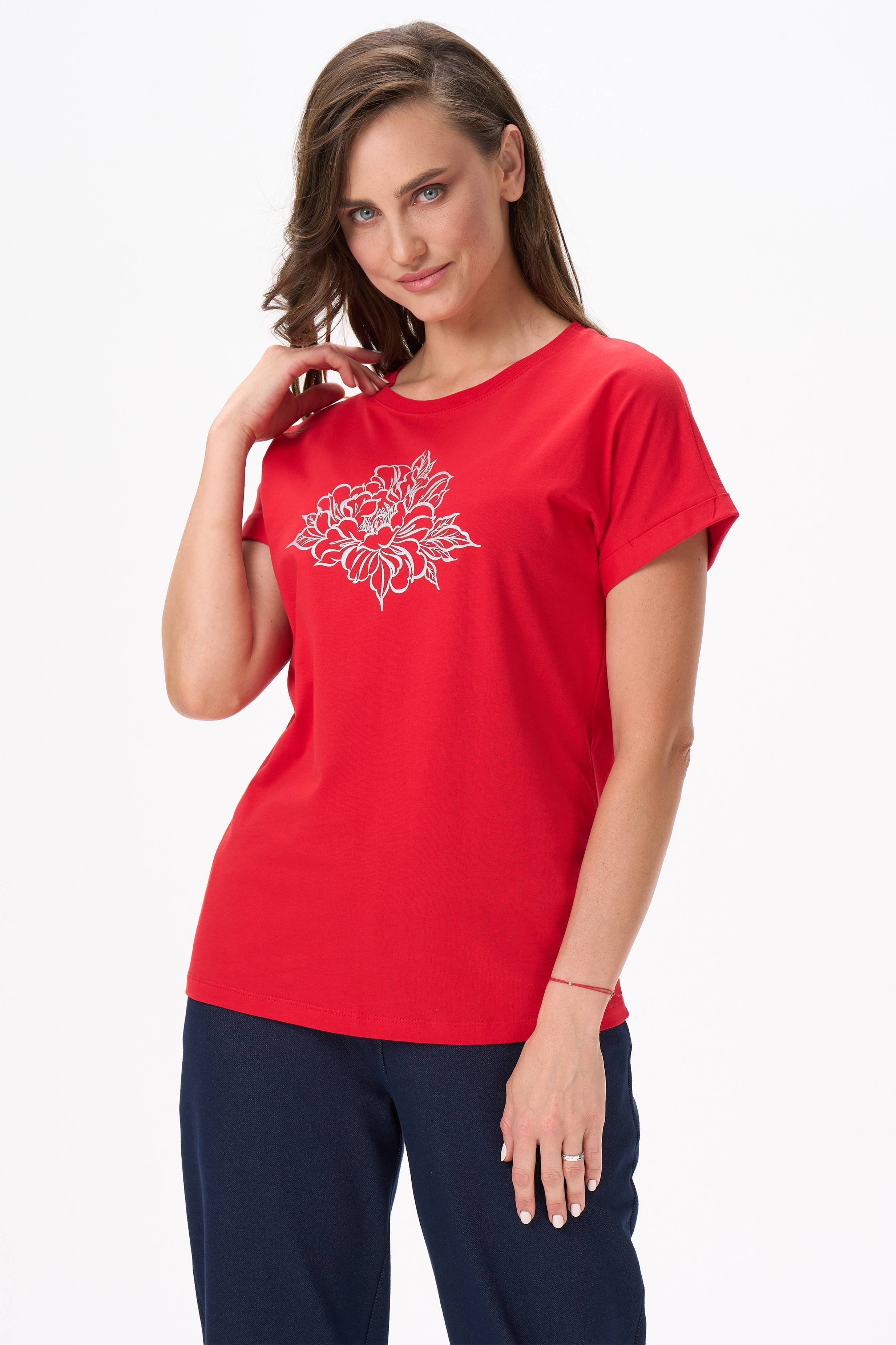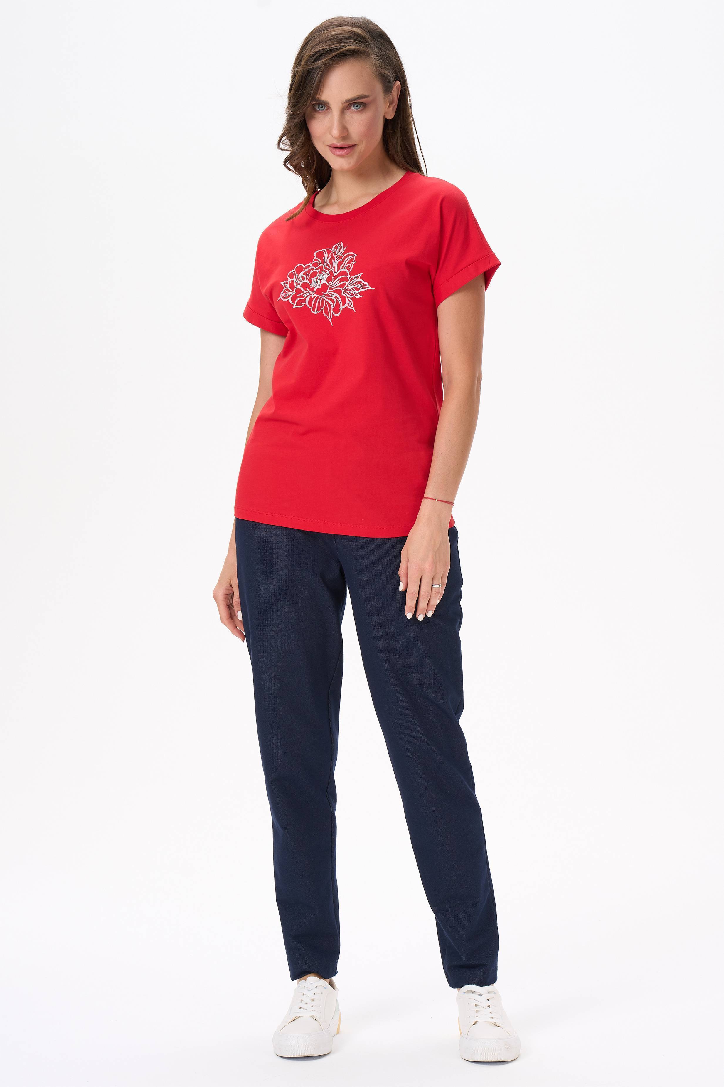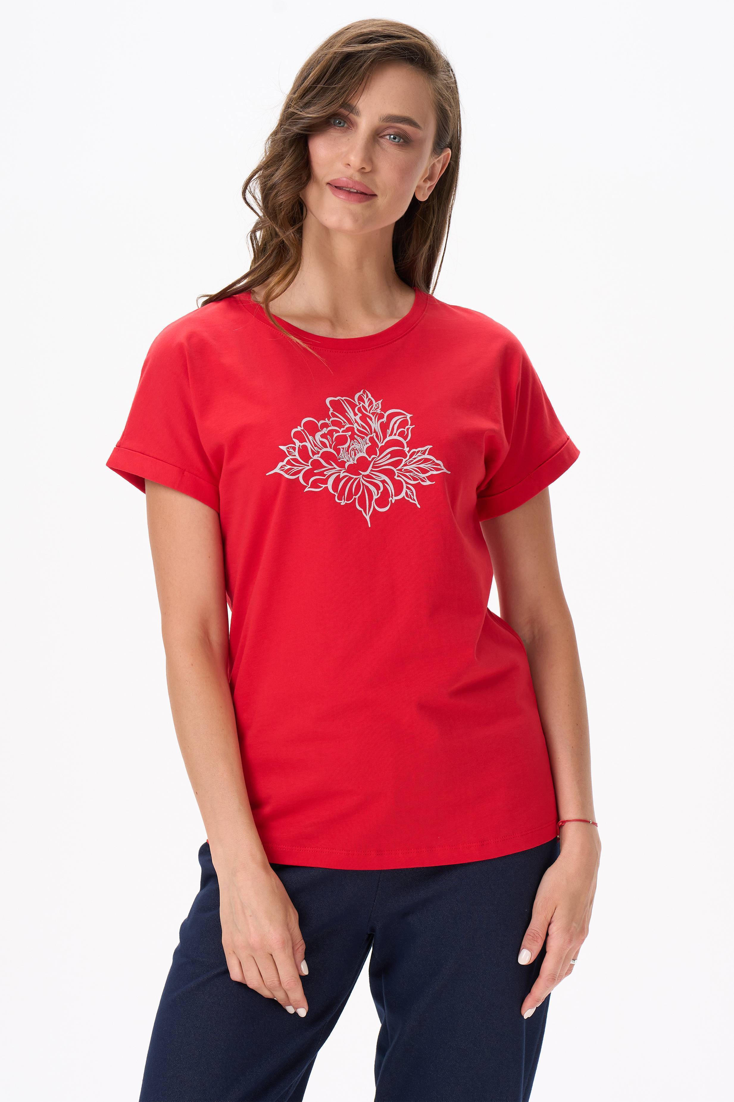Описание: Футболка с принтом из хлопкового полотна качества пенье. Модель с круглым вырезом горловины и цельнокроеным коротким рукавом с отворотами. Рост модели на фото 177