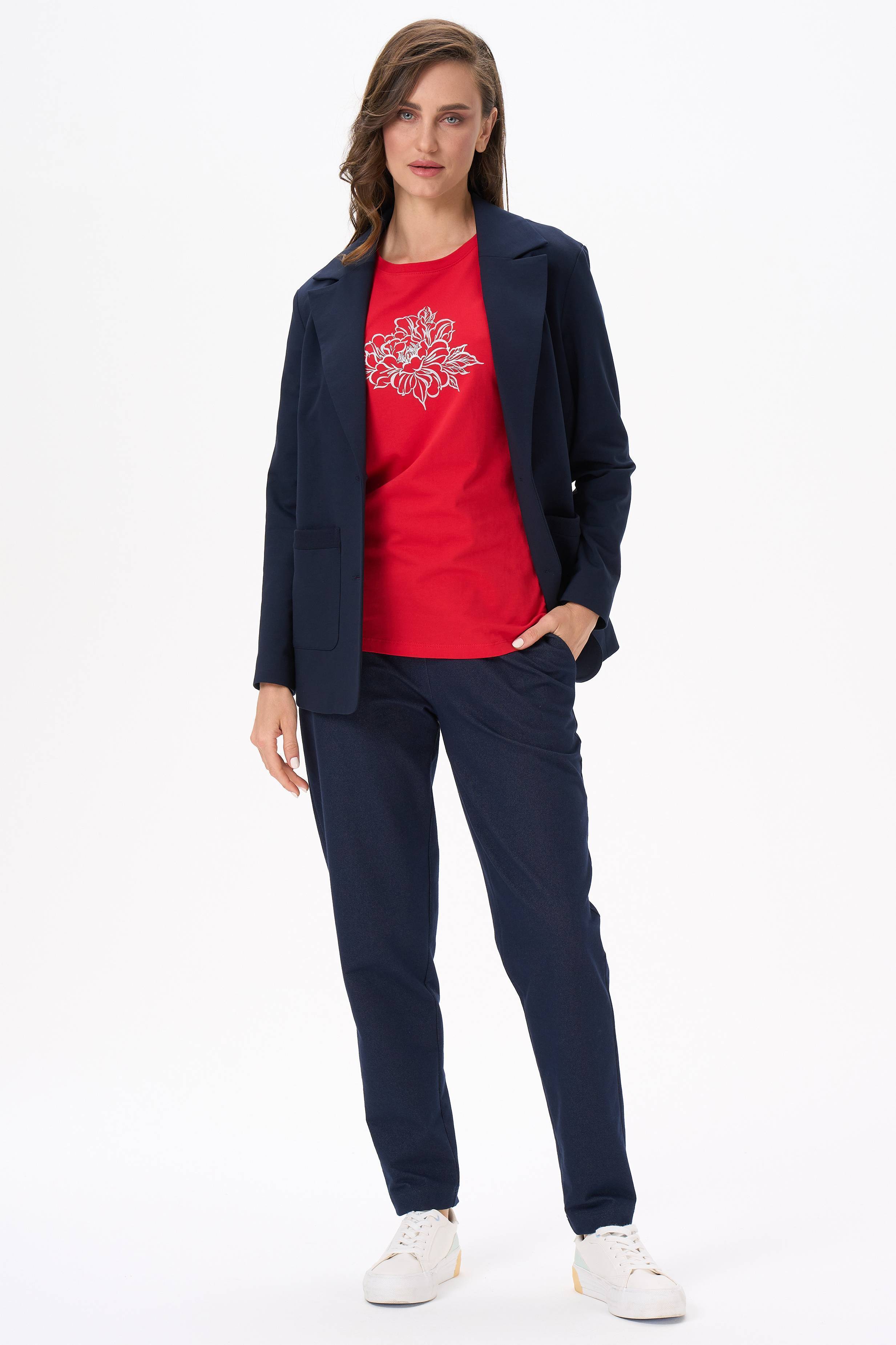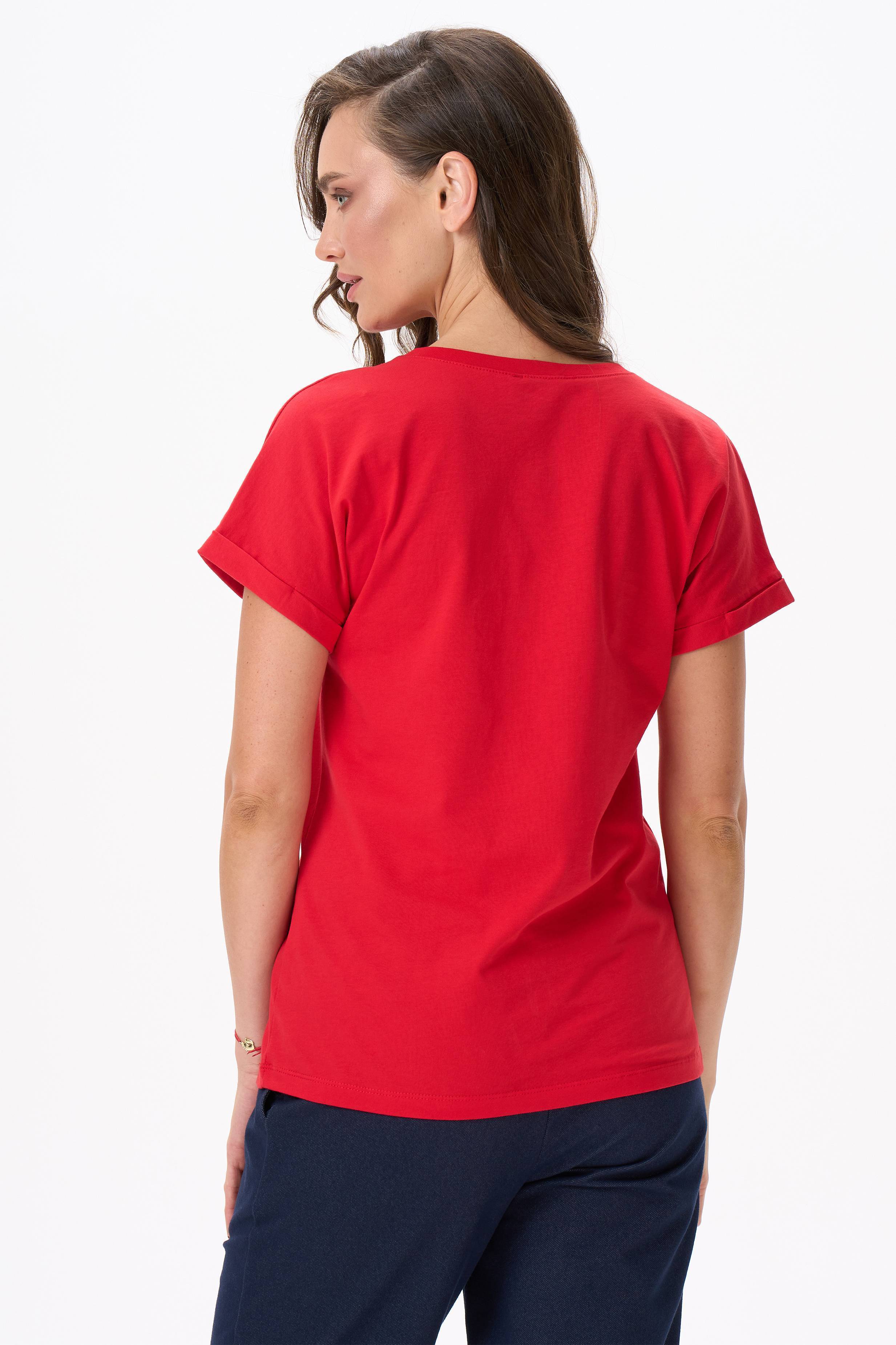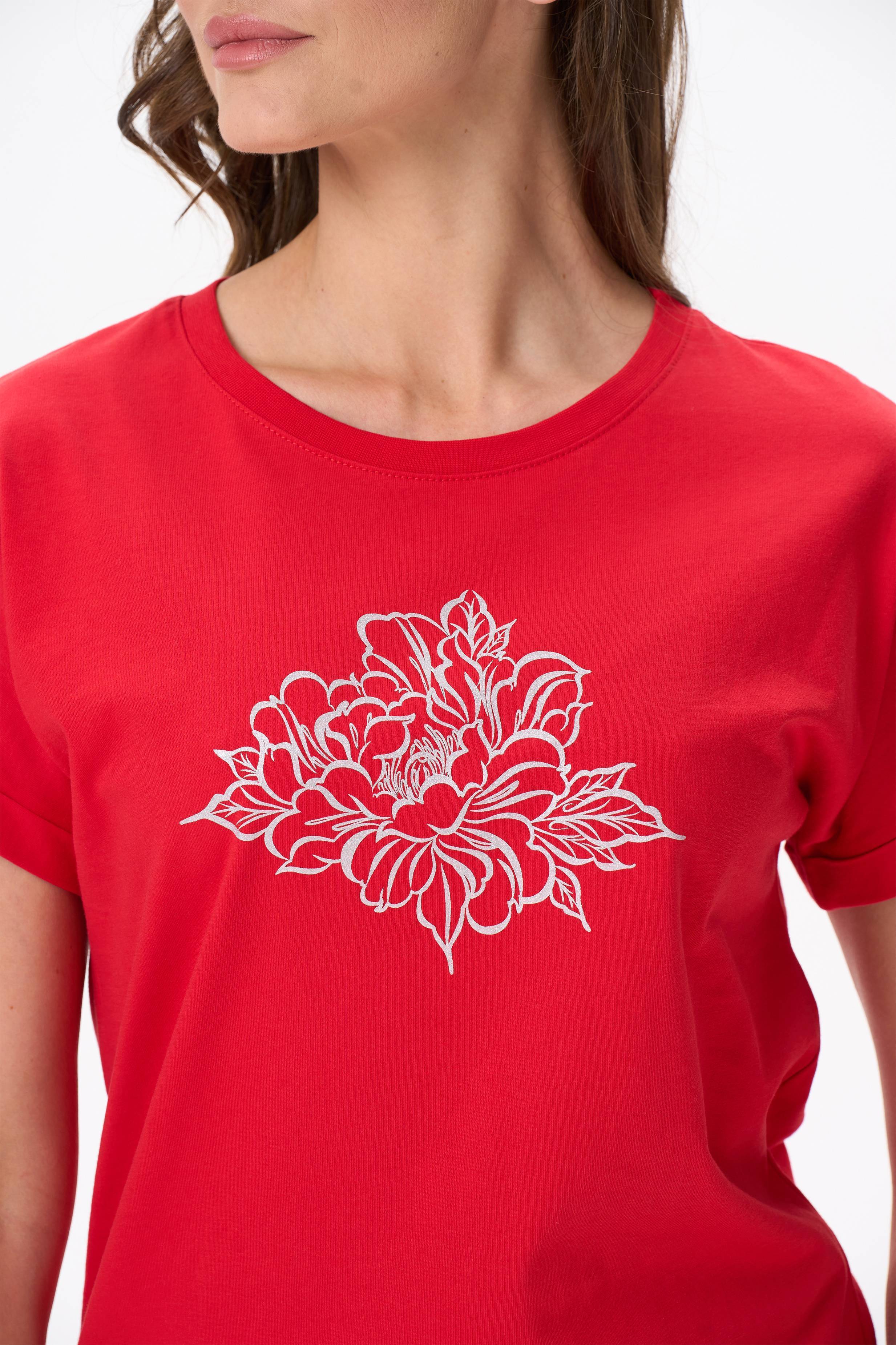 Описание: Футболка с принтом из хлопкового полотна качества пенье. Модель с круглым вырезом горловины и цельнокроеным коротким рукавом с отворотами. Рост модели на фото 177