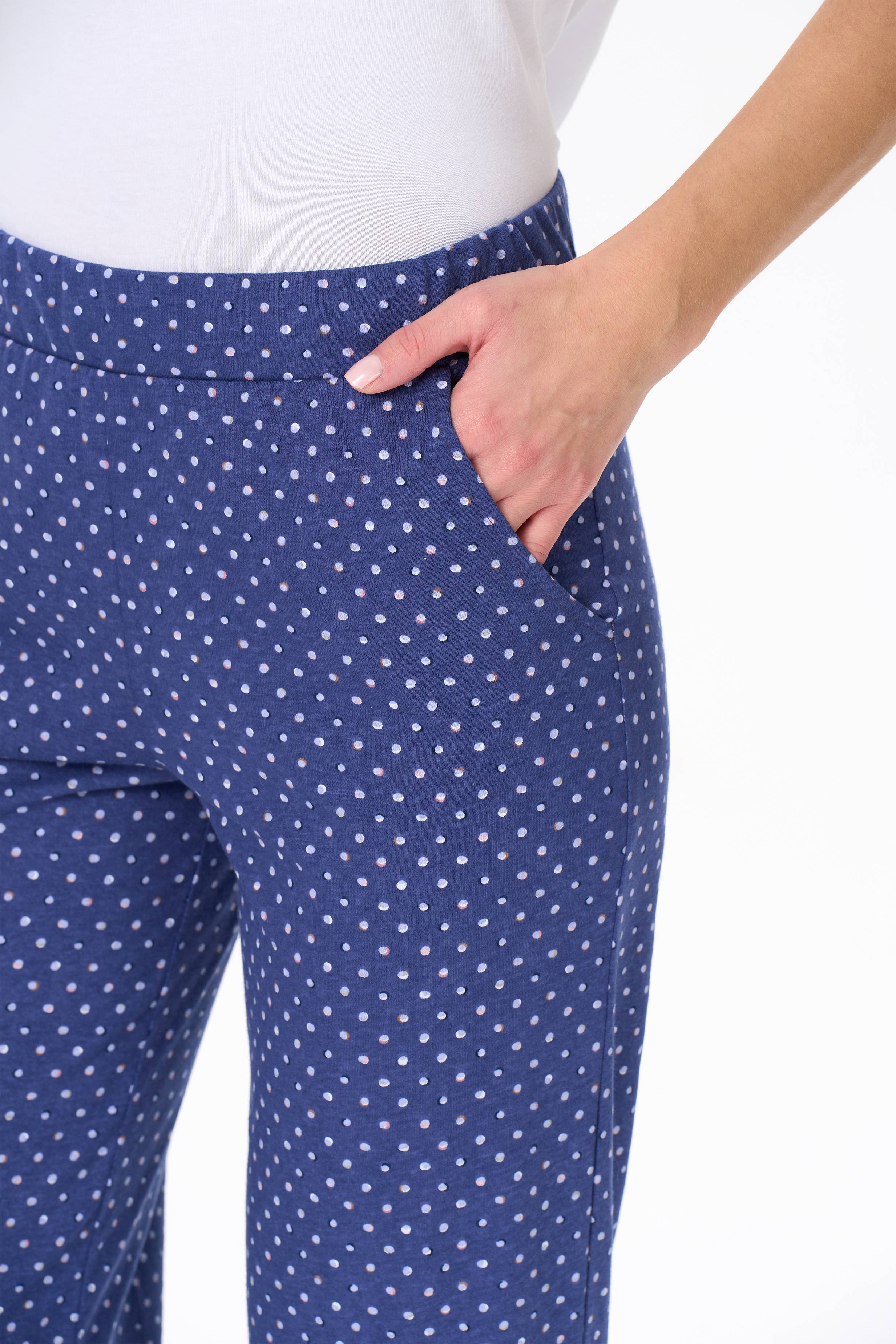 Описание: Универсальные брюки, длиной 7/8 из хлопкового полотна. Пояс с эластичной лентой, два фигурных боковых кармана. Рост модели на фото 177.
