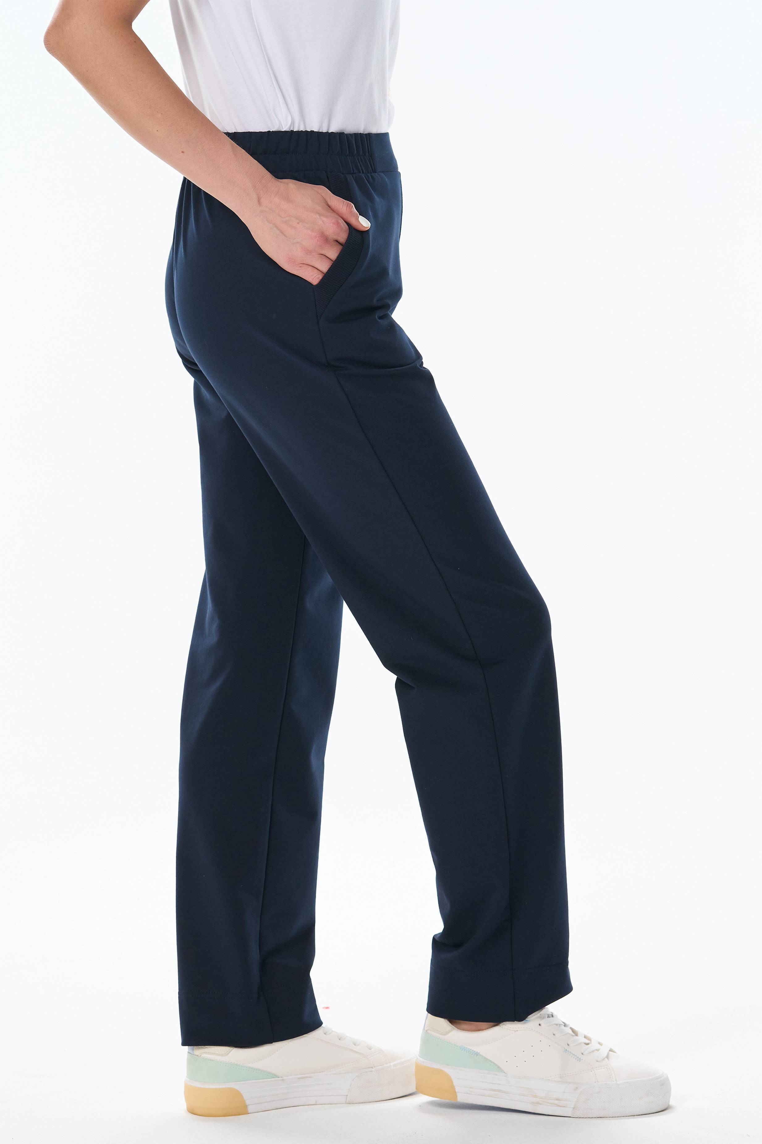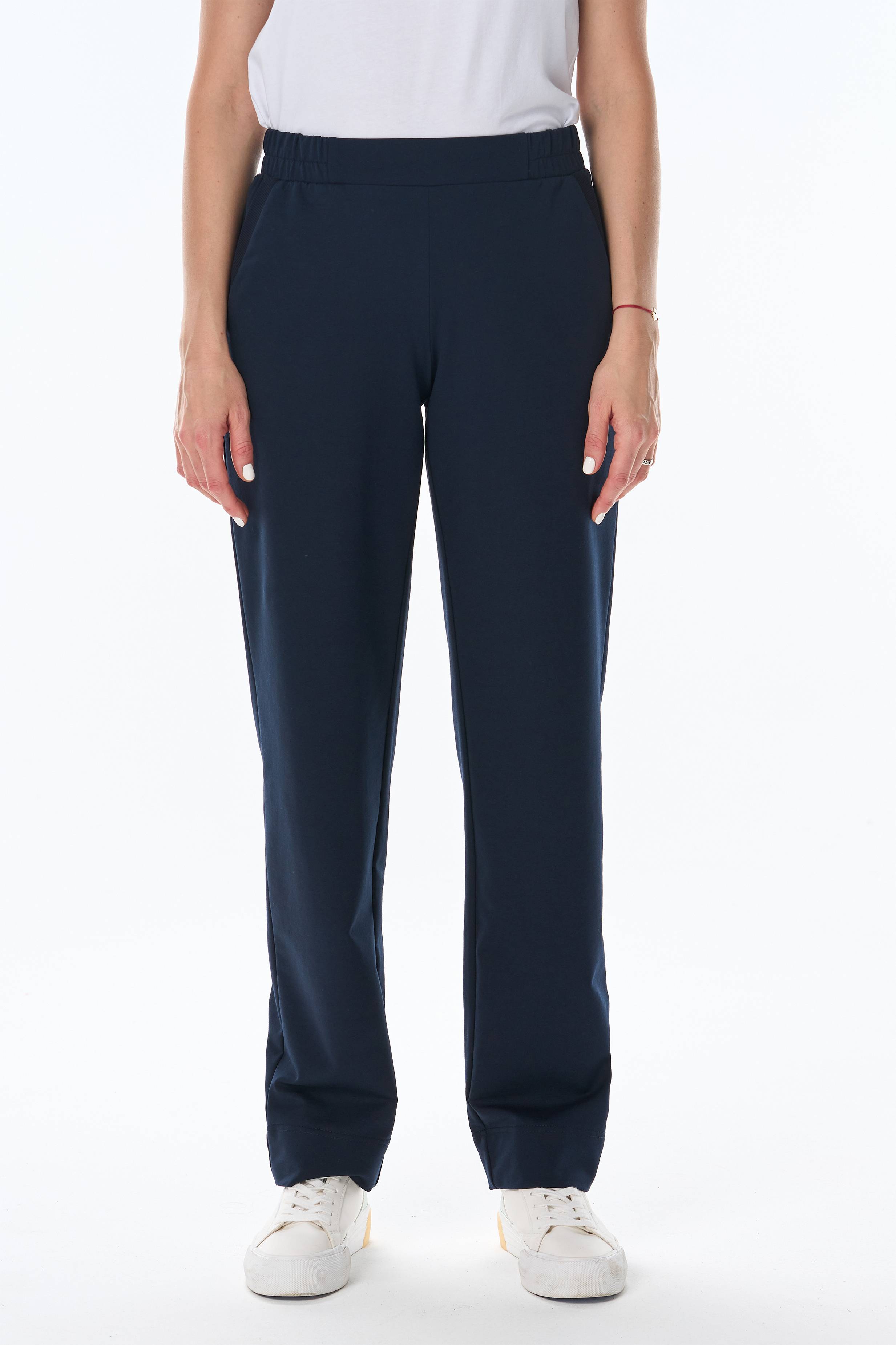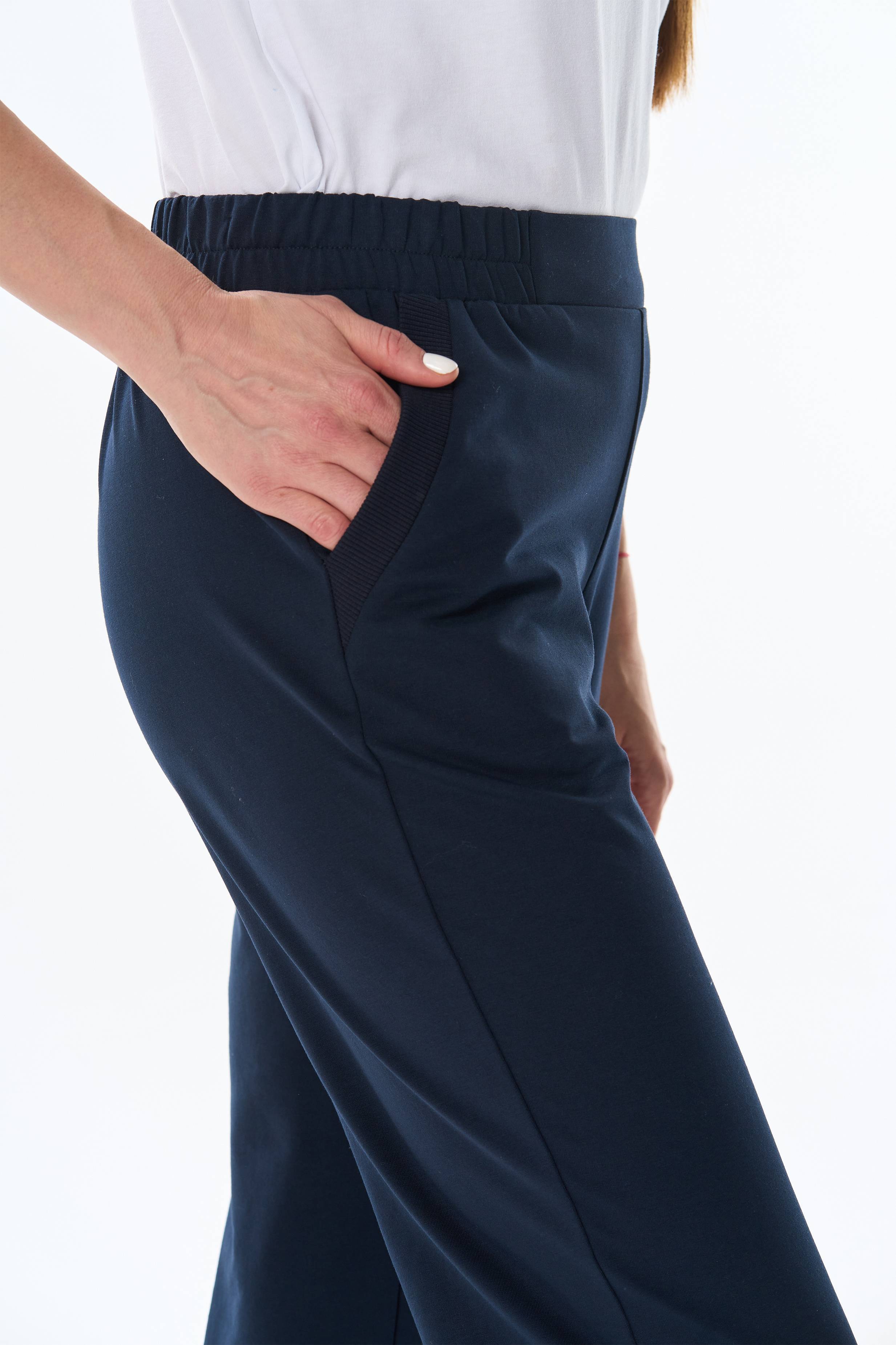 Описание: Повседневные, прямые брюки с карманами из хлопкового футера. Пояс с планкой и эластичной лентой внутри. Фигурный вход в карман оформлен кашкорсе. Длина брюк по боковому шву (без пояса) в 44 размере - 100см. Рост модели на фото 170