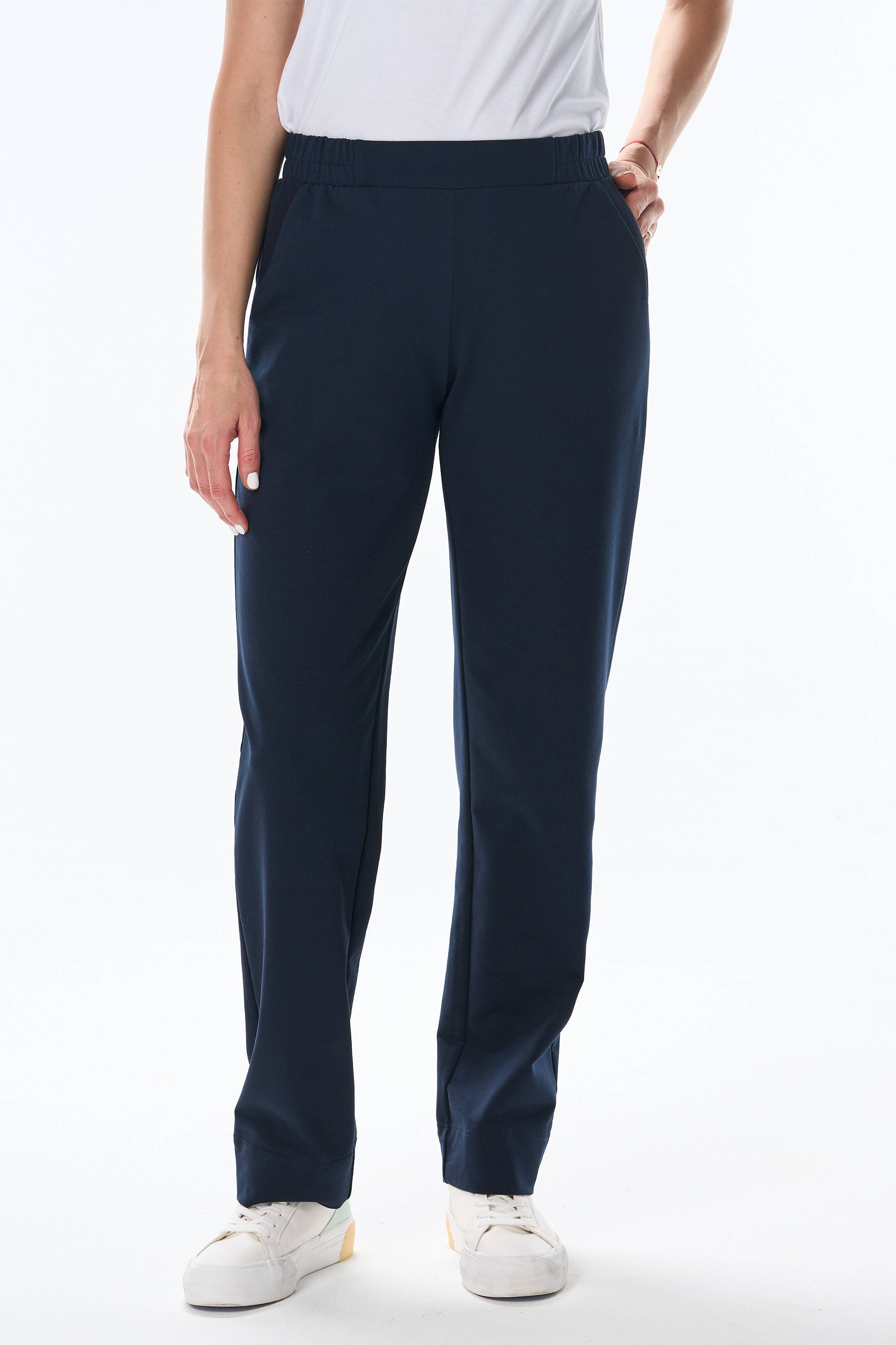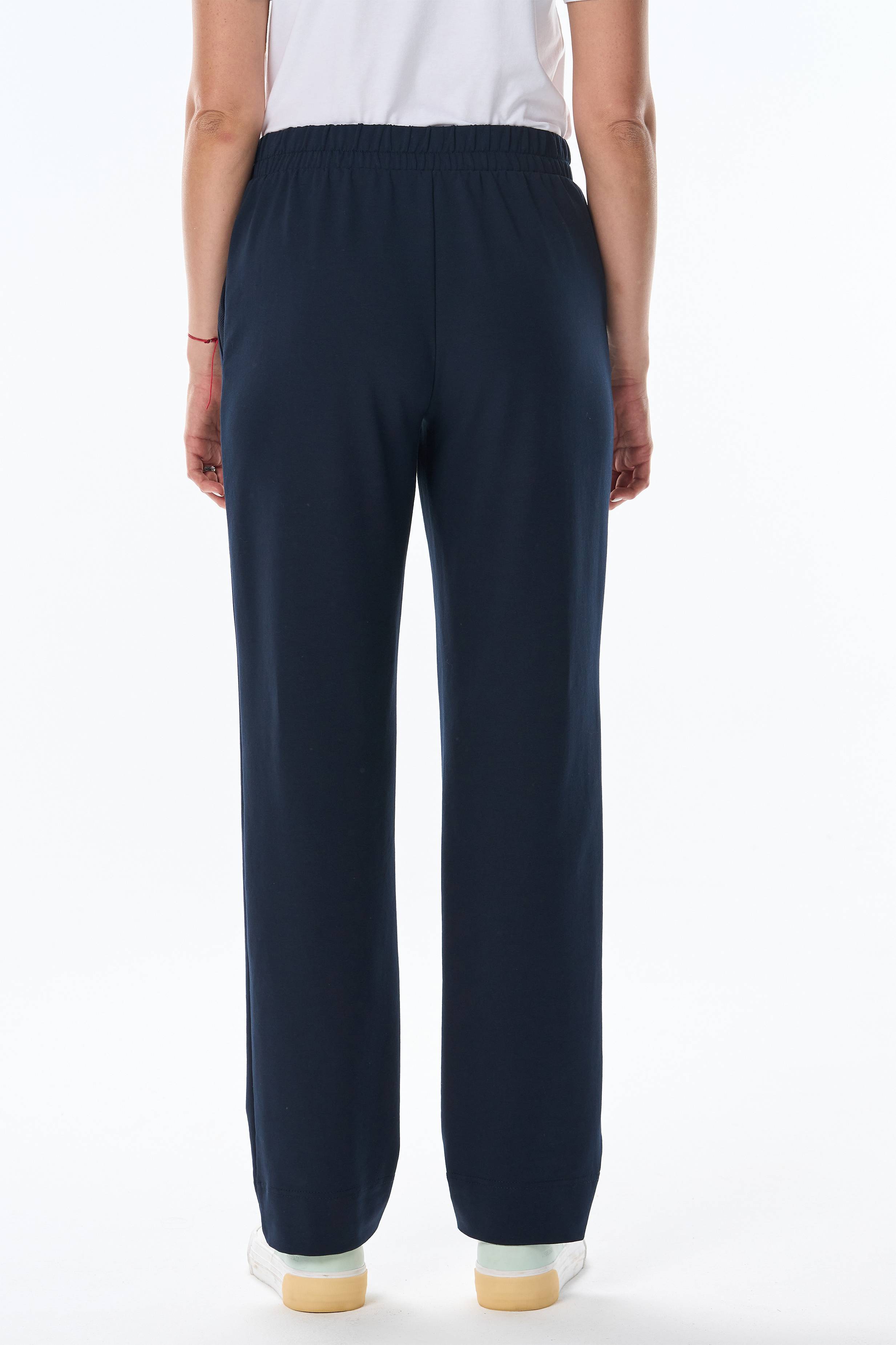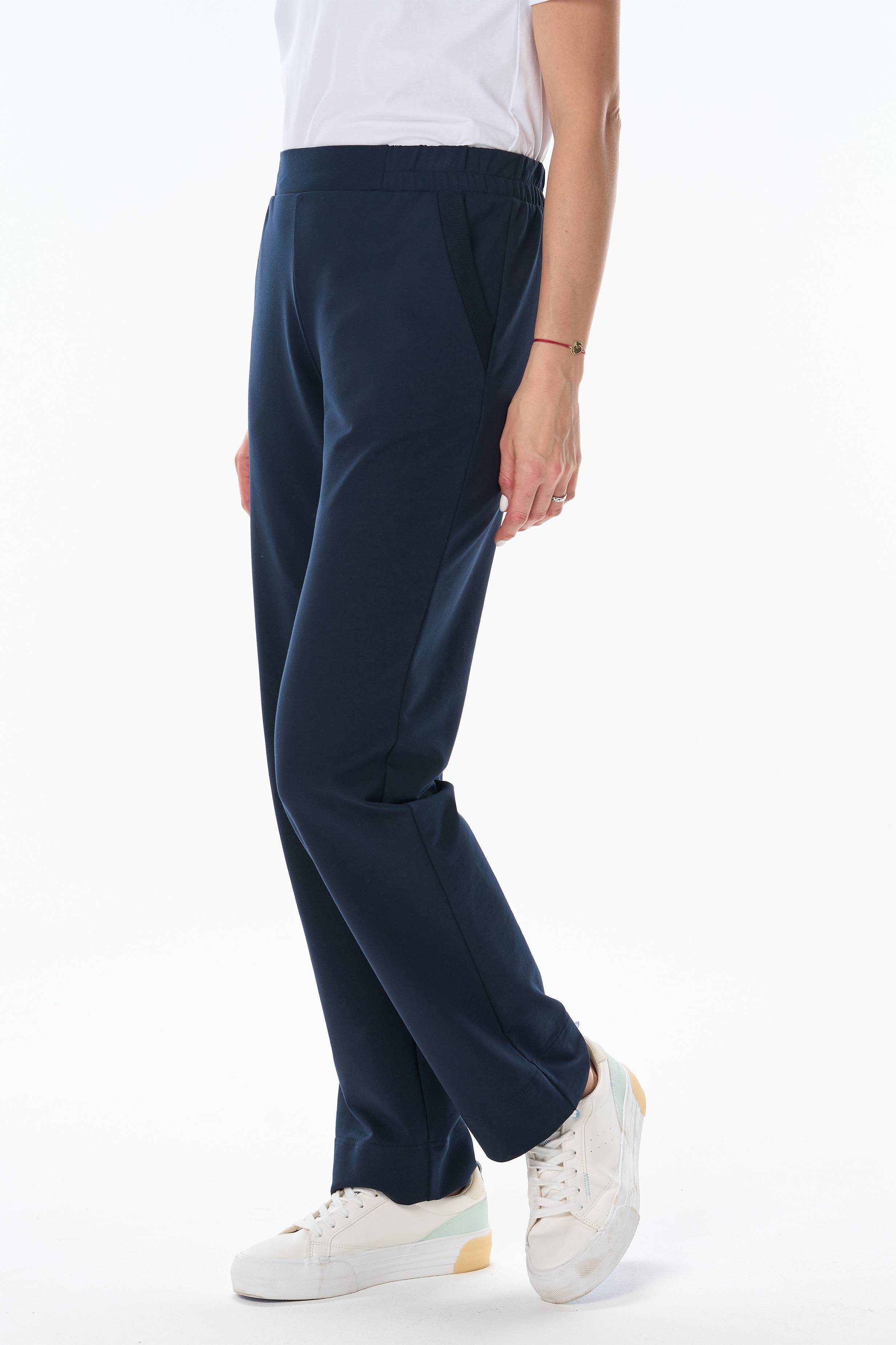 Описание: Повседневные, прямые брюки с карманами из хлопкового футера. Пояс с планкой и эластичной лентой внутри. Фигурный вход в карман оформлен кашкорсе. Длина брюк по боковому шву (без пояса) в 44 размере - 100см. Рост модели на фото 170