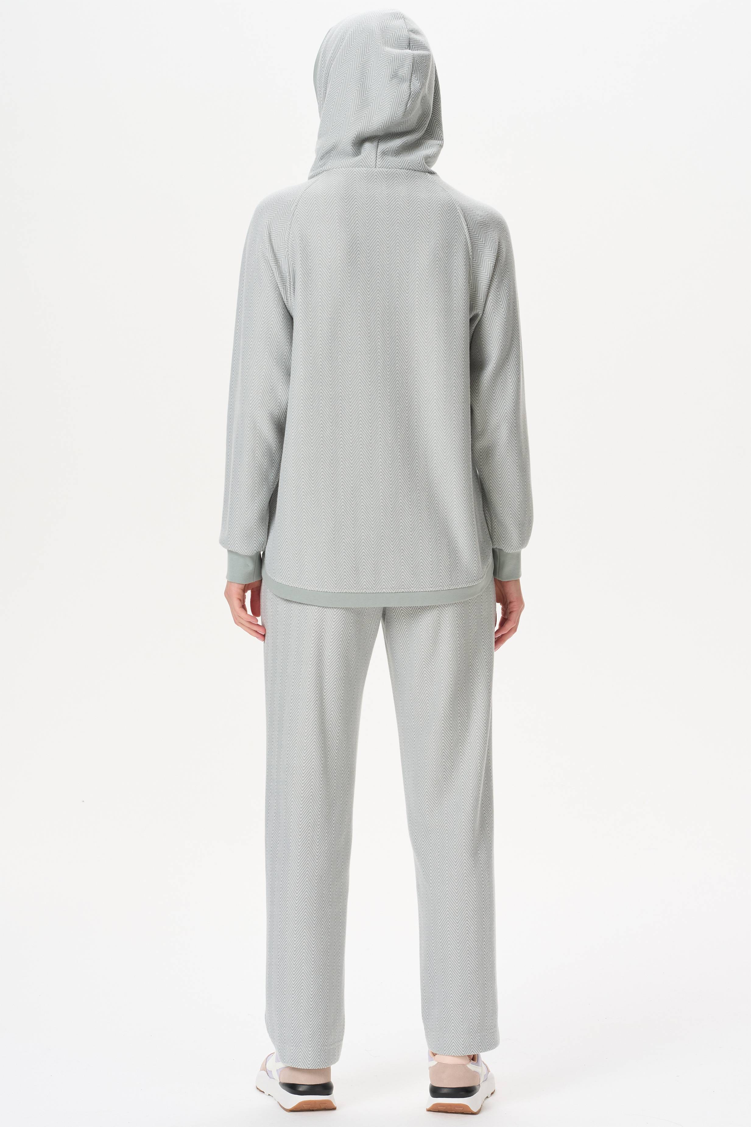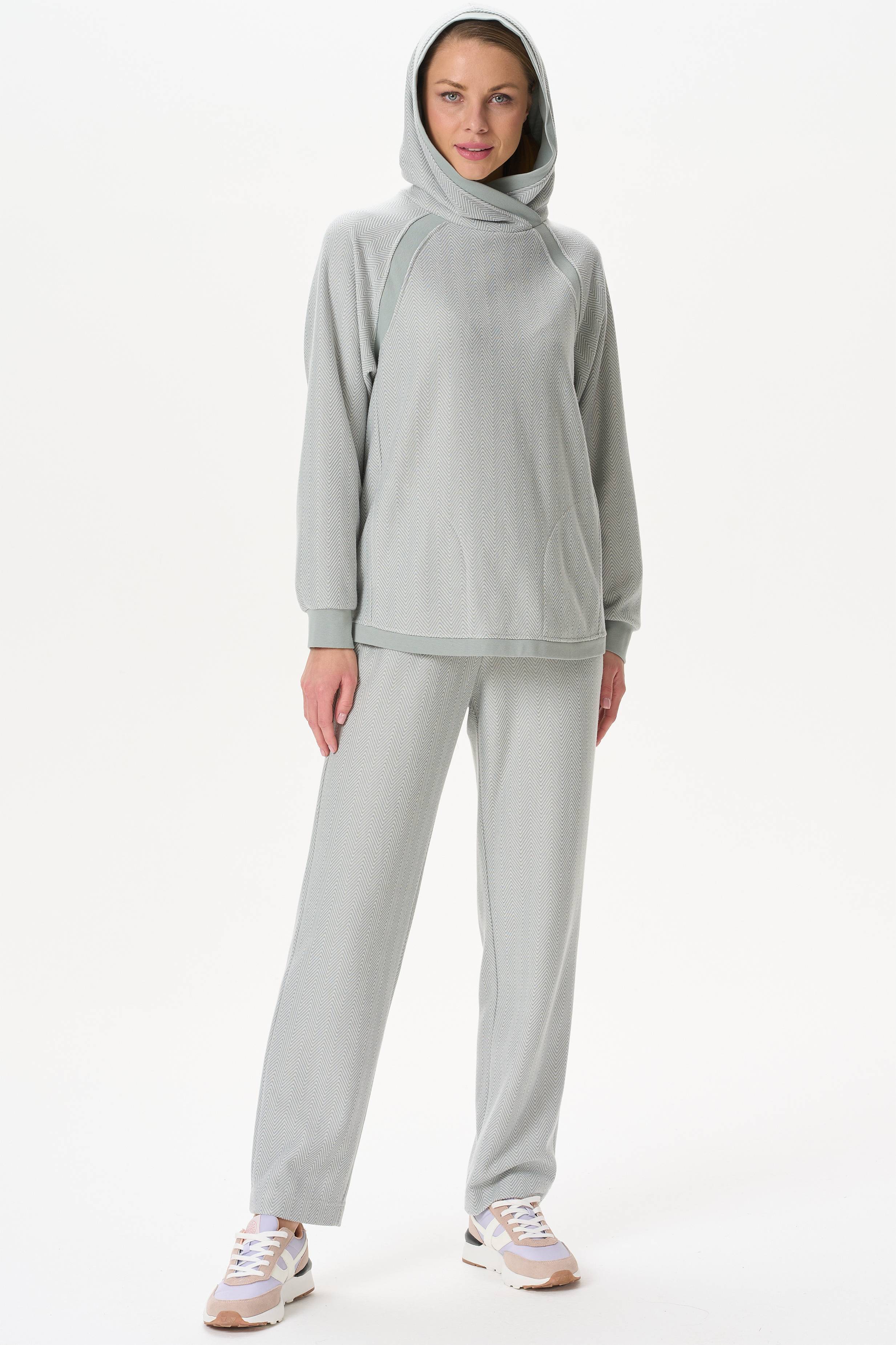 Описание: Комплект из хлопкового жаккардового полотна. Джемпер с длиной закрывающей бедра. Капюшон, рукава реглан, в рельефных швах карманы. Край капюшона, манжеты, фигурные вставки и линия низа выполнены из эластичного кашкорсе. Длинные прямые брюки с карманами. Пояс с эластичной лентой внутри. Рост модели на фото 177.