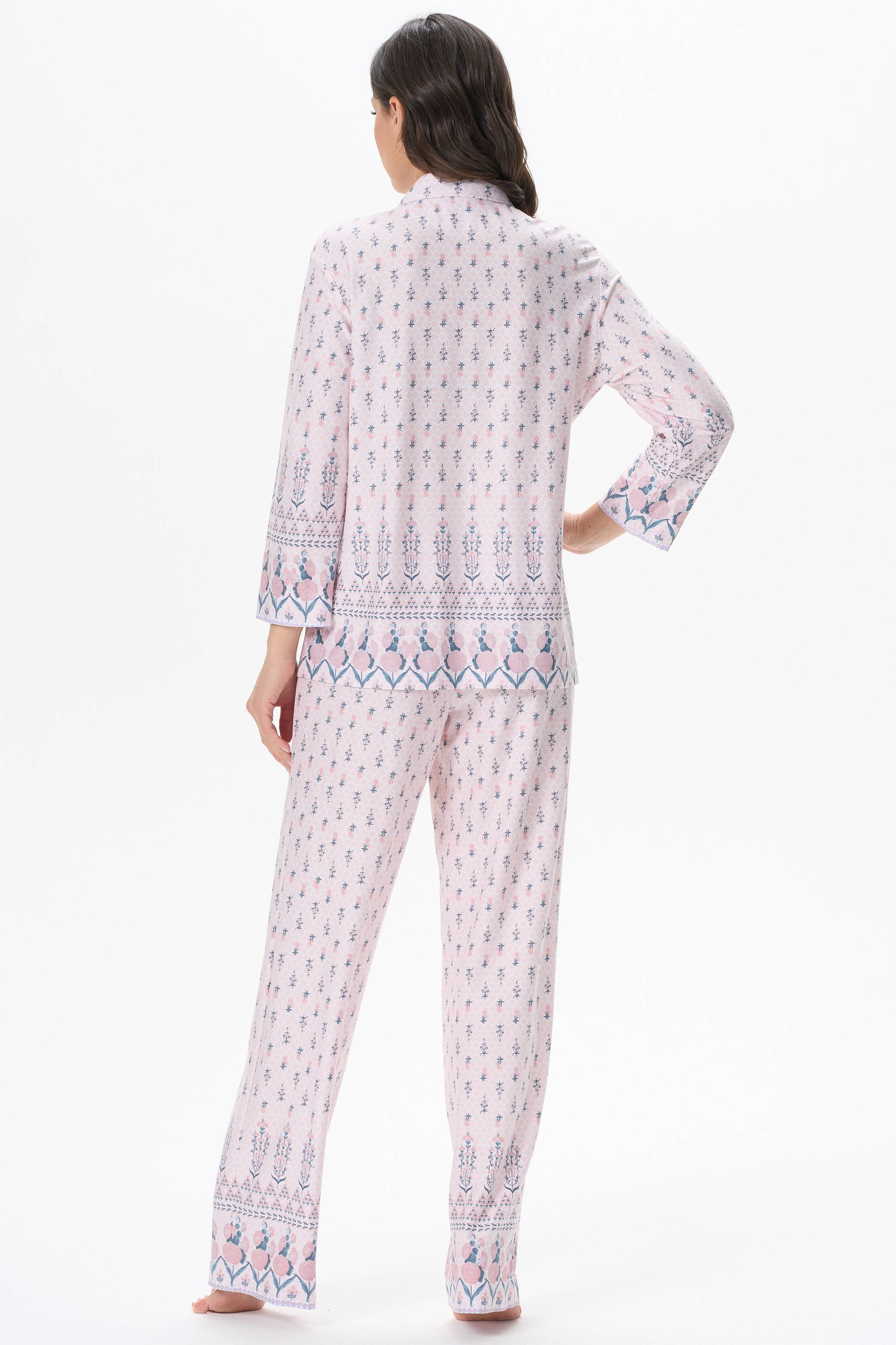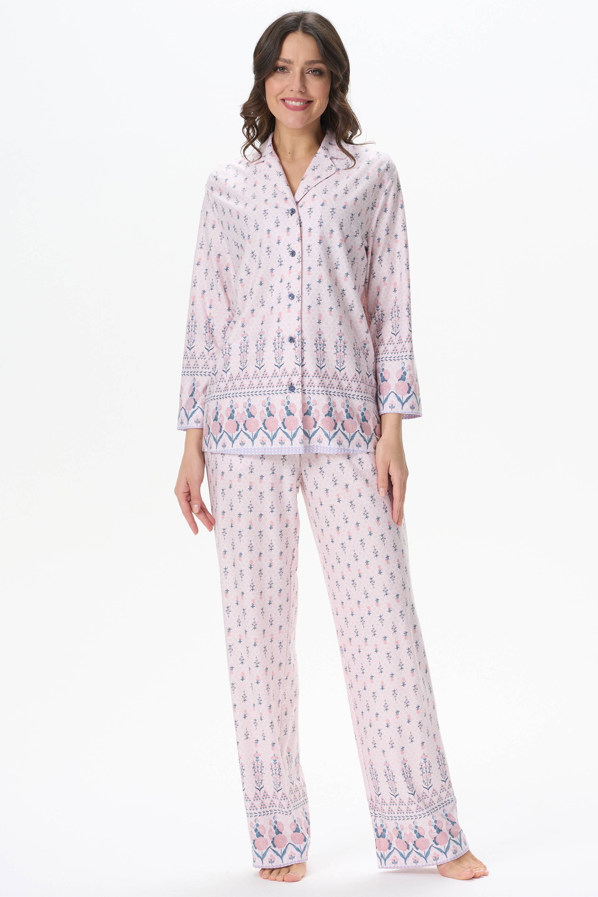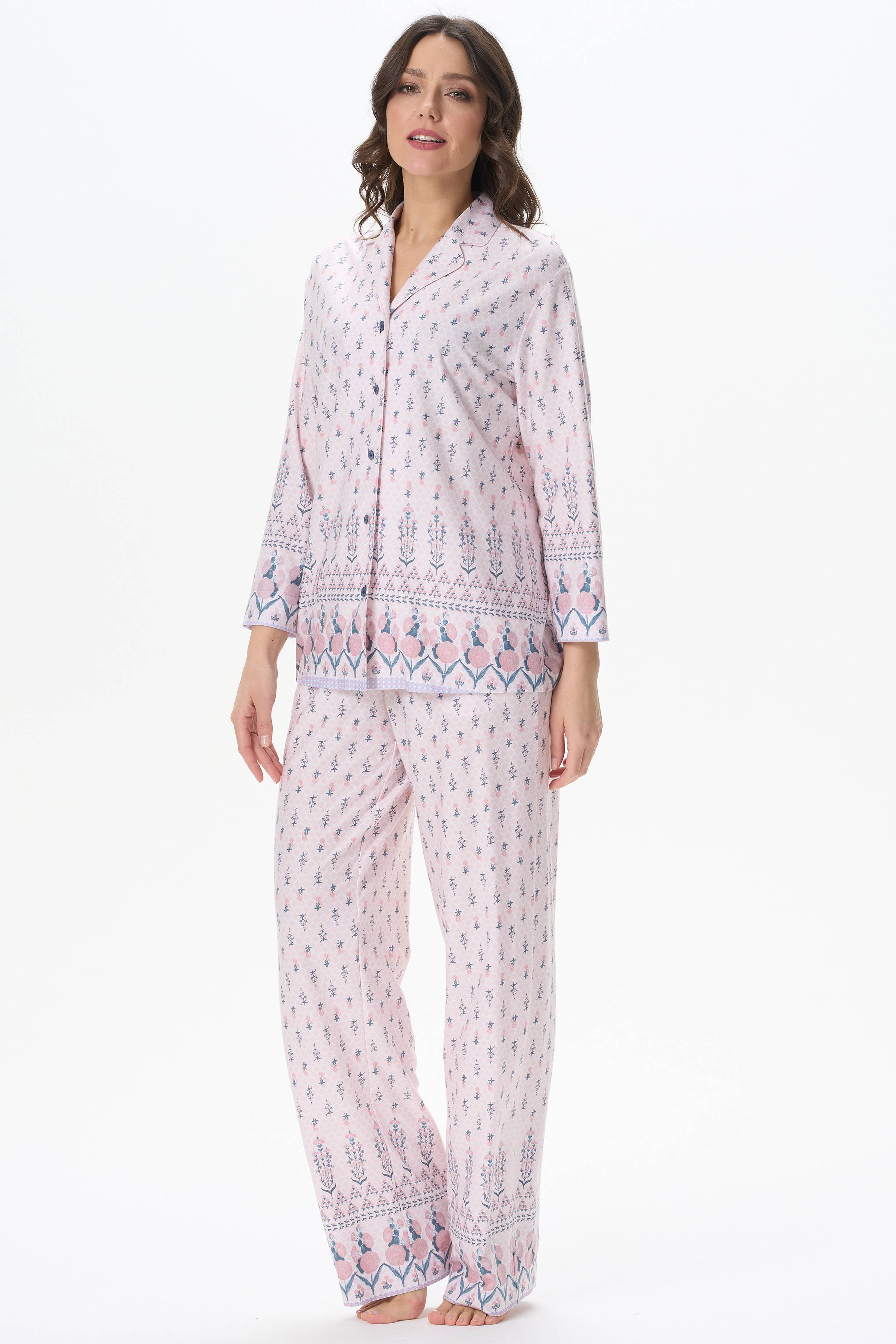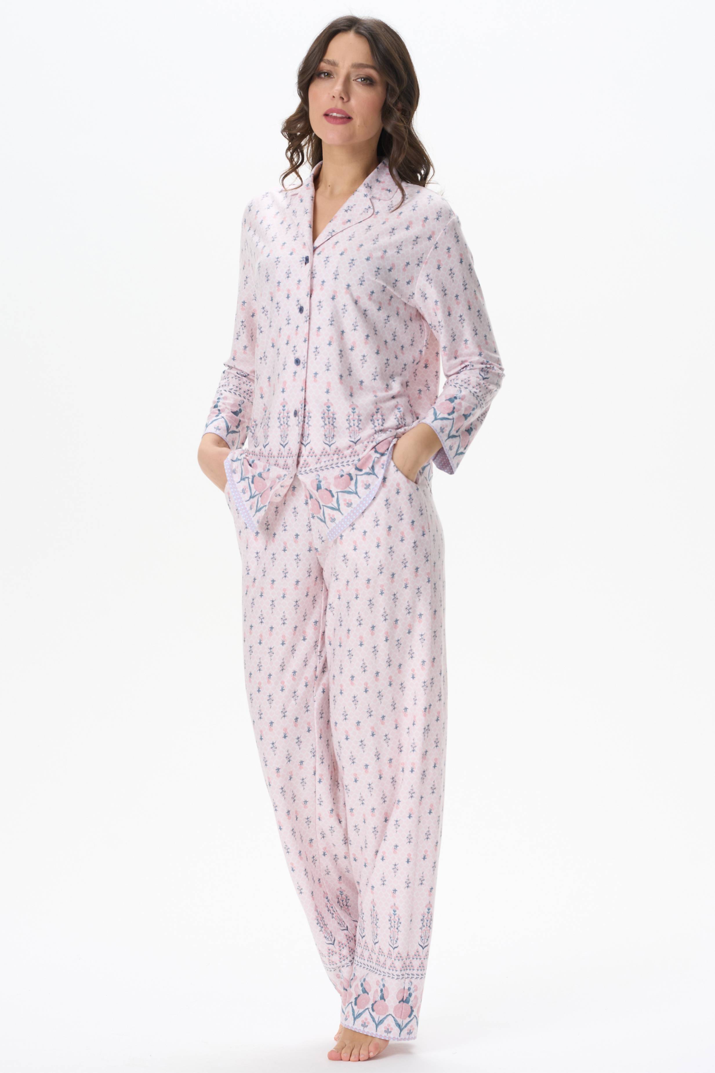 Описание: Уютная пижама из хлопкового трикотажного полотна с вискозой. У рубашки отложной воротник с лацканами, центральная застежка на пуговицы, длинные втачные рукава. Прямые брюки с карманами, пояс с эластичной тесьмой внутри. Рост модели на фото 170см.