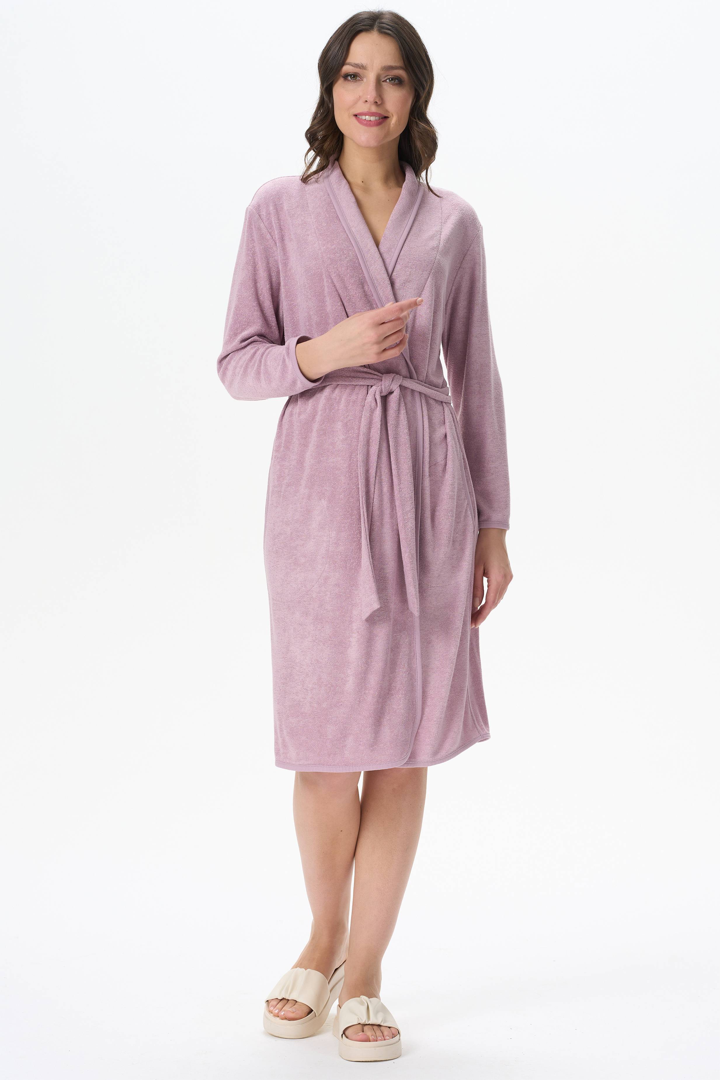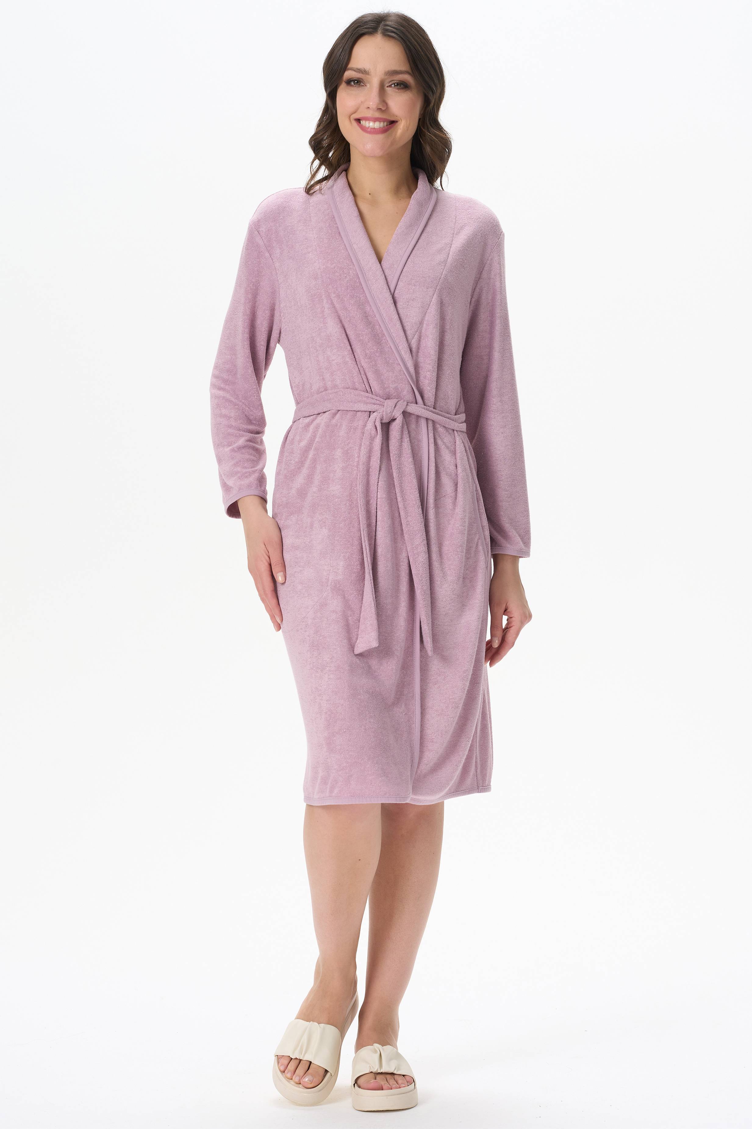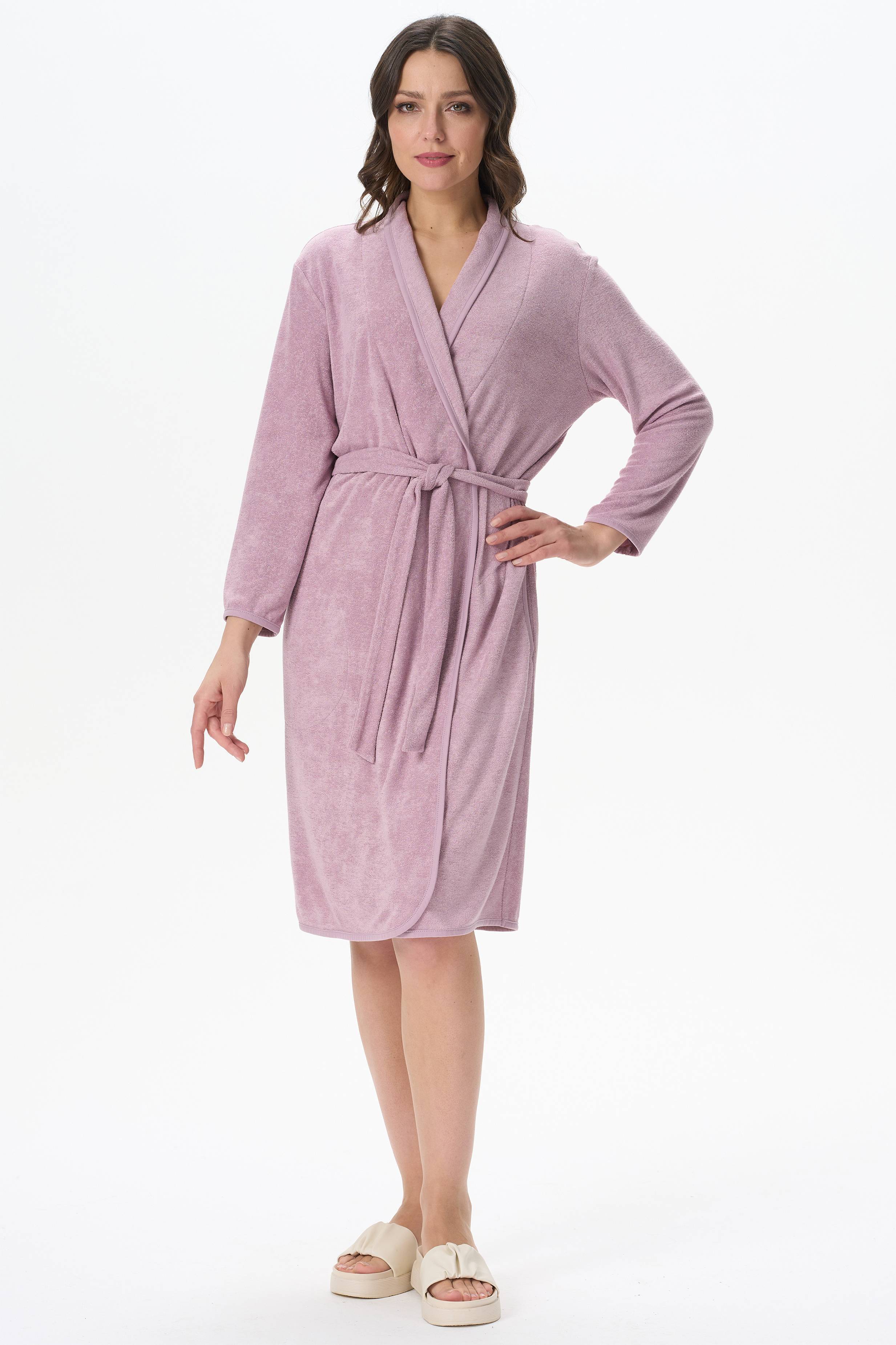 Описание: Комфортный халат с запахом из махрового вискозного трикотажного полотна. Без воротника, в боковых швах карманы, длинные рукава. Рост модели 170см.