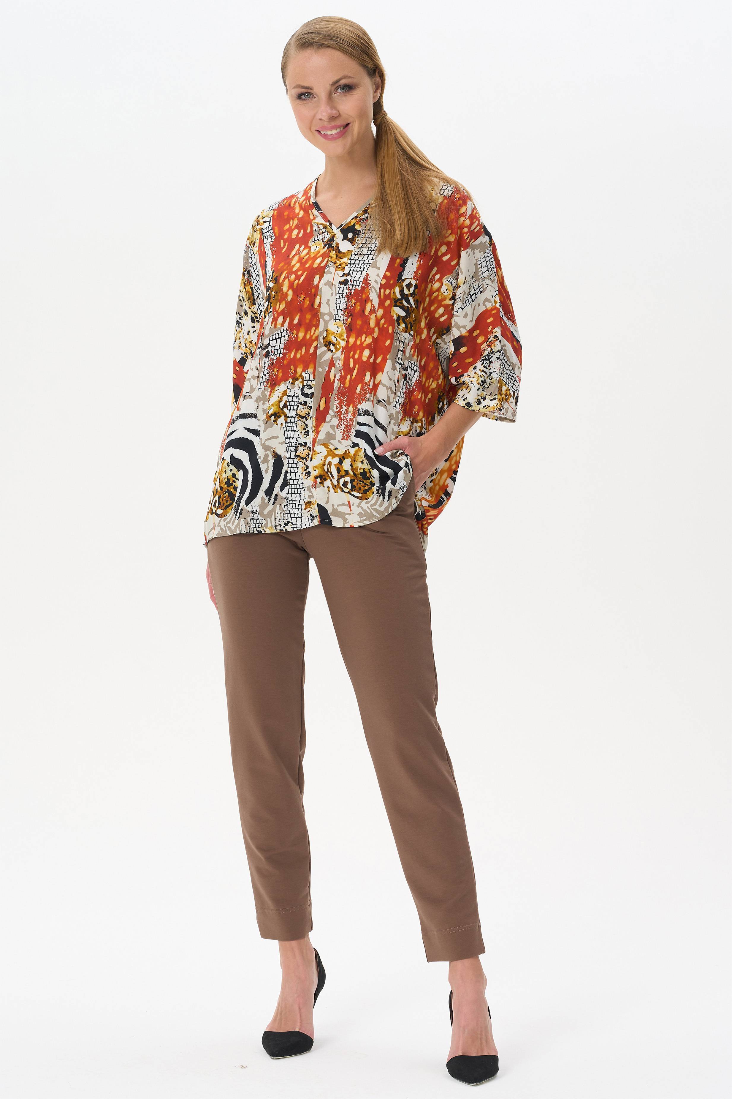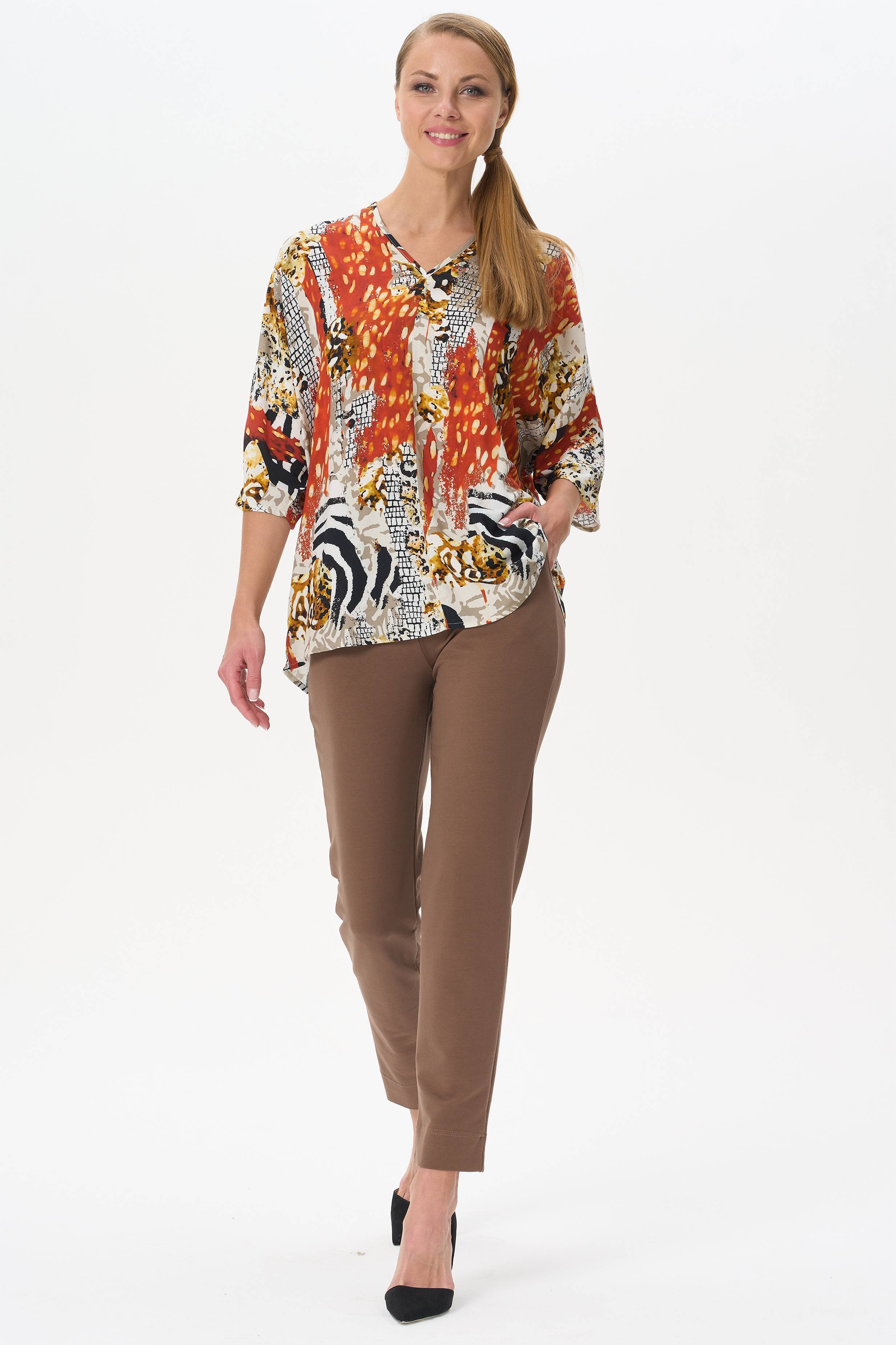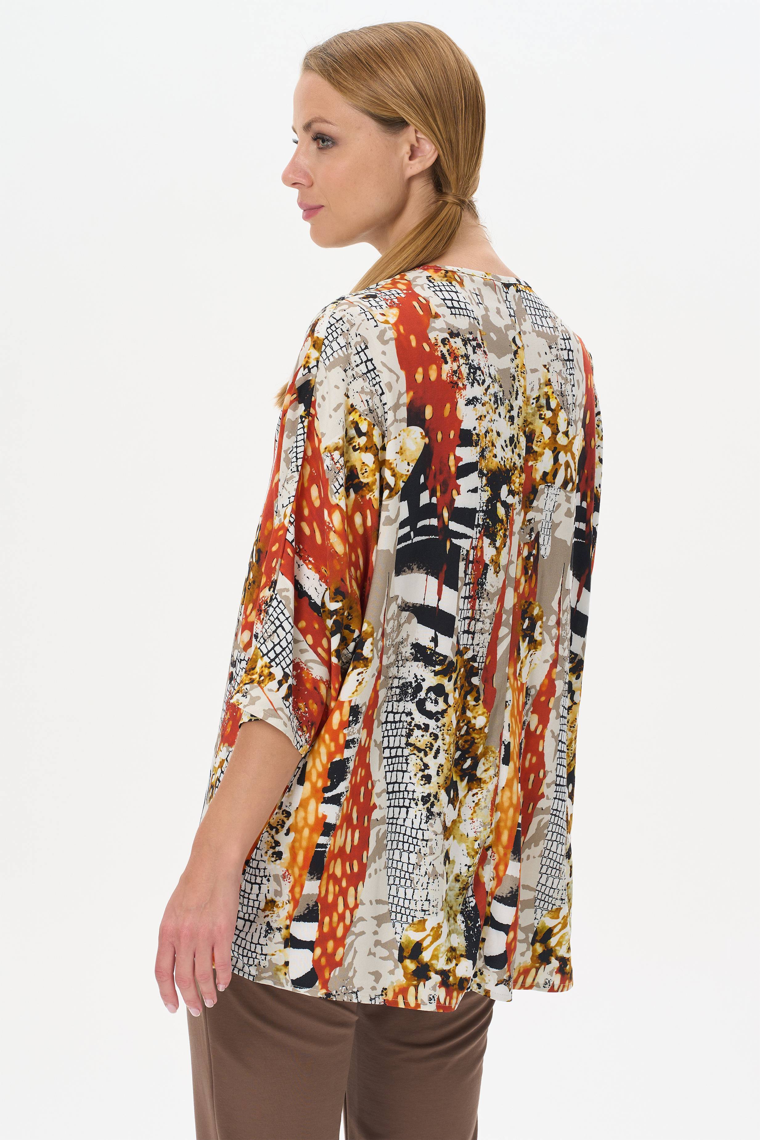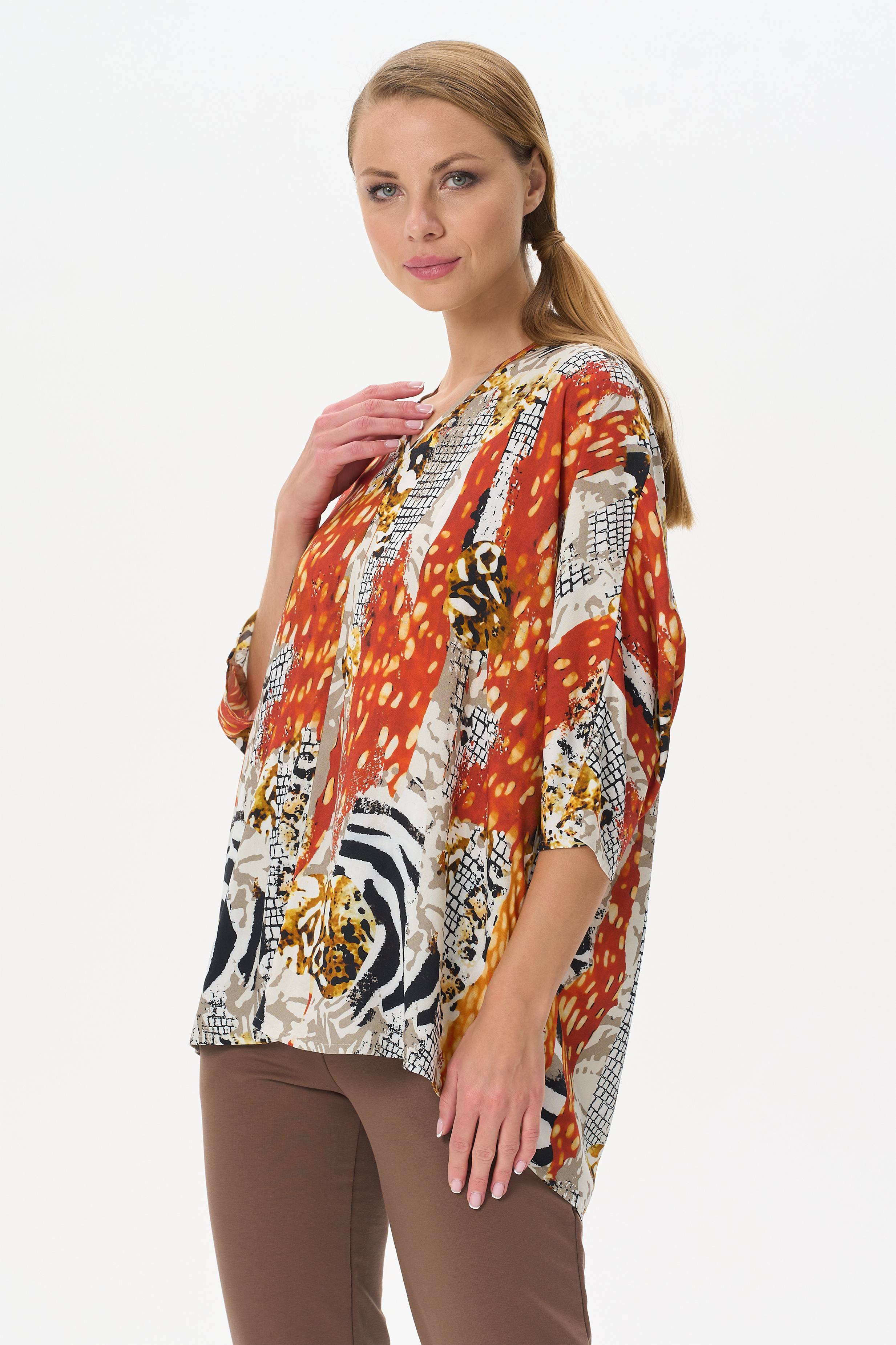 Описание: Легкая свободная блузка из штапеля. V-образный вырез горловины. Цельнокроенные рукава длиной чуть ниже локтя. Рост модели на фото 177