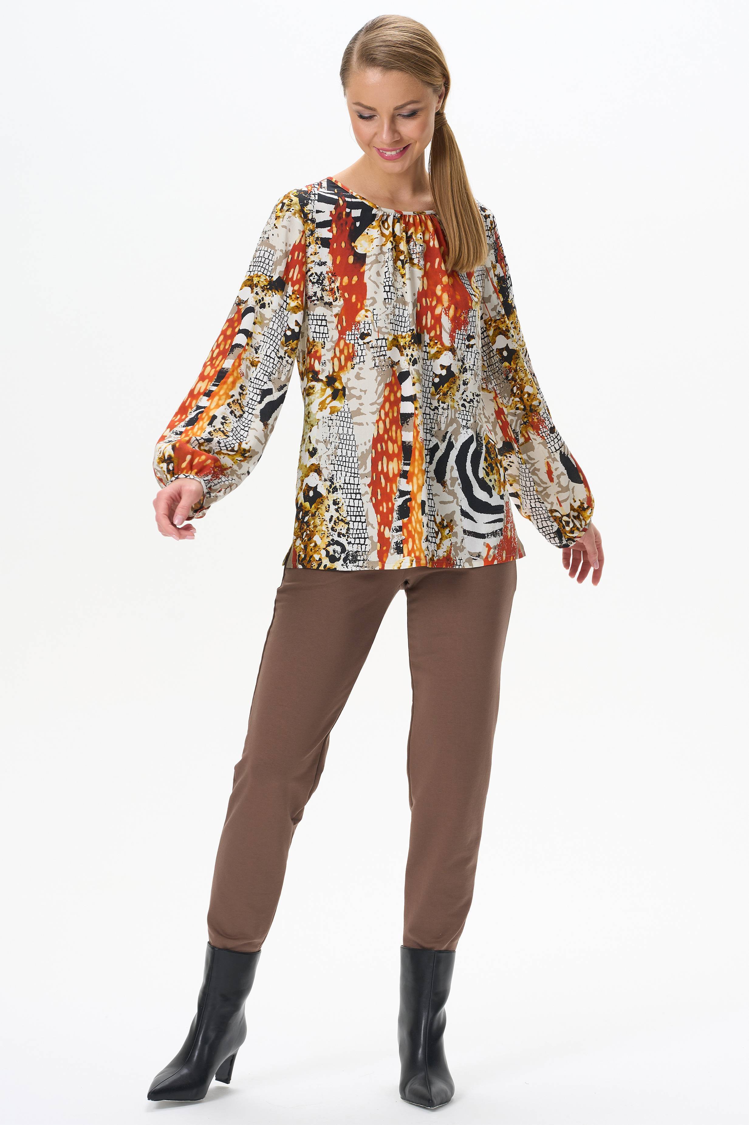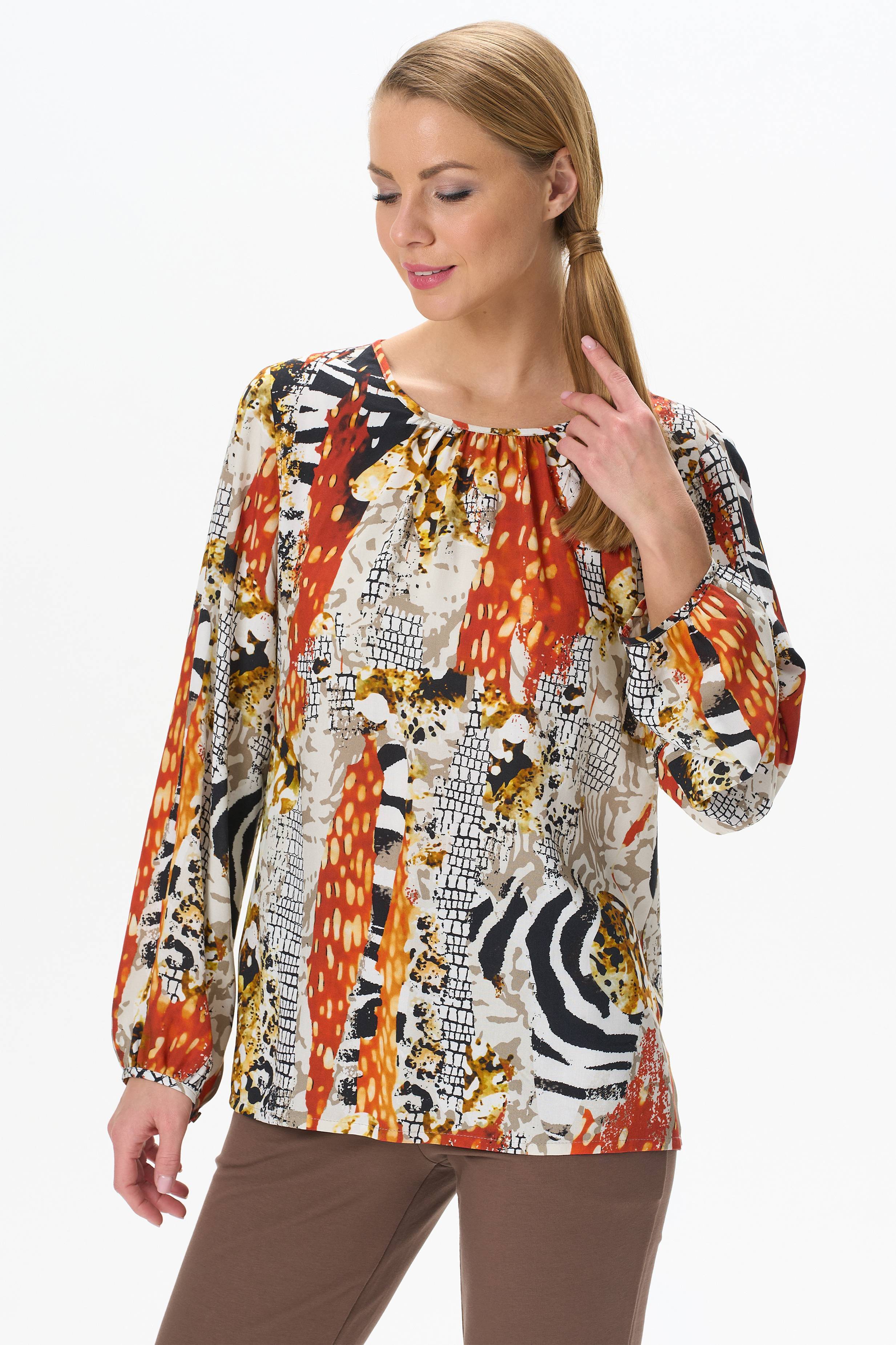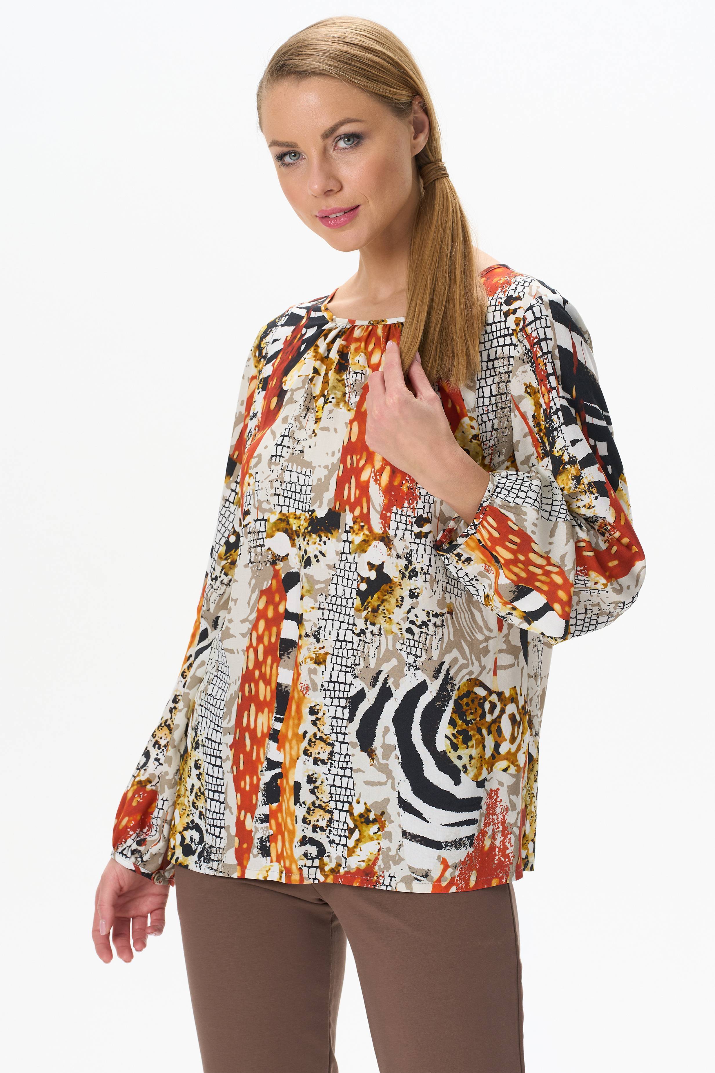 Описание: Блузка из штапеля прямого силуэта. Круглый вырез горловины с застежкой на пуговицу. Длинные втачные рукава с застежкой на пуговицу. По низу в боковых швах разрезы. Рост модели на фото 177