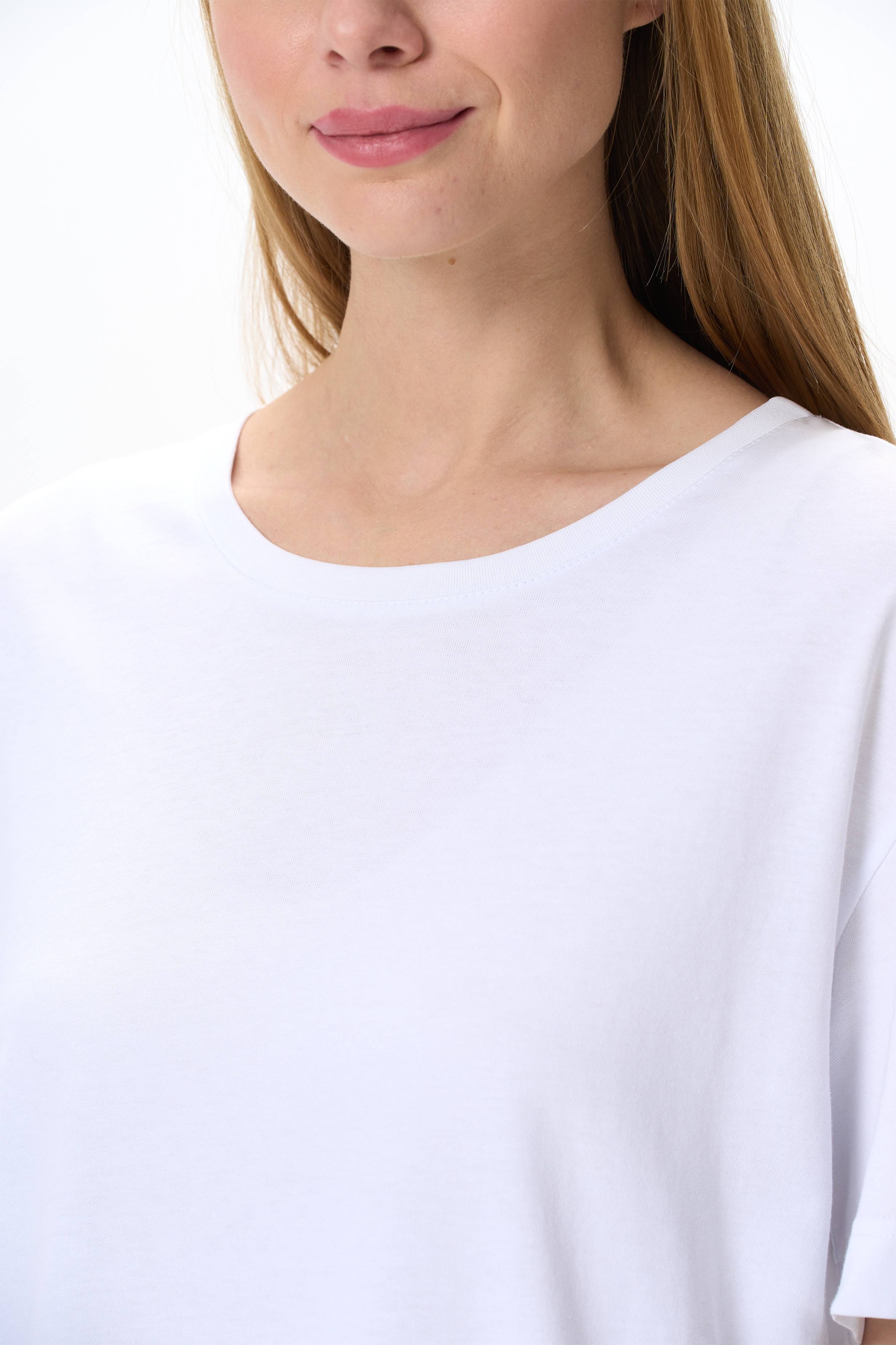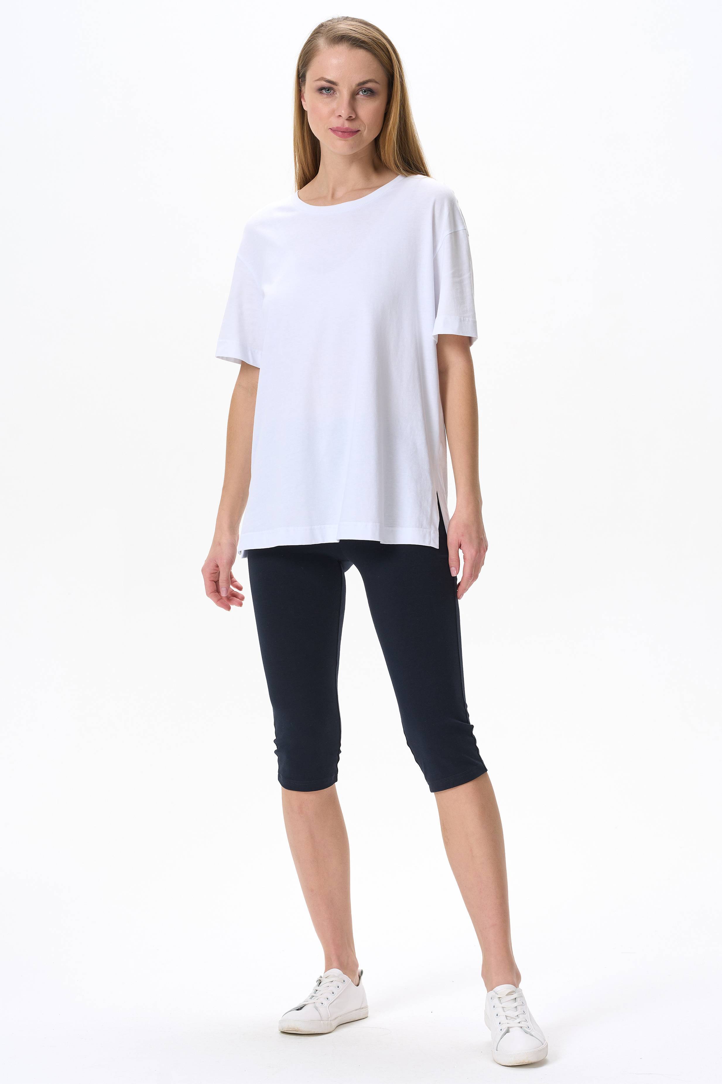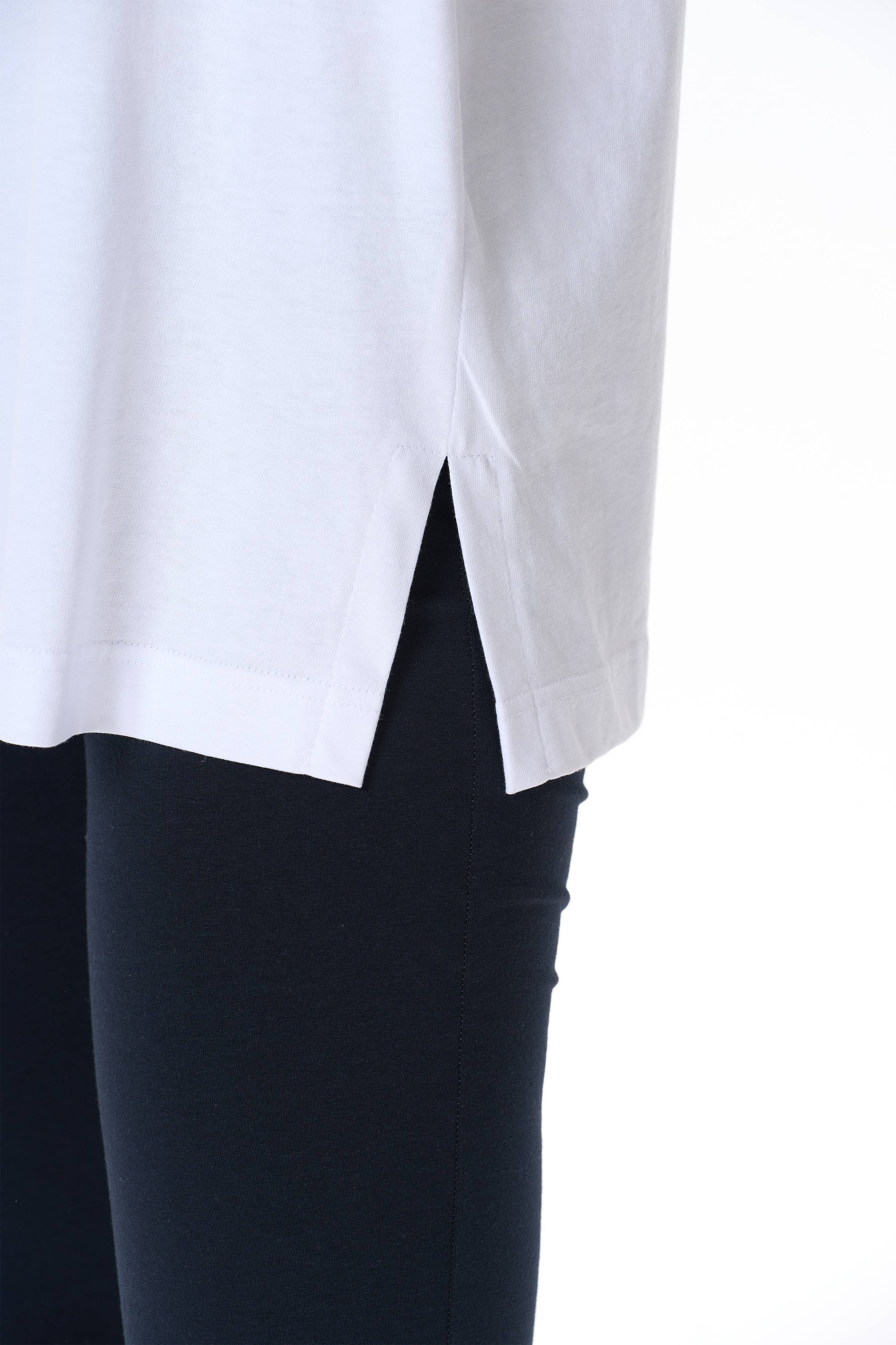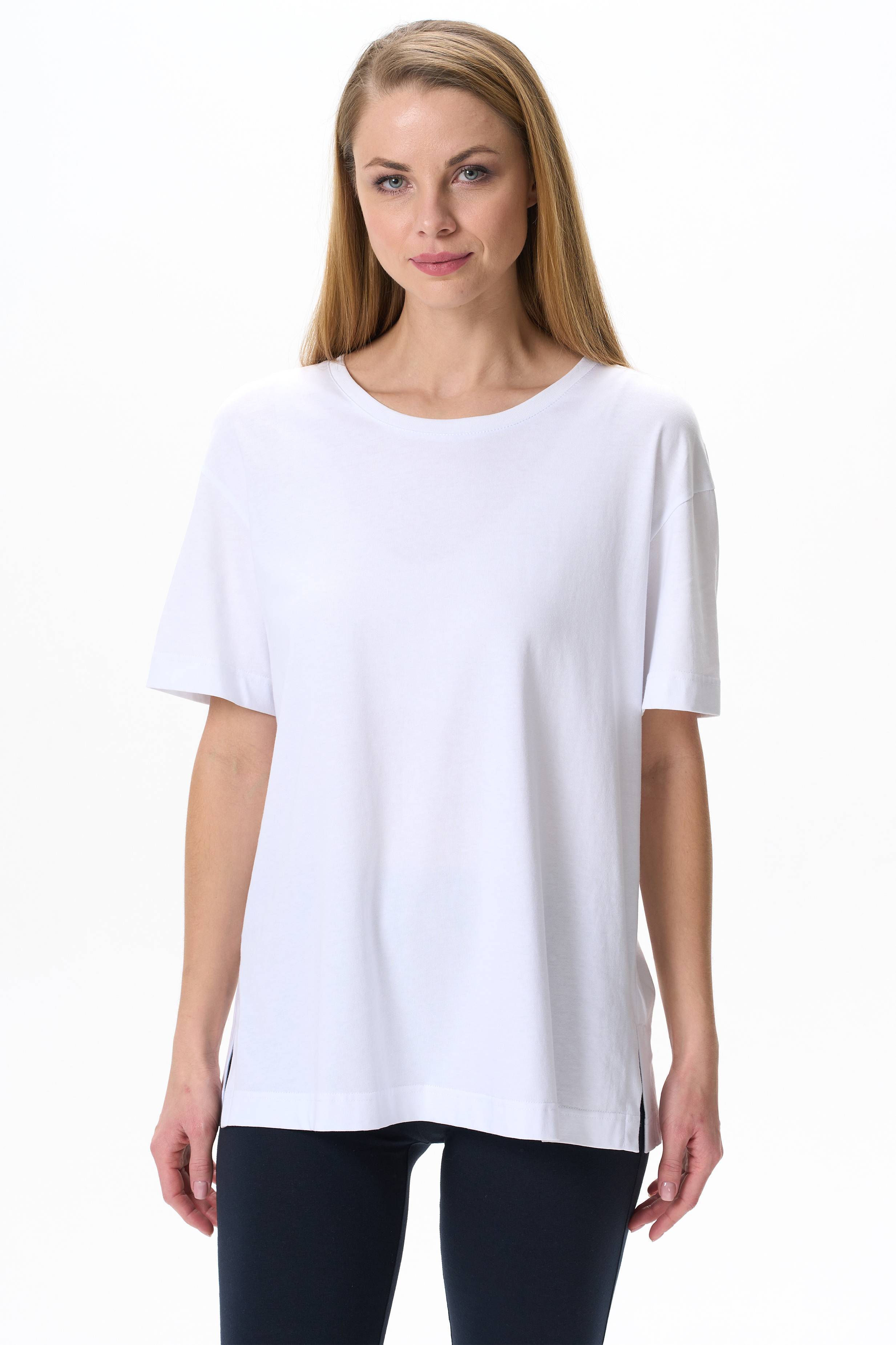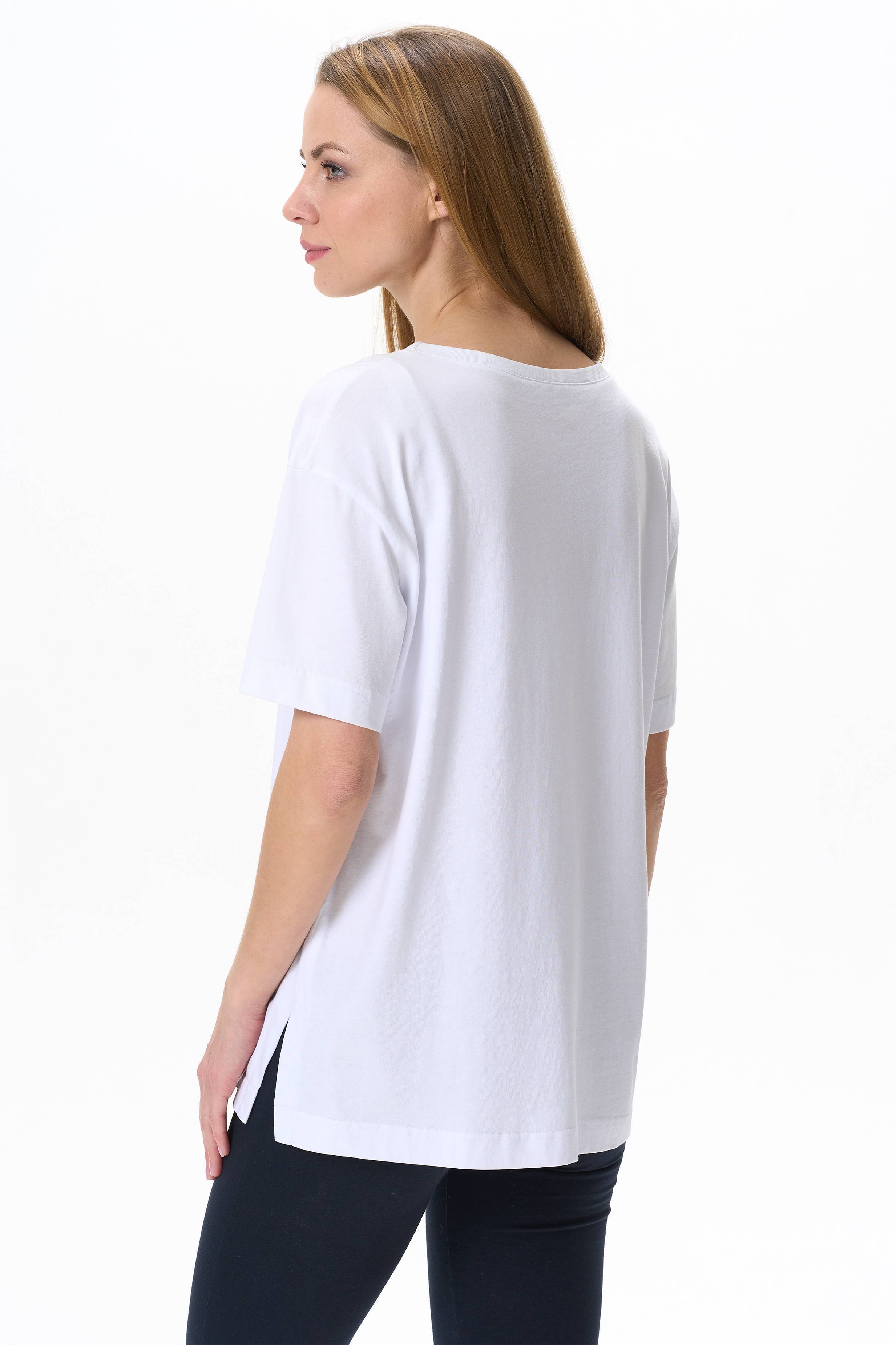 Описание: Удлиненная футболка свободного силуэта из хлопкового трикотажного полотна, качества пенье. Круглый вырез горловины окантован хлопковым полотном рибана, широкие рукава. По низу изделия в боковых швах разрезы. Рост модели на фото 177.