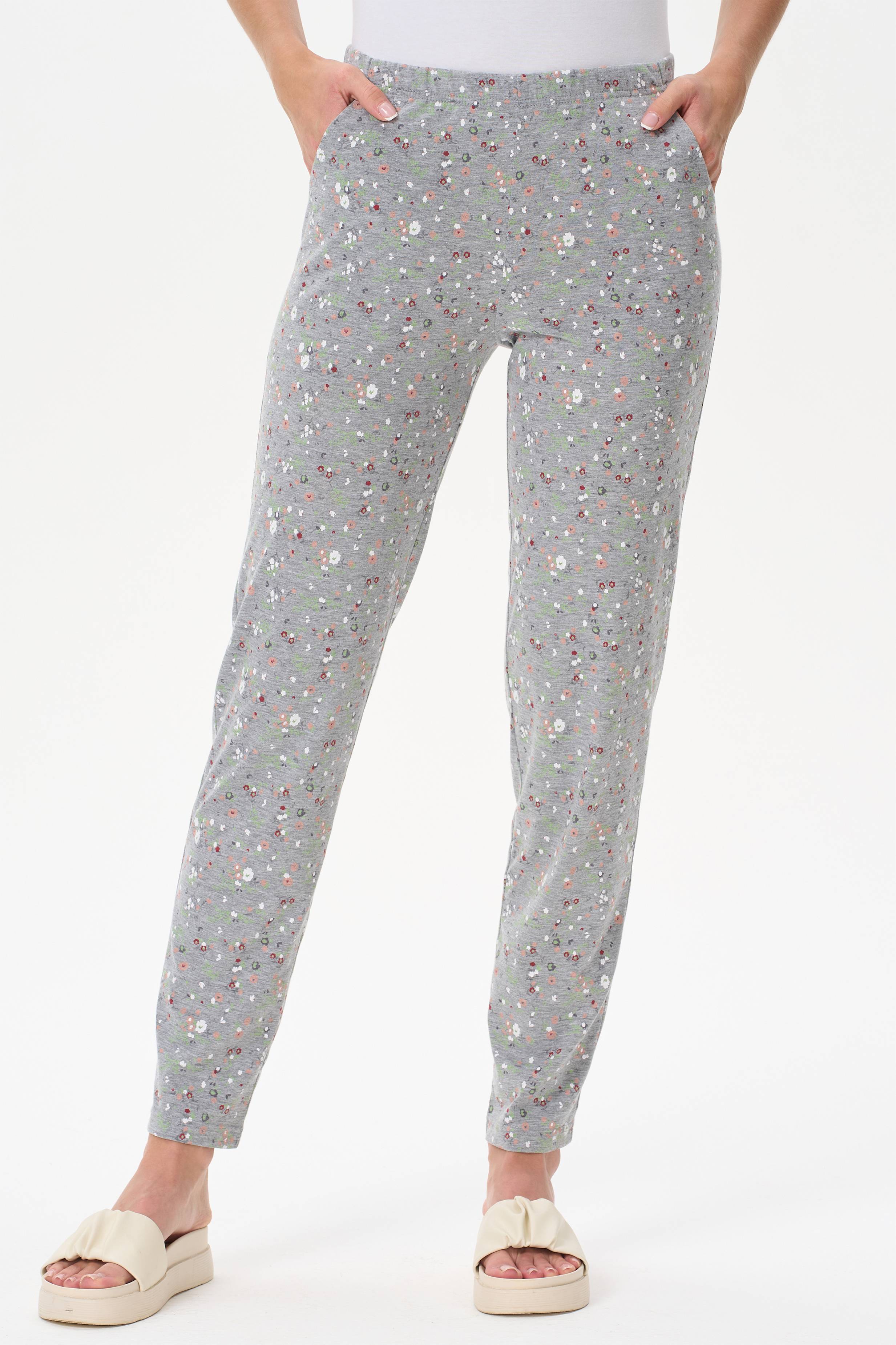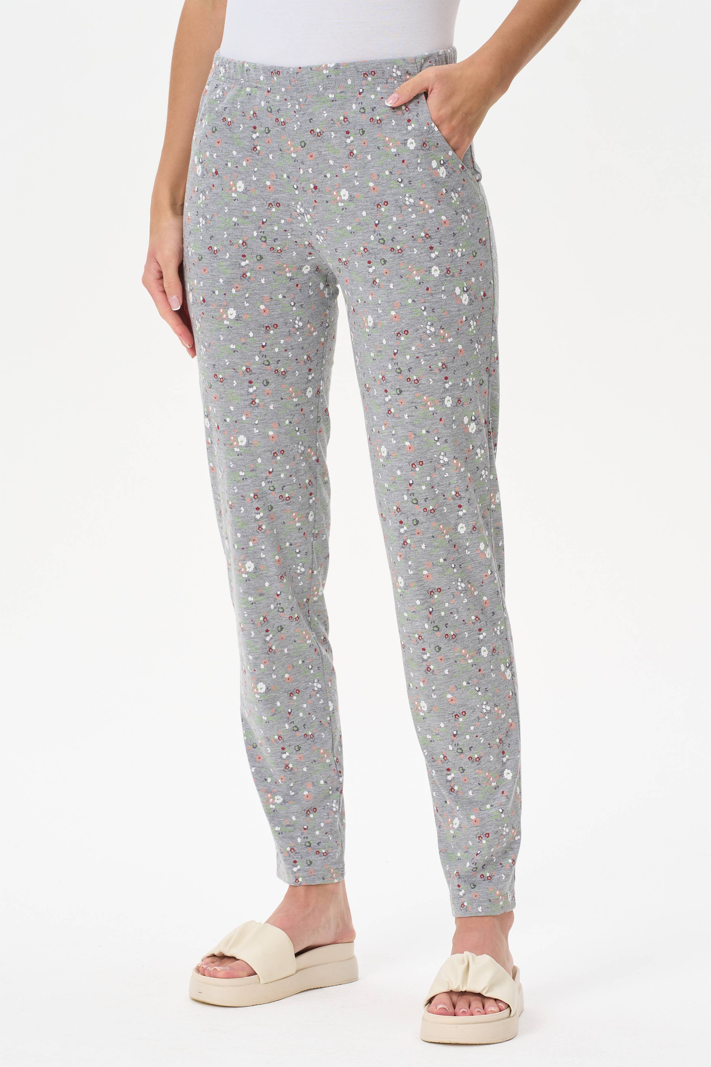 Описание: Длинные, зауженные брюки с карманами из хлопкового меланжевого полотна. Пояс с эластичной лентой внутри. Длина брюк по боковому шву в 44 размере - 103см. Рост модели 177.