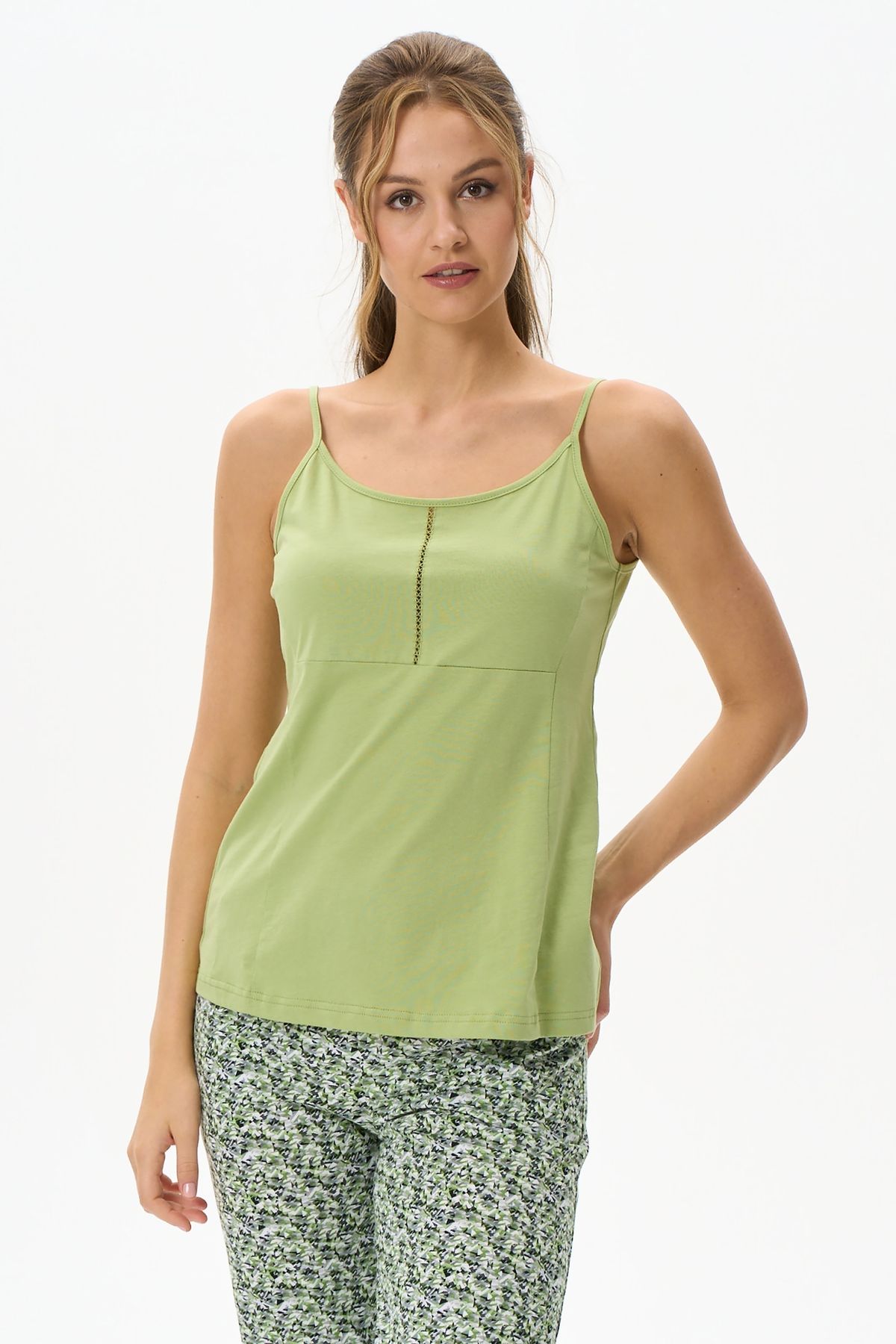 Описание: Майка из хлопкового полотна. Круглый вырез горловины. Спереди подрез и средний шов декорирован мережкой. Рост модели на фото 177.