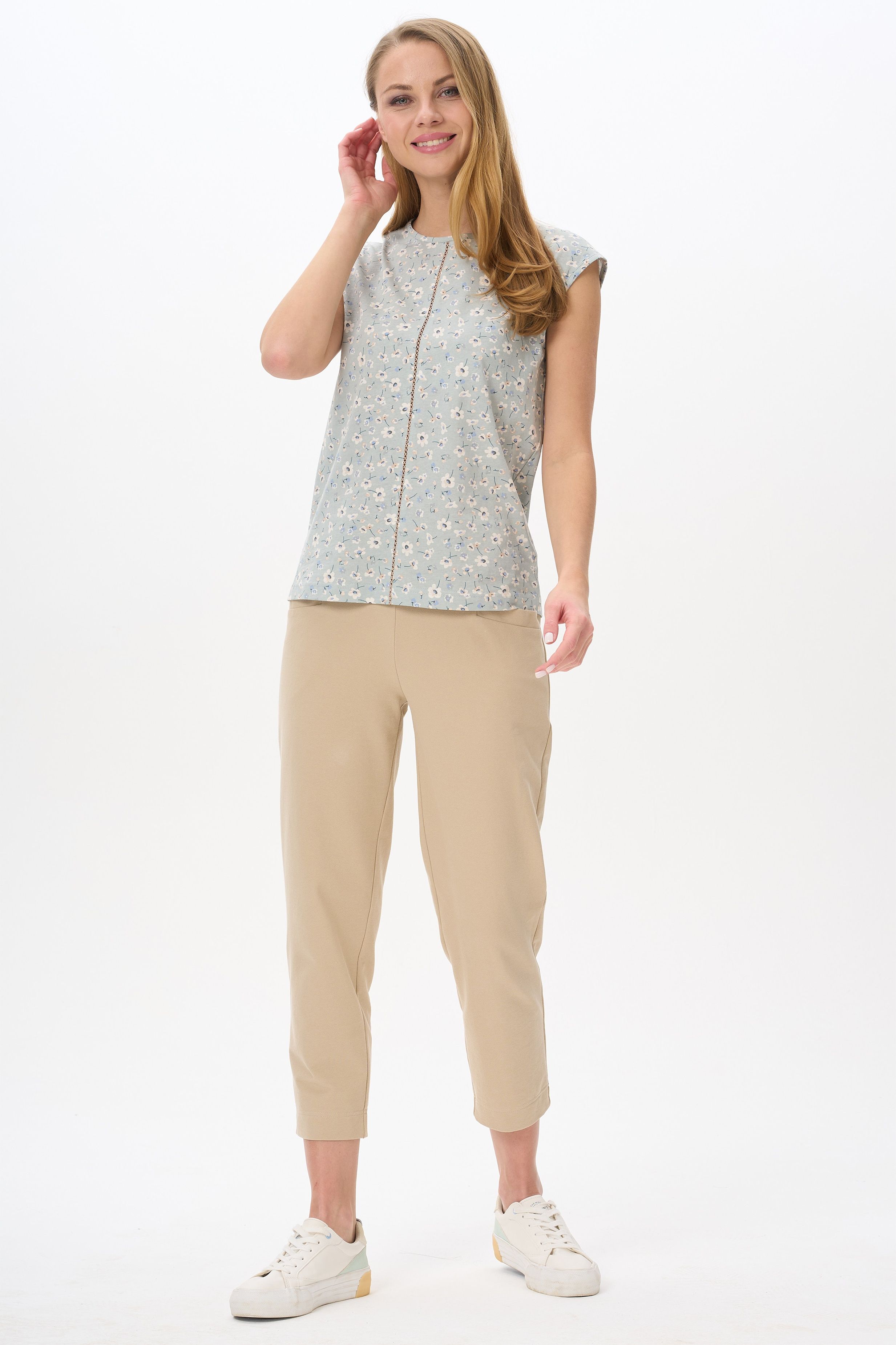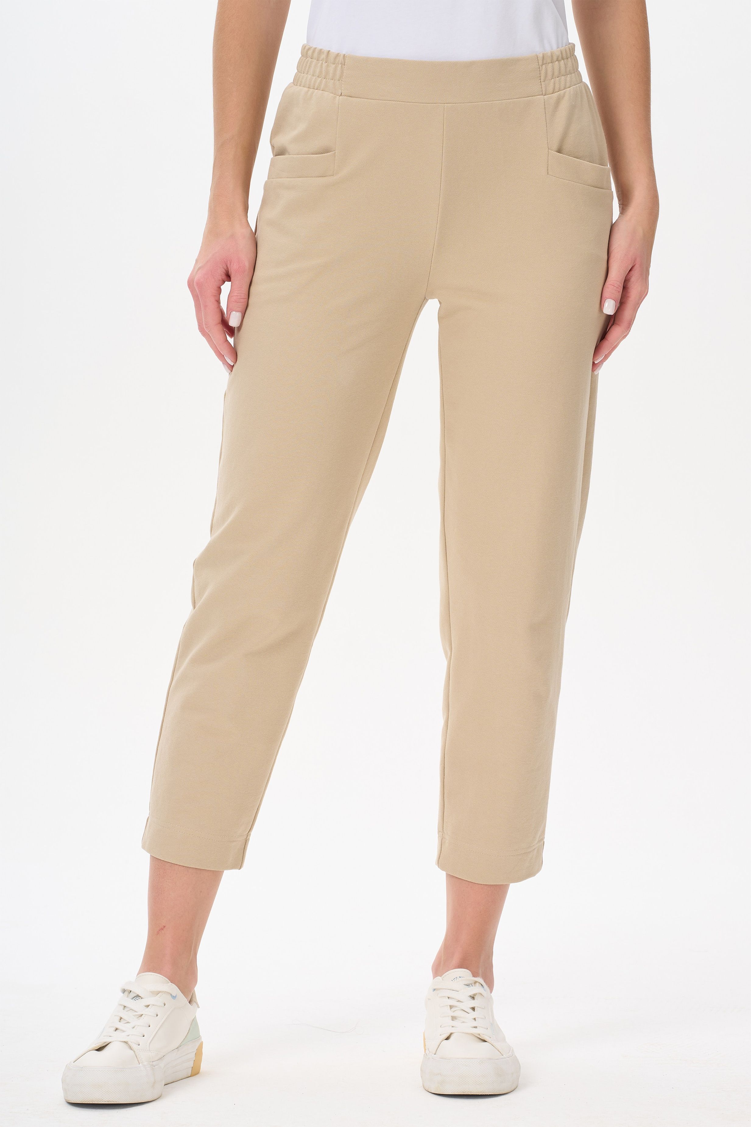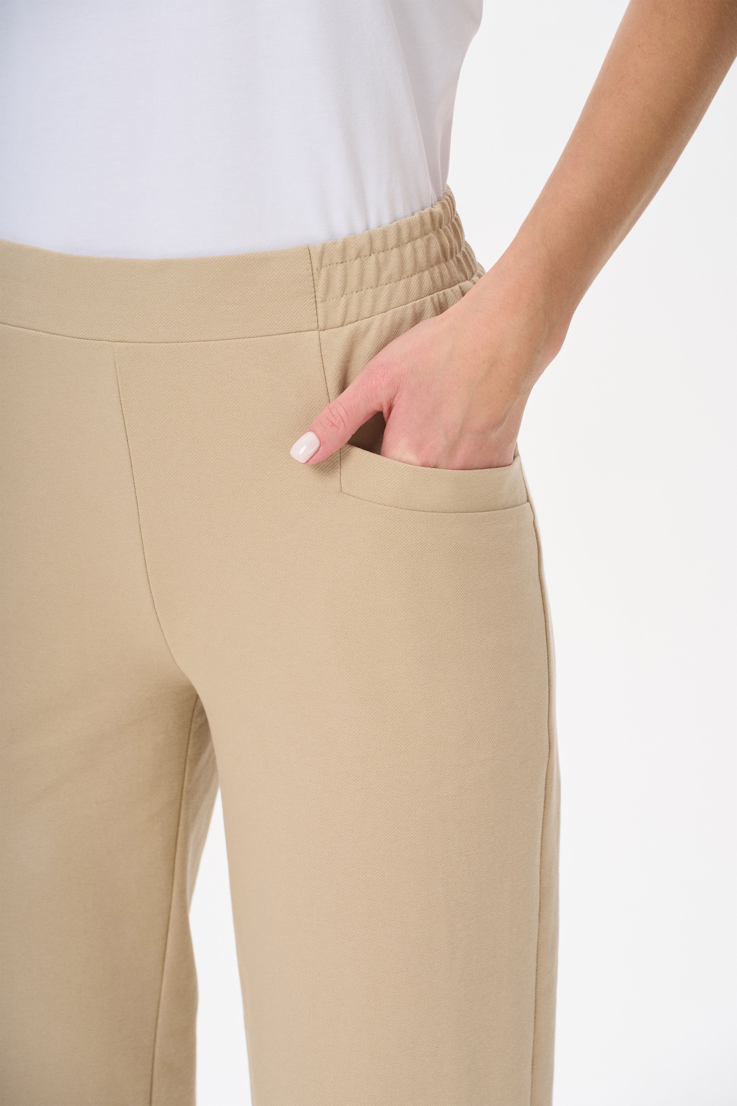 Описание: Укороченные, зауженные брюки с фигурными карманами, из хлопкового полотна джинскотт. Пояс с планкой и эластичной тесьмой внутри. Длина по боковому шву(без пояса) 87см. Рост модели на фото 177.