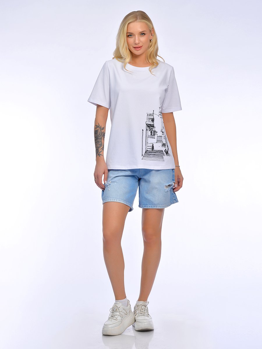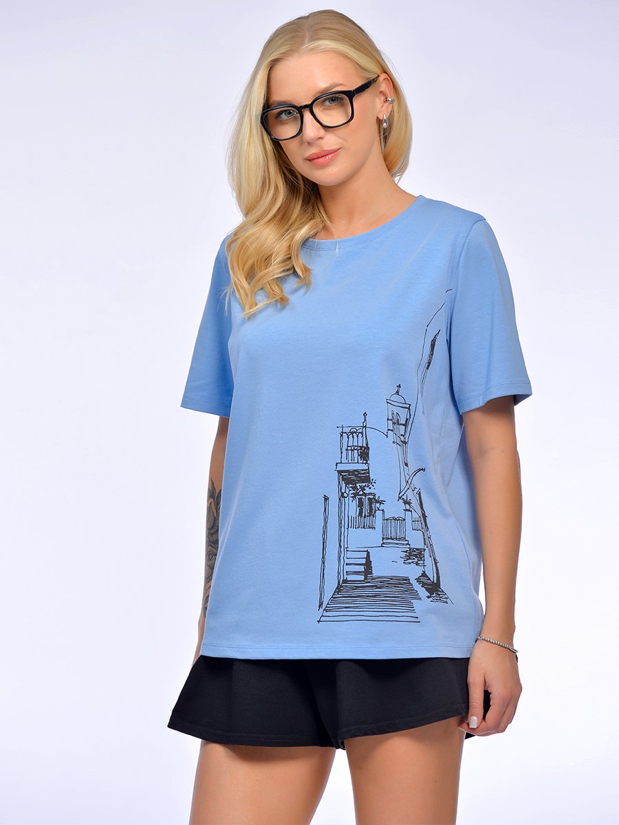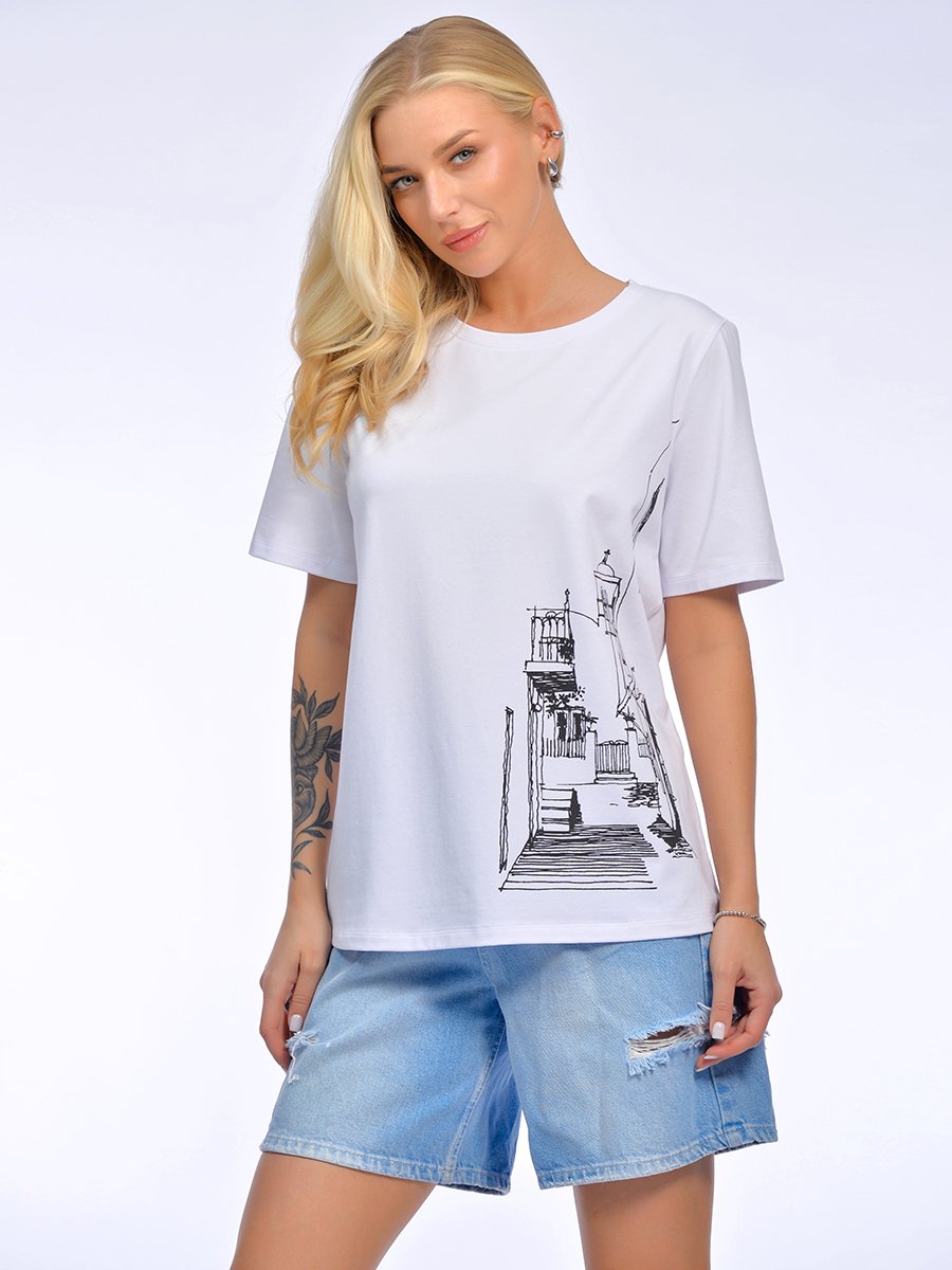 Классическая футболка из хлопка с эластаном с архитекрурным принтом в стиле Арт-кэжуал. Модель для ценителей европейской эстетики. Крупный архитектурный принт в технике шелкография обладает высокой износостойкостью, четкостью линий, не трескается, не выцветает после множества стирок, тактильно приятный, не утяжеляет изделие. Футболка из полотна премиум качества хлопок с эластаном, плотностью 190 г\м2, достаточно плотное, не прсвечивает, эластичное, не стесняет движений и не закатывается. Трикотаж приятный к телу. гигроскопичный и дышит-идеально для летнего сезона. Классический свободный силуэт с втачным рукавом, аккуратная горловина и идеальные швы. Не облегает, но и не создает лишнего объема, баланс формы и качества. Модель представлена в 2 чистых цветах: классический белый и небесный голубой. В сочетании с черным линейным принтом звучит максимально графично и благородно. Мотив «европейской улочки» вызывает приятные ассоциации с отпуском и путешествиями.