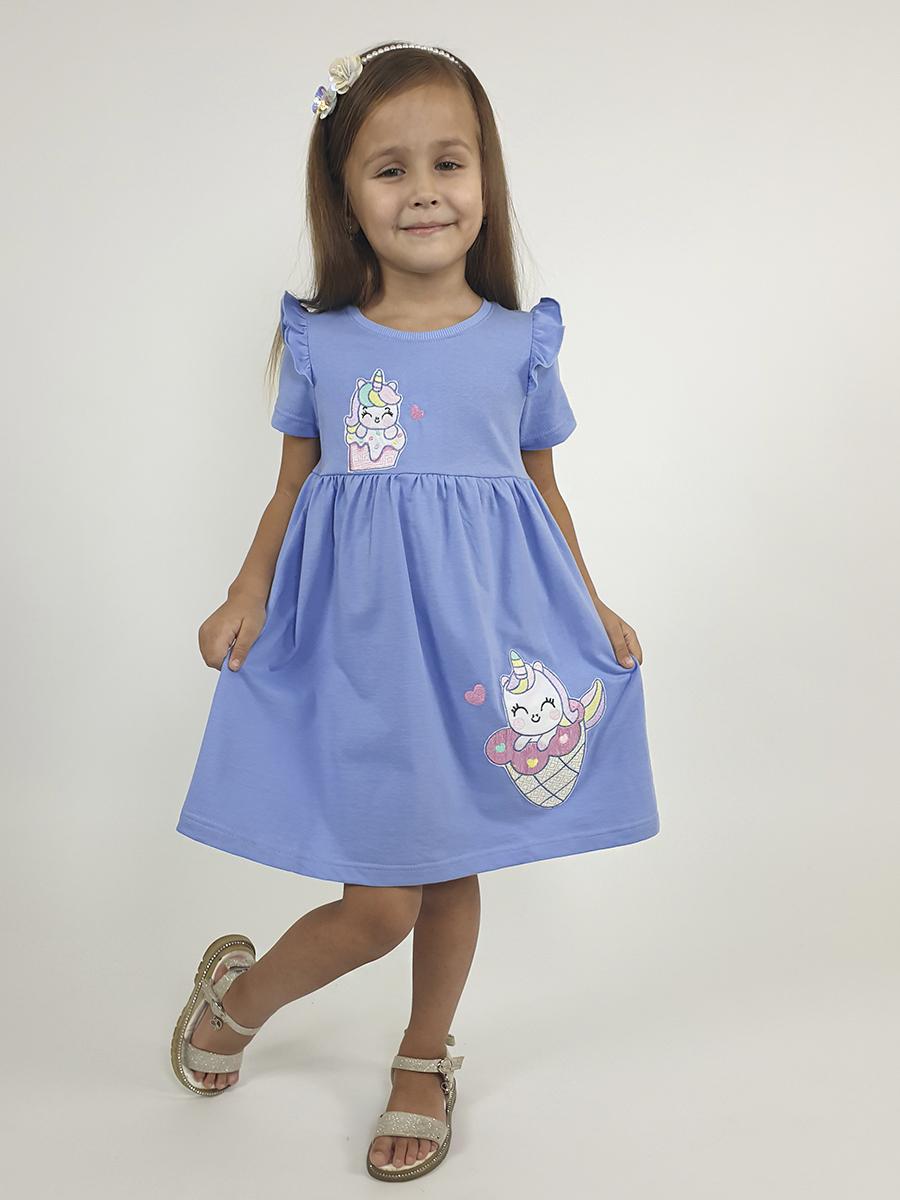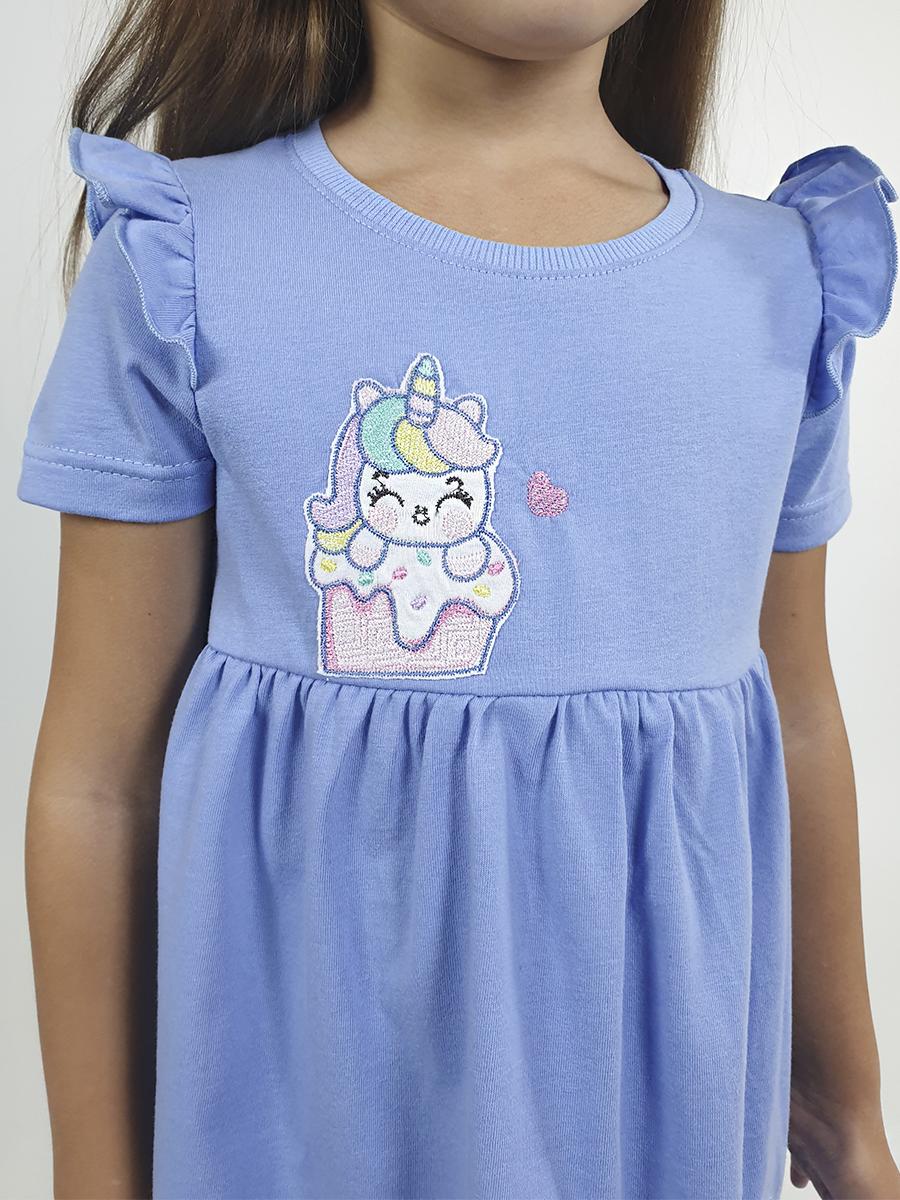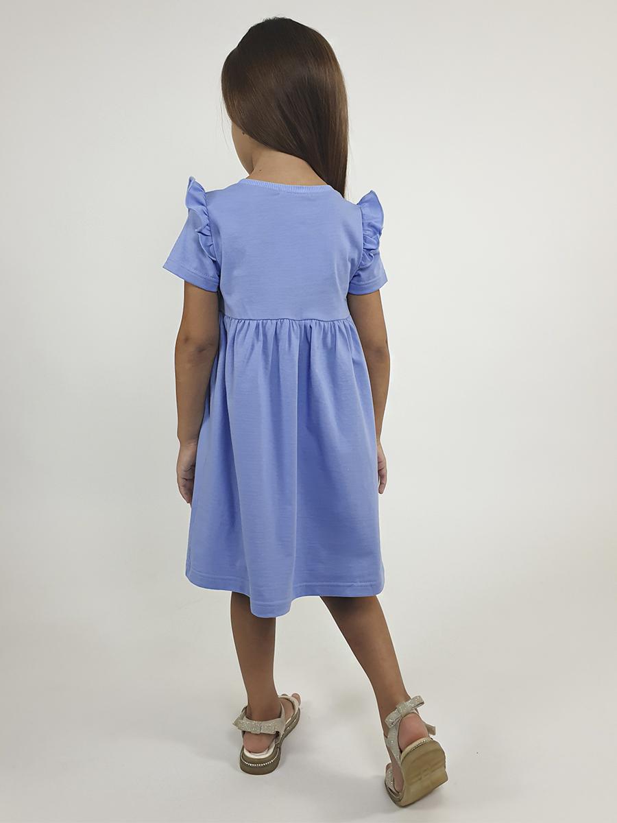 Платье-отрезная юбка со сборкой, с вышивкой на переде. Кокетка переда с печатью. Короткий рукав, в пройме рюша, горловина обработана ластиком.