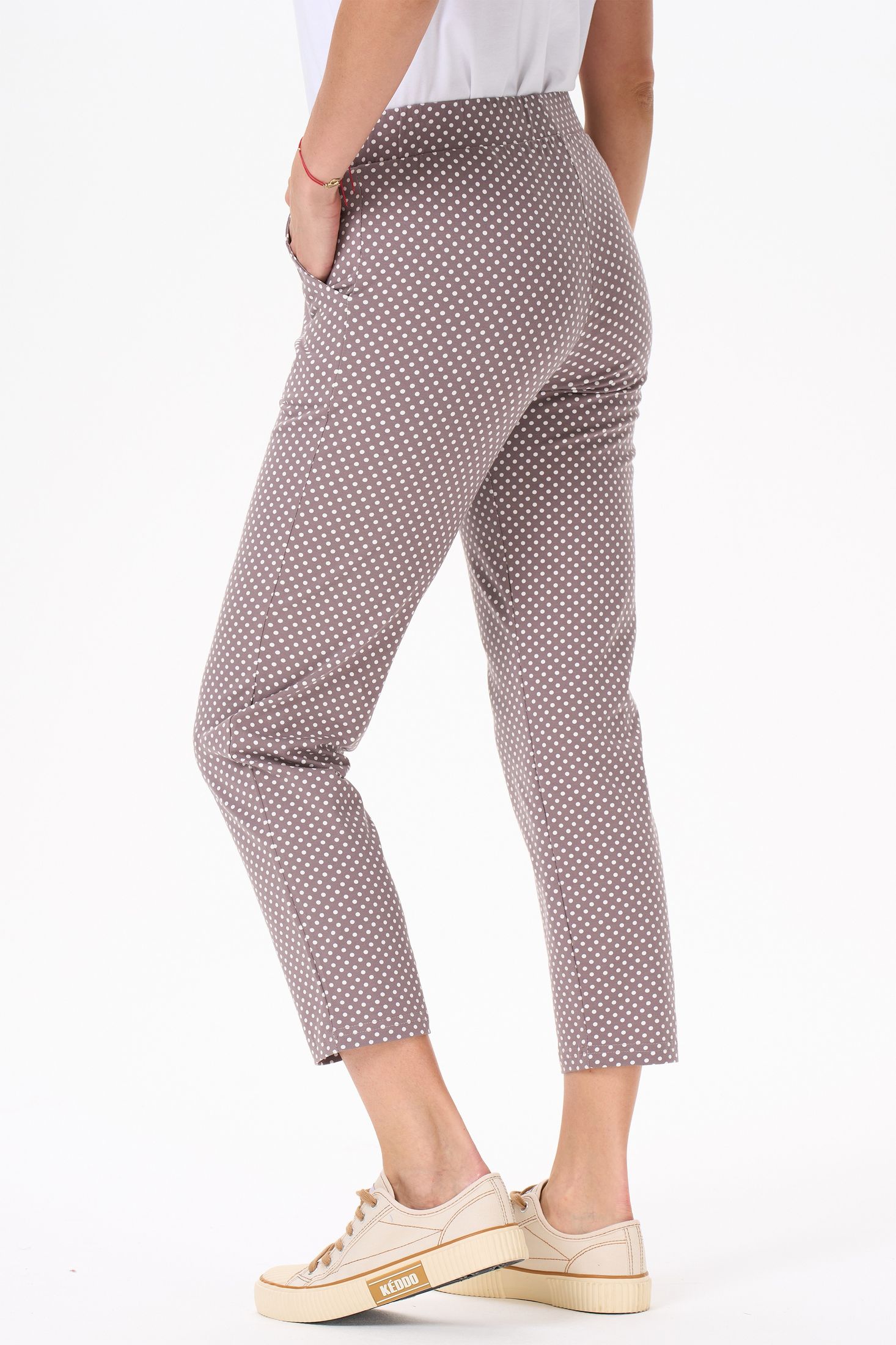 Описание: Универсальные брюки длиной 7/8 из хлопкового полотна с эластаном. Принт горошек. Пояс с эластичной лентой, два фигурных боковых кармана. Рост модели на фото 175см