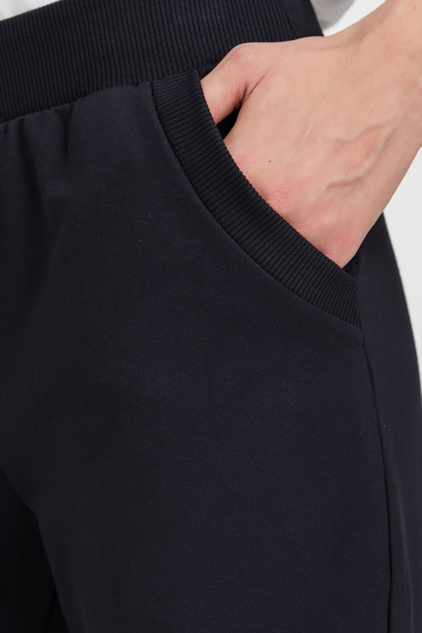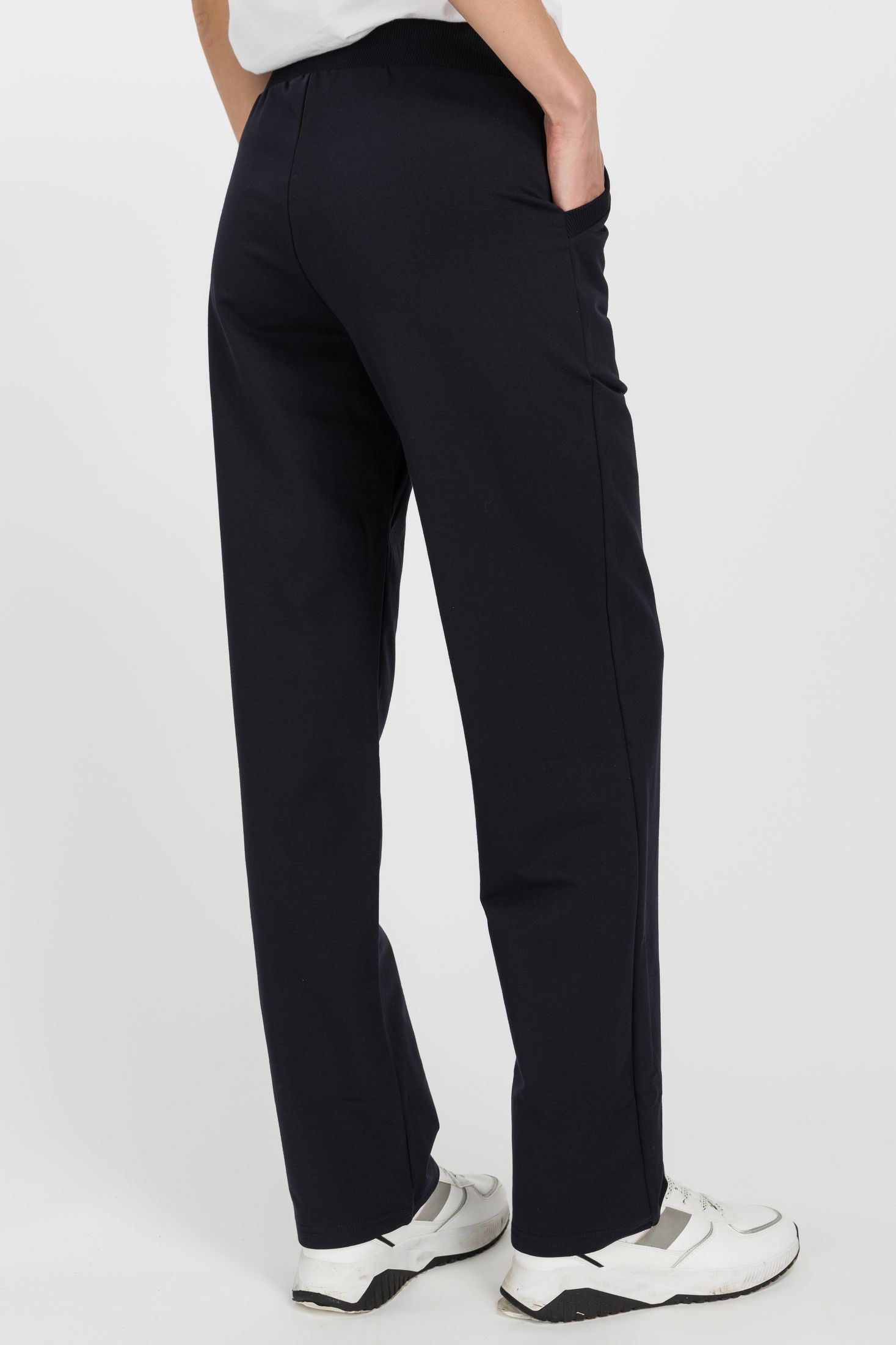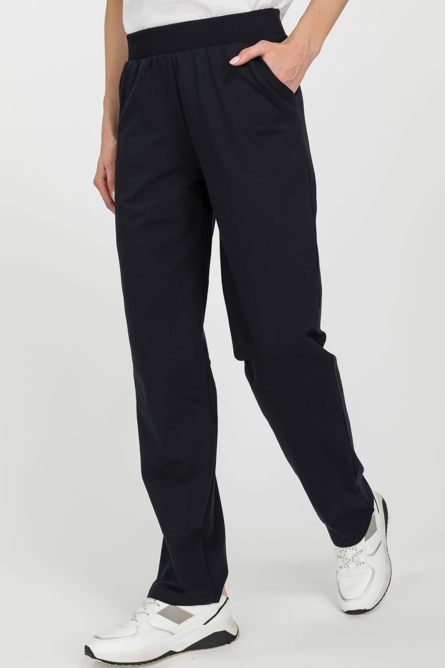 Описание: Повседневные, чуть зауженные, брюки с карманами из хлопкового футера. Пояс выполнен из кашкорсе с эластичной лентой. Фигурный вход в карман оформлен кашкорсе. Длина по боковому шву (без учета пояса) в 44 размере 100см. Рост модели на фото 177