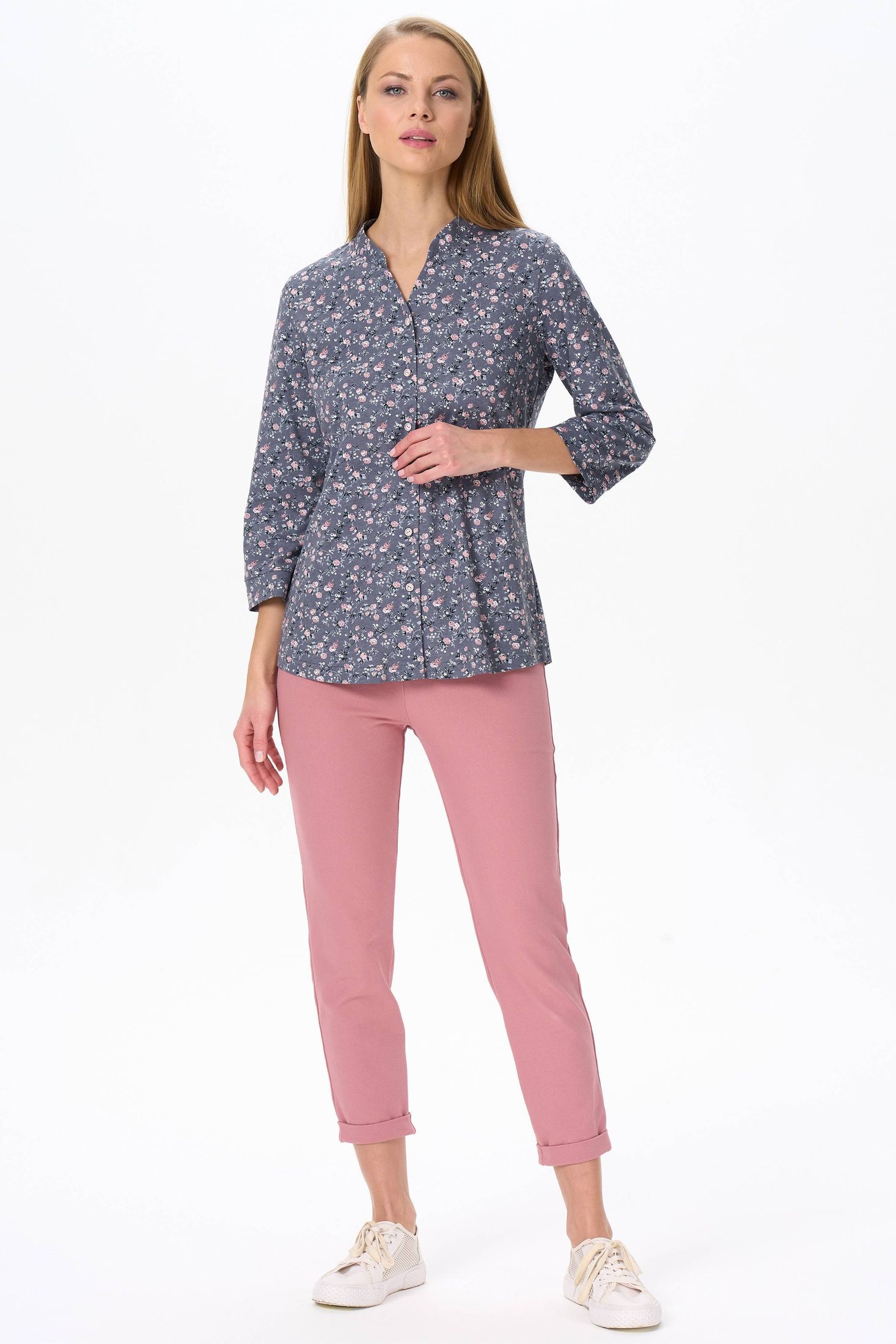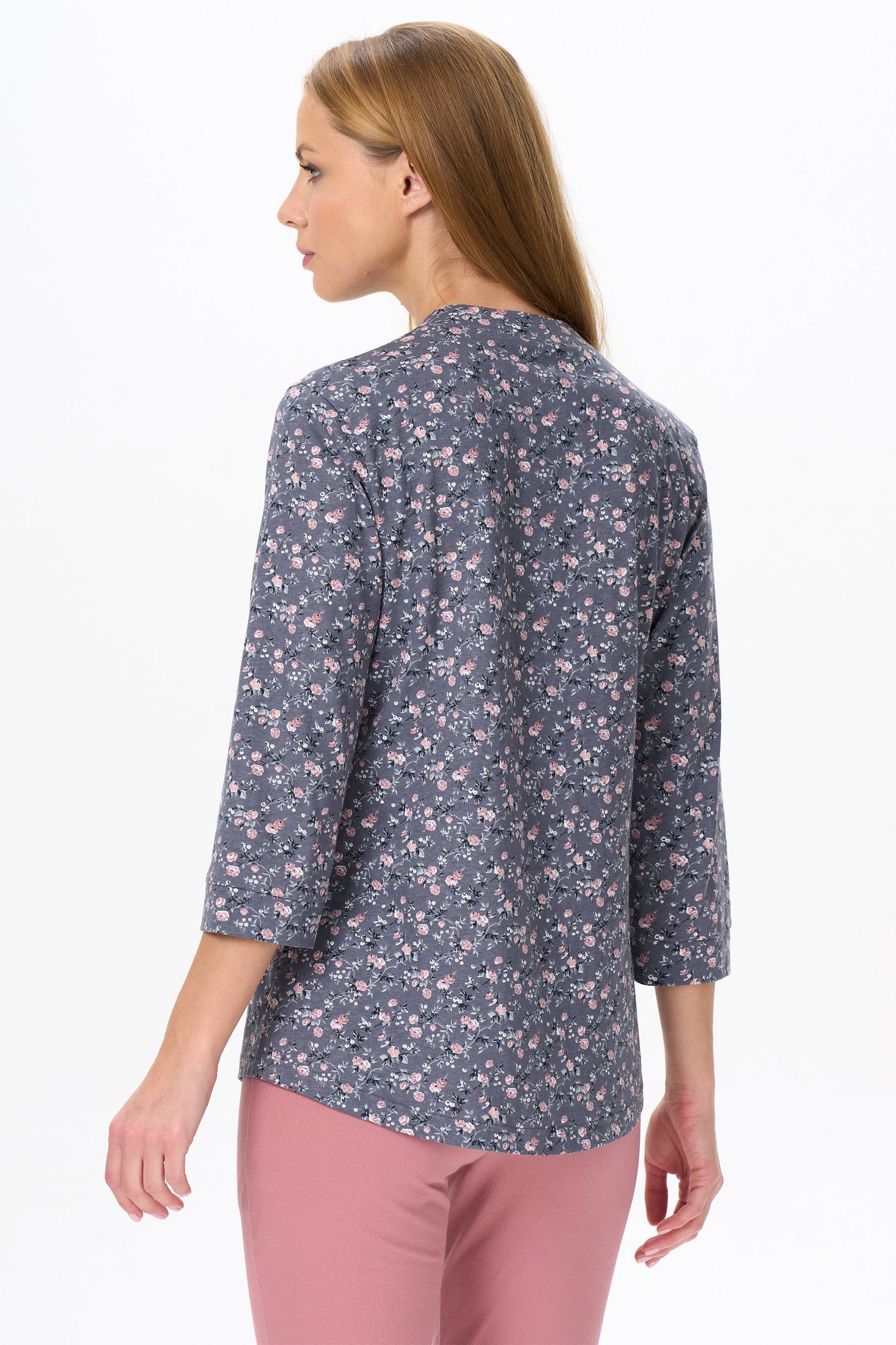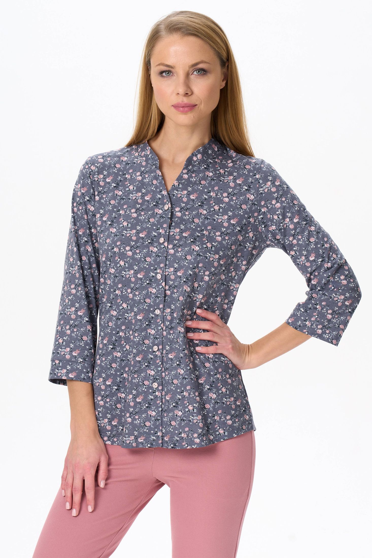 Описание: Блузка прямого силуэта из хлопкового полотна. Воротник стойка, застежка на пуговицы. Втачной рукав 7/8. Рост модели на фото 177
