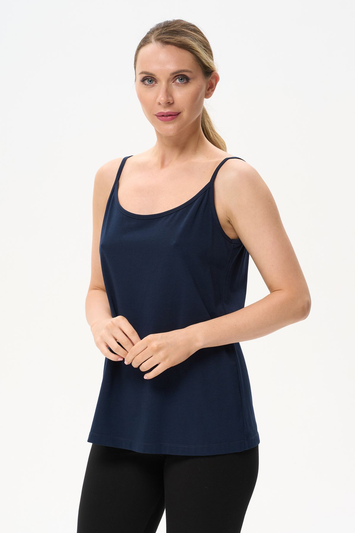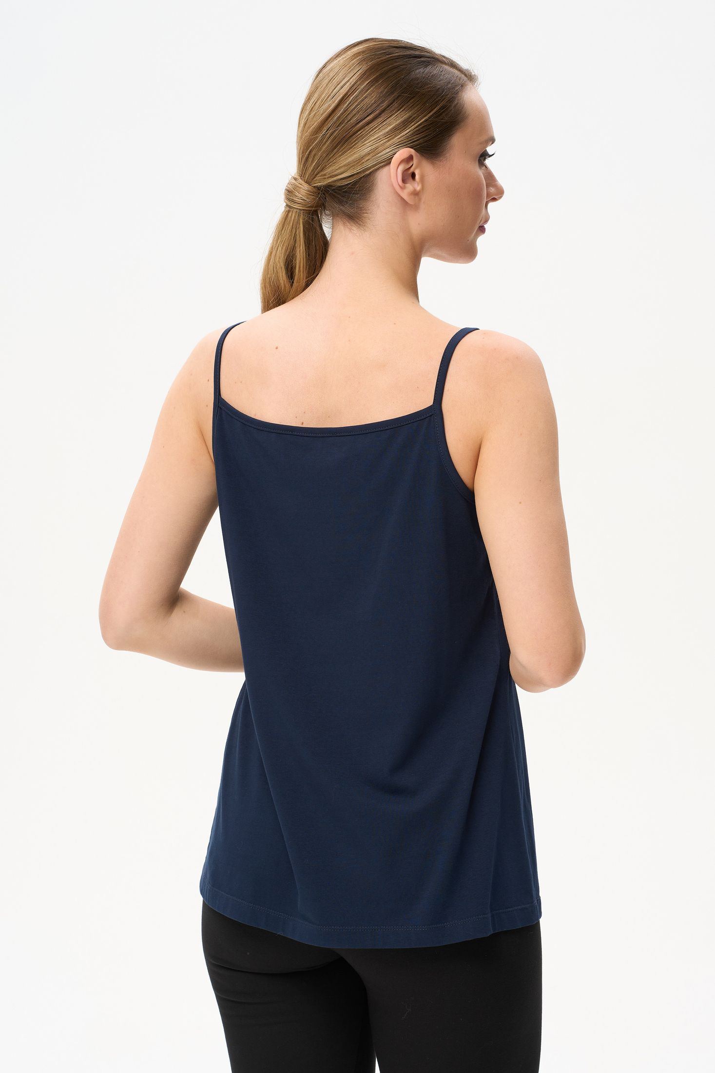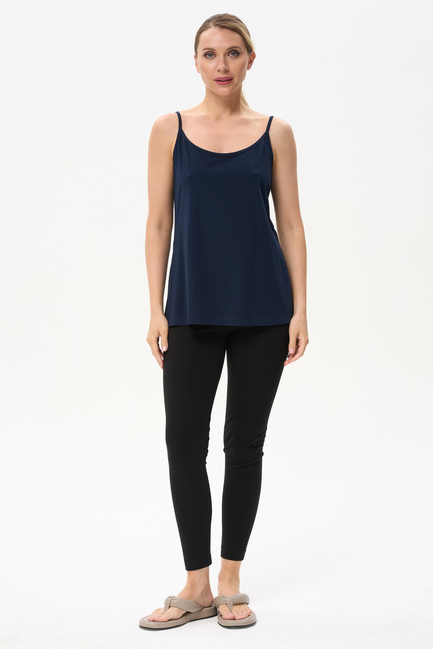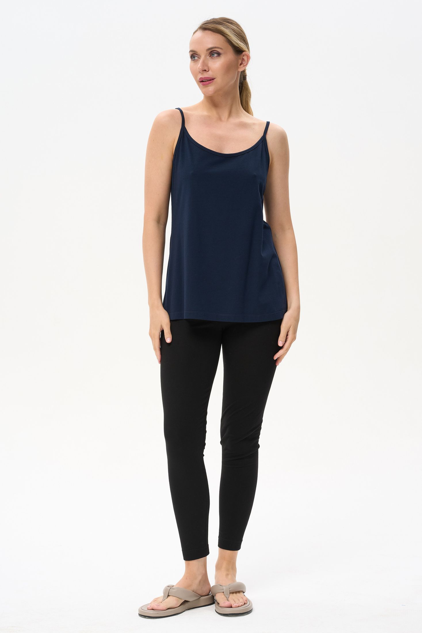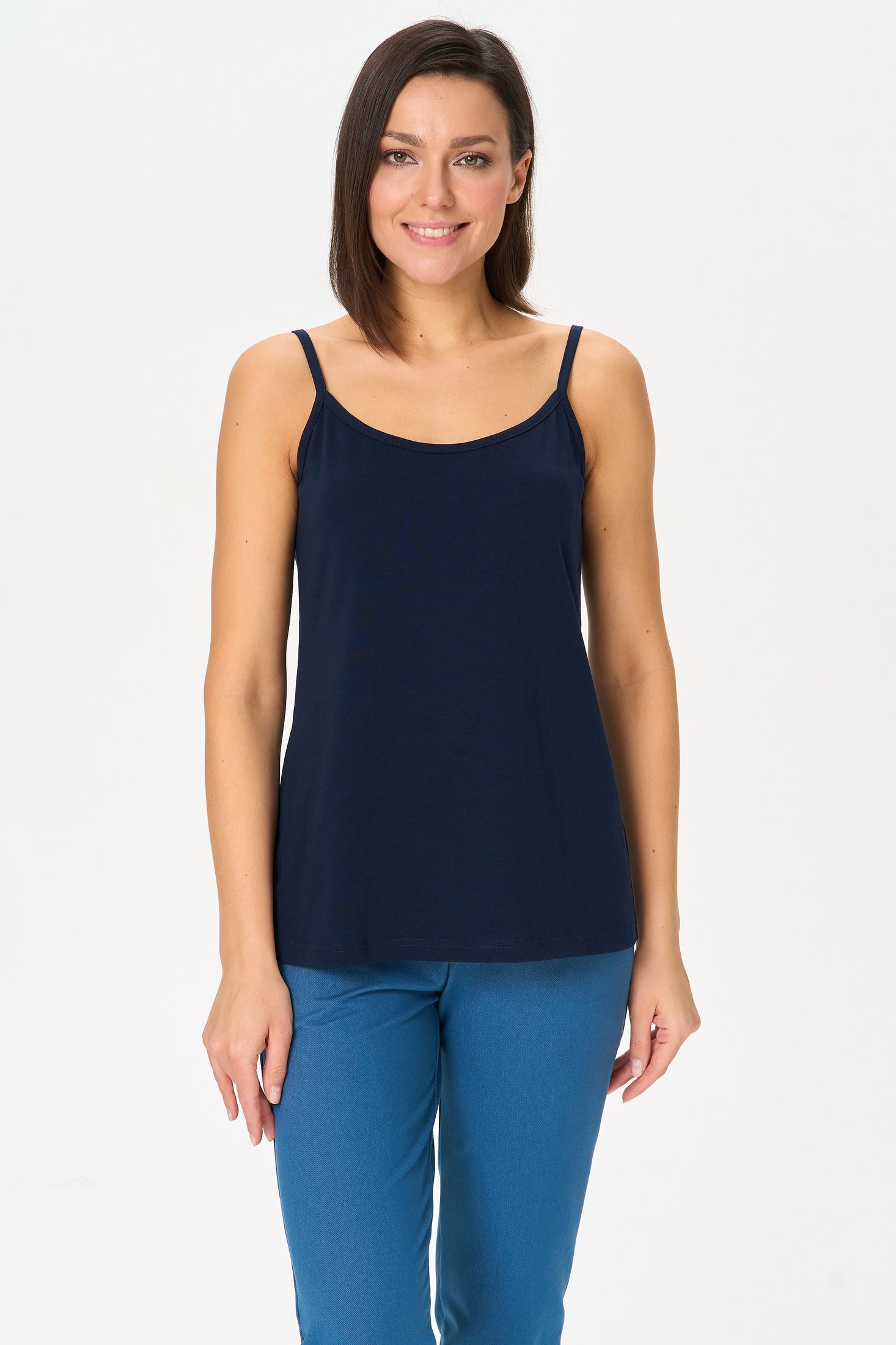 Описание: Майка на тонких бретелях из хлопкового трикотажного полотна с эластаном. Рост модели на фото 170см.
