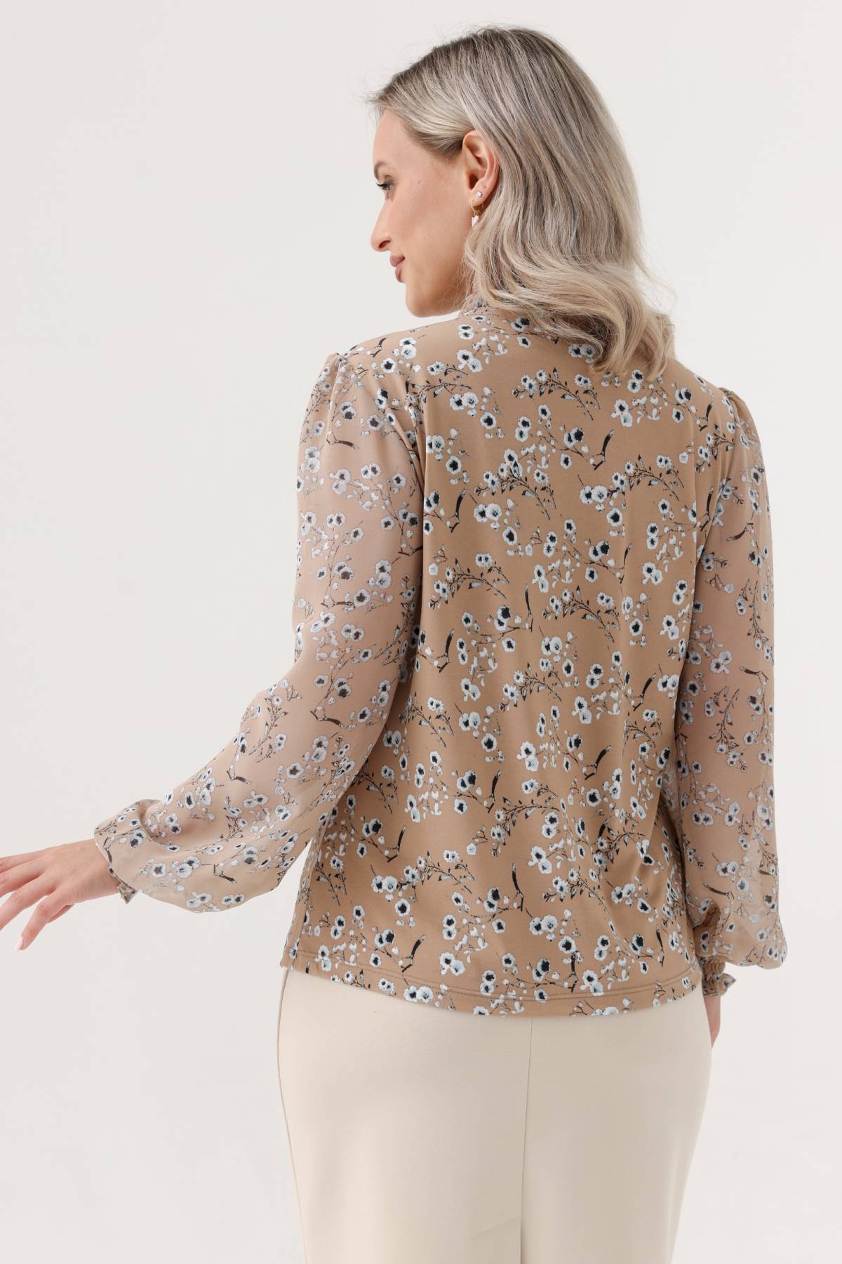 Описание: Блузка выполнена из трикотажного полотна, рукав  - шифон, на манжете. Элегантно смотрится, легко стирается, не теряет и не меняет цвет. Рукава на широком, расстрочным ниткой-резинкой, манжете. Воротник-стойка расстроченная ниткой-резинкой, что обеспечивает мягкое прилегание к шее с зявязкой спереди. Блуза прямого покроя отлично садится на любой типа фигуры. Так как в ткани используется большое количество вискозы, ткань дышащая и легко пропускает воздух, сохраняет форму и посадку даже после многочисленных стирок.  Блуза представлена в ярких, современных и модных расцветках. Блузка станет неотъемлимой частью Вашего образа.  Блуза прекрасно подходит для торжеств и повседневных мероприятий. Сочетайте блузу с брюками, юбками, и с любым типом обуви. Блузка бренда RISE - это стиль, качество и комфорт!