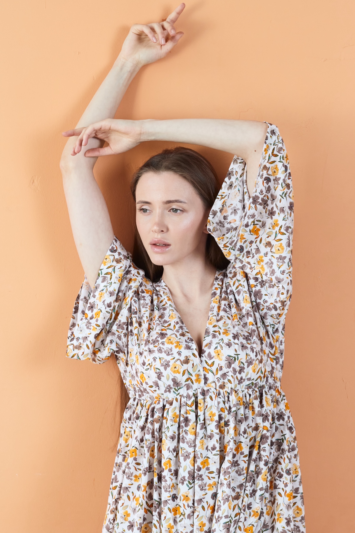 Описание: Платье мини из 100% вискоза в мелкий цветочек. Рукава - широкие. Талия на резинке под грудью.