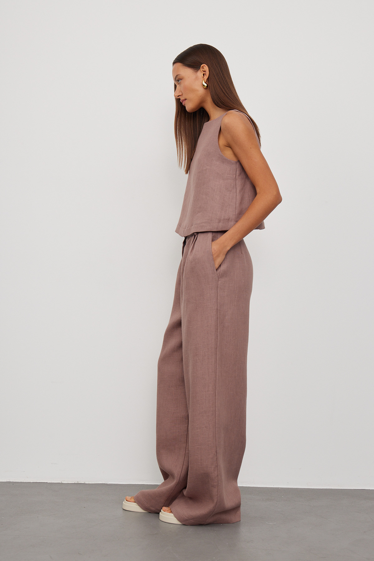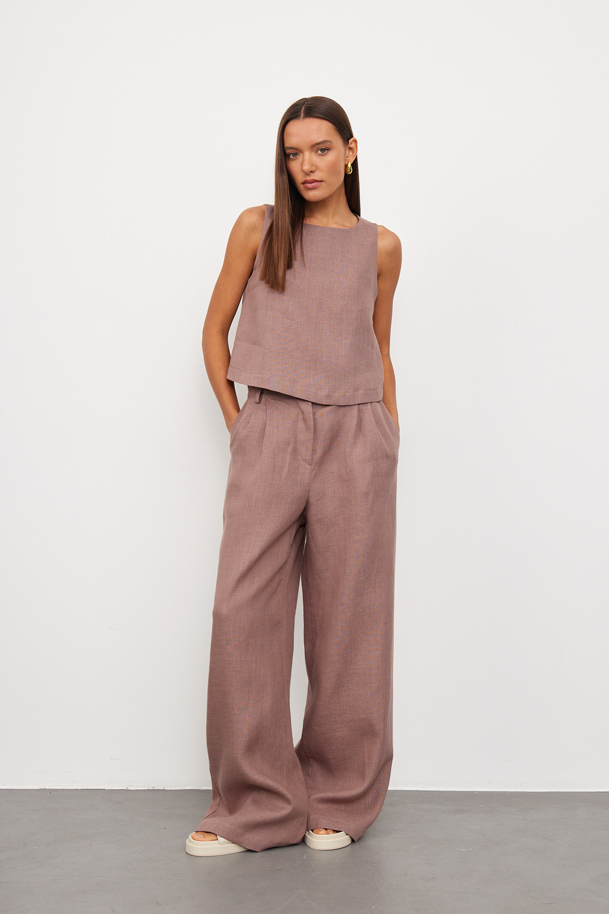 Льняной топ классического кроя на бретелях. Топ немного расклешен расклешен к низу, по бокам разрезы, посадка свободная. Модель выполнена из 100% льна высокого качества. Тонкий длинноволокнистый лен особенно прочный, отлично пропускает воздух и впитывает влагу, что делает его идеальным выбором для гардероба. Сделано в России на собственном производстве.