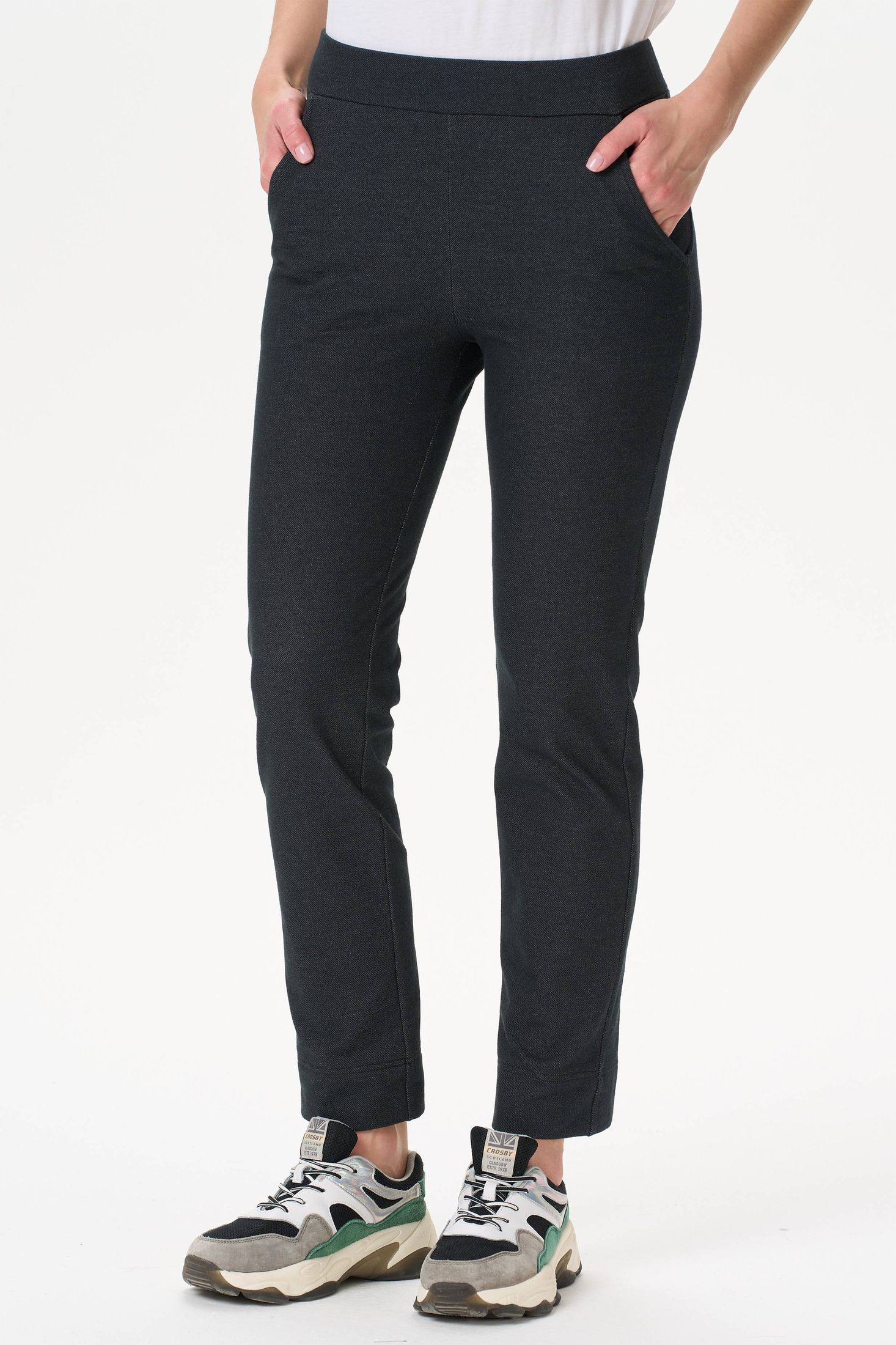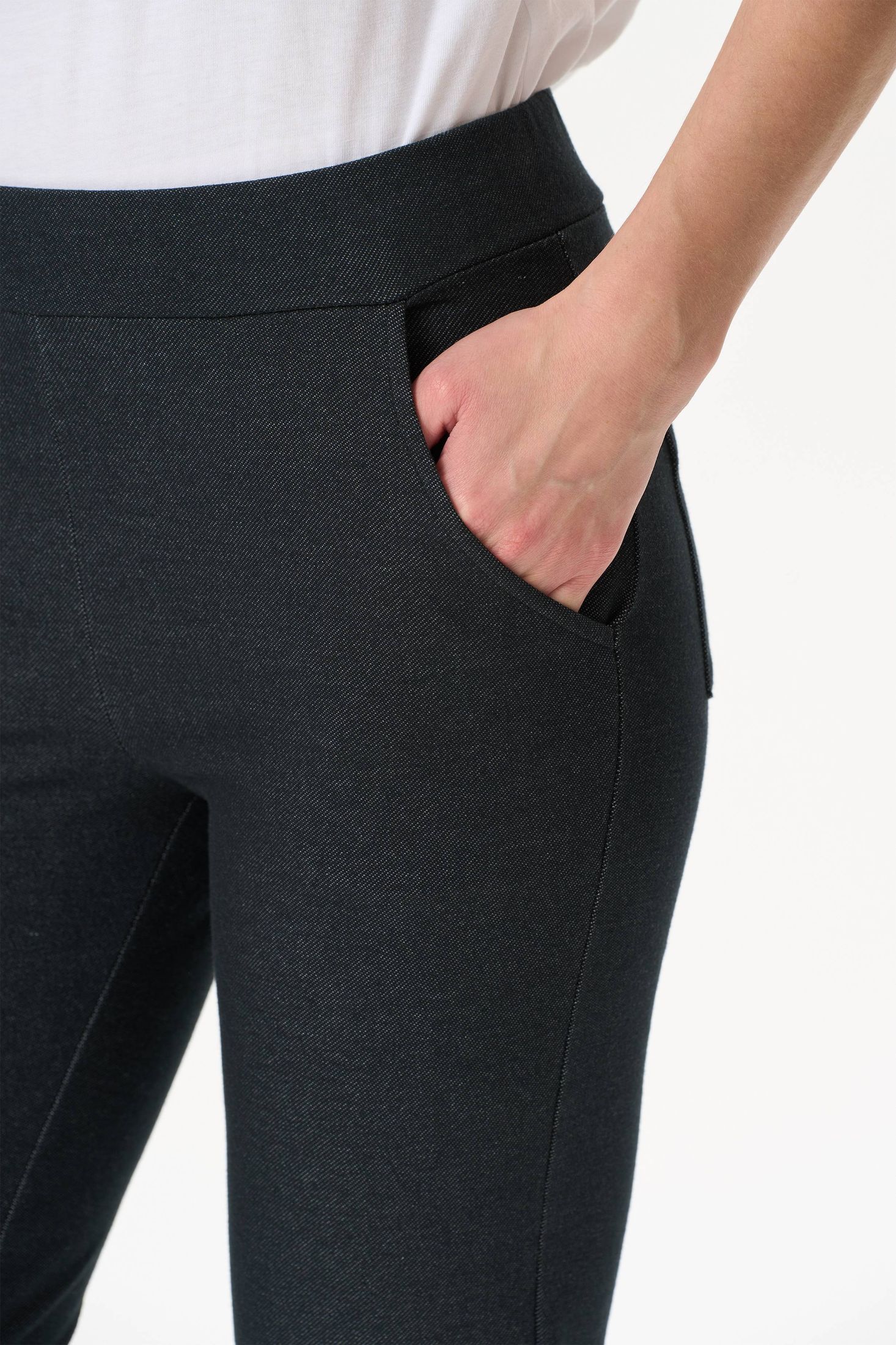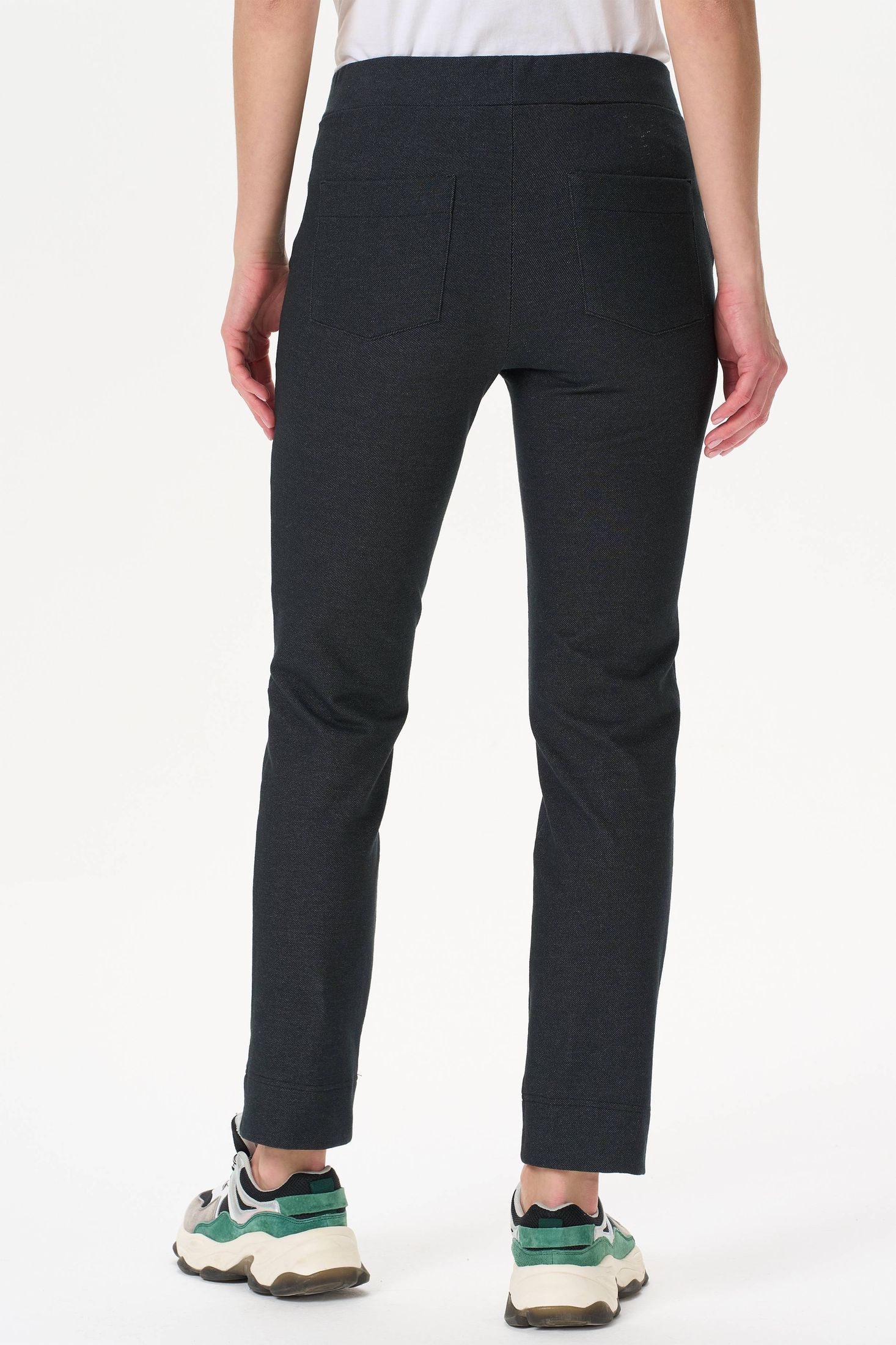 Описание: Прямые брюки с карманами из хлопкового полотна джинскотт с начесом. Пояс с эластичной лентой внутри. Сзади два накладных кармана. Длина брюк по боковому шву (без учета пояса) в 44 размере - 94см. Рост модели на фото 177