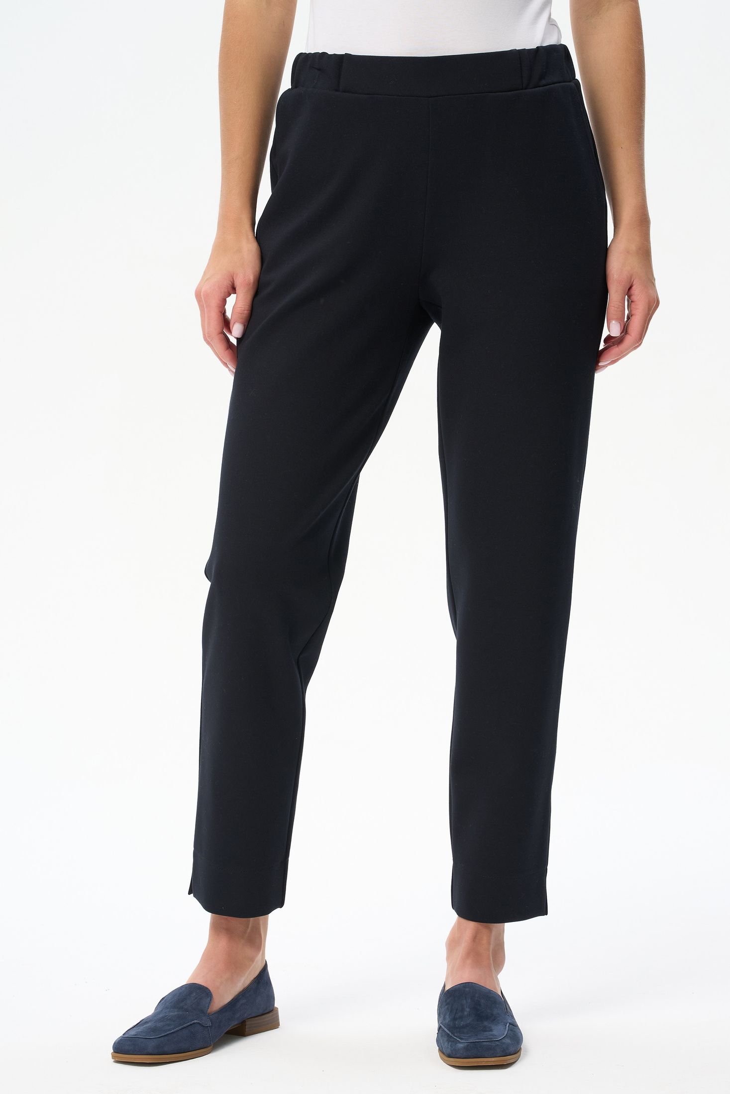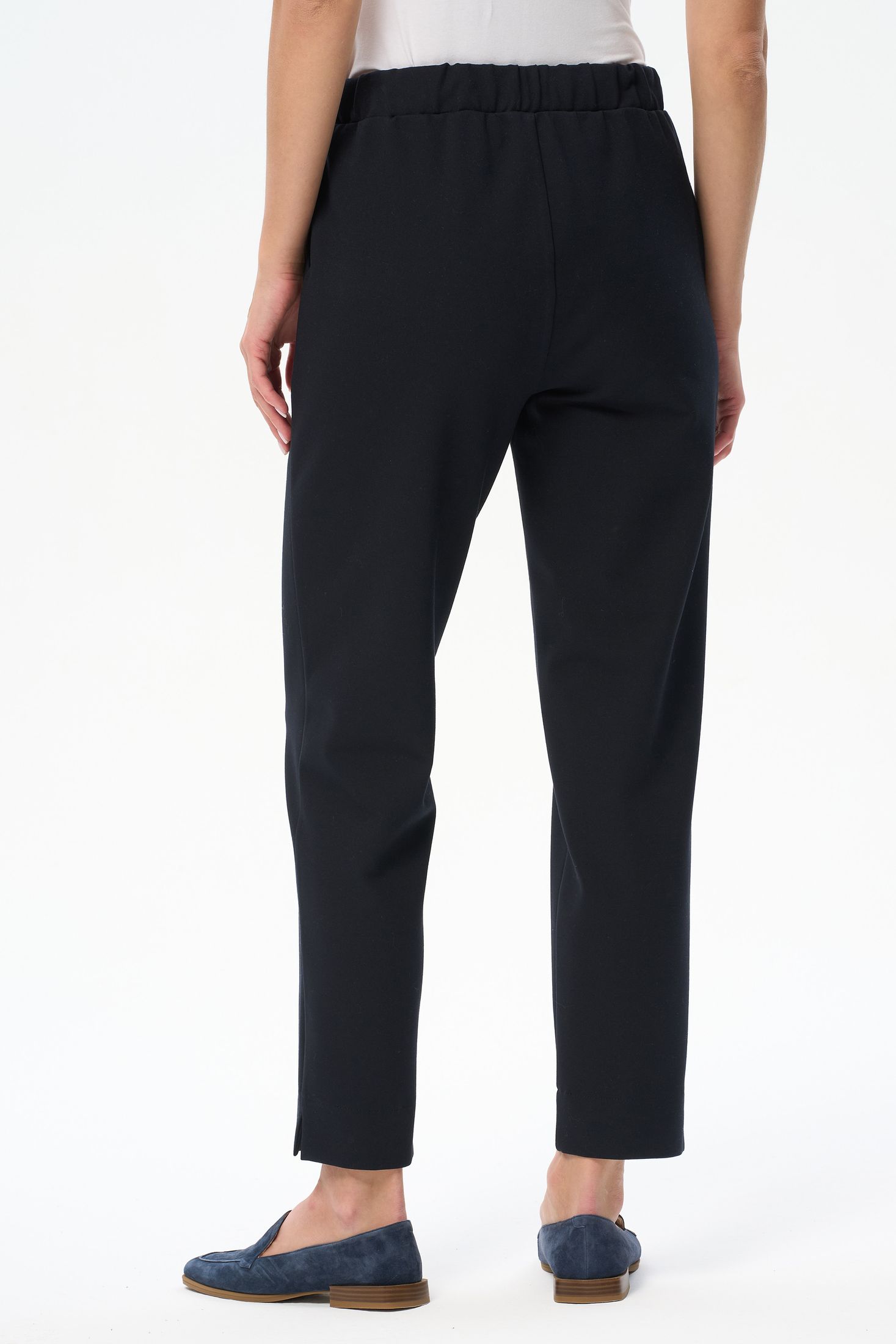 Описание: Зауженные брюки, выполнены из плотного трикотажного полотна- бистрейч. Пояс с планкой и эластичной лентой внутри. Фигурные карманы. По низу боковых швов разрезы. Длина по боковому шву (без пояса) в 44 размере 94 см. Рост модели на фото 178 см.