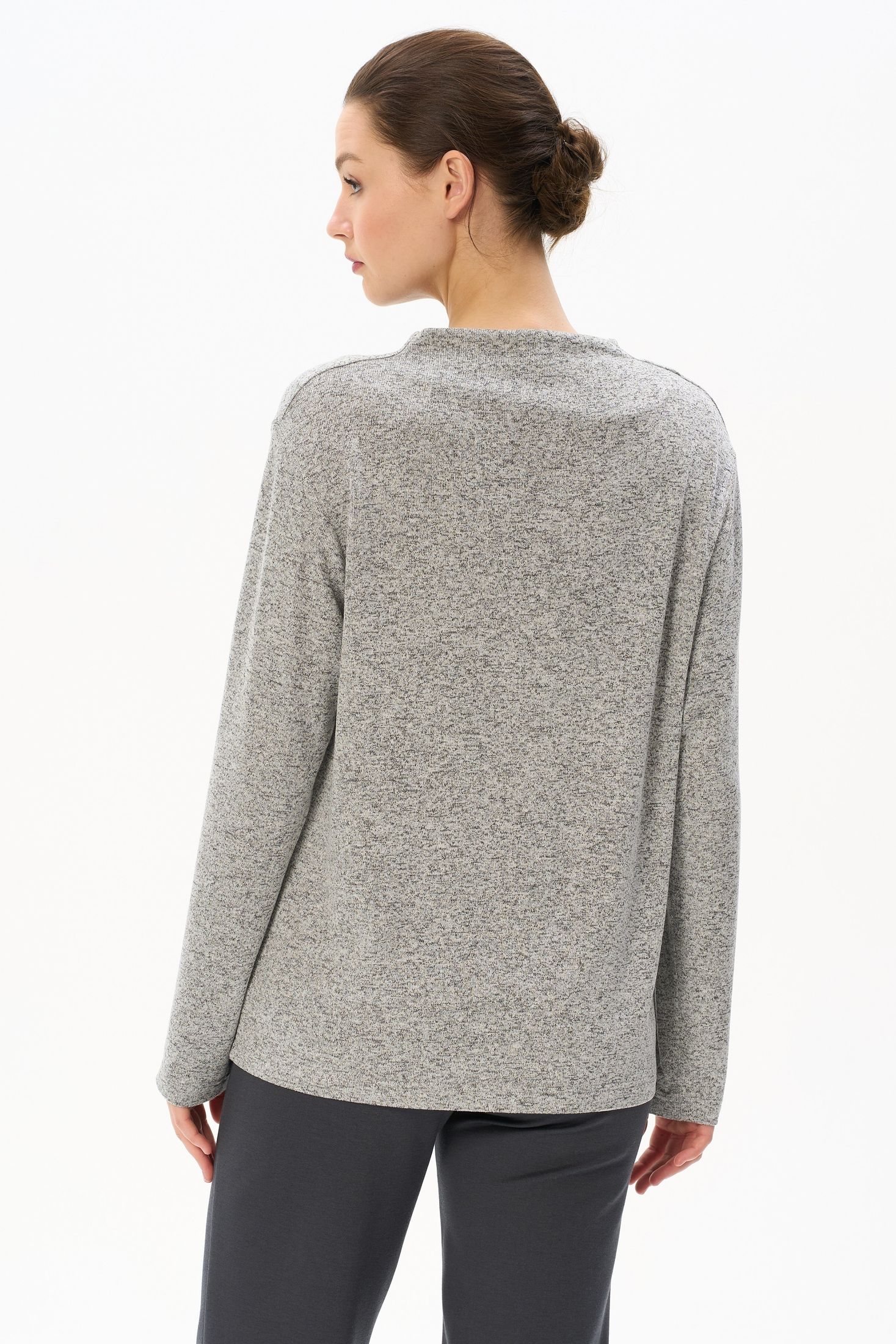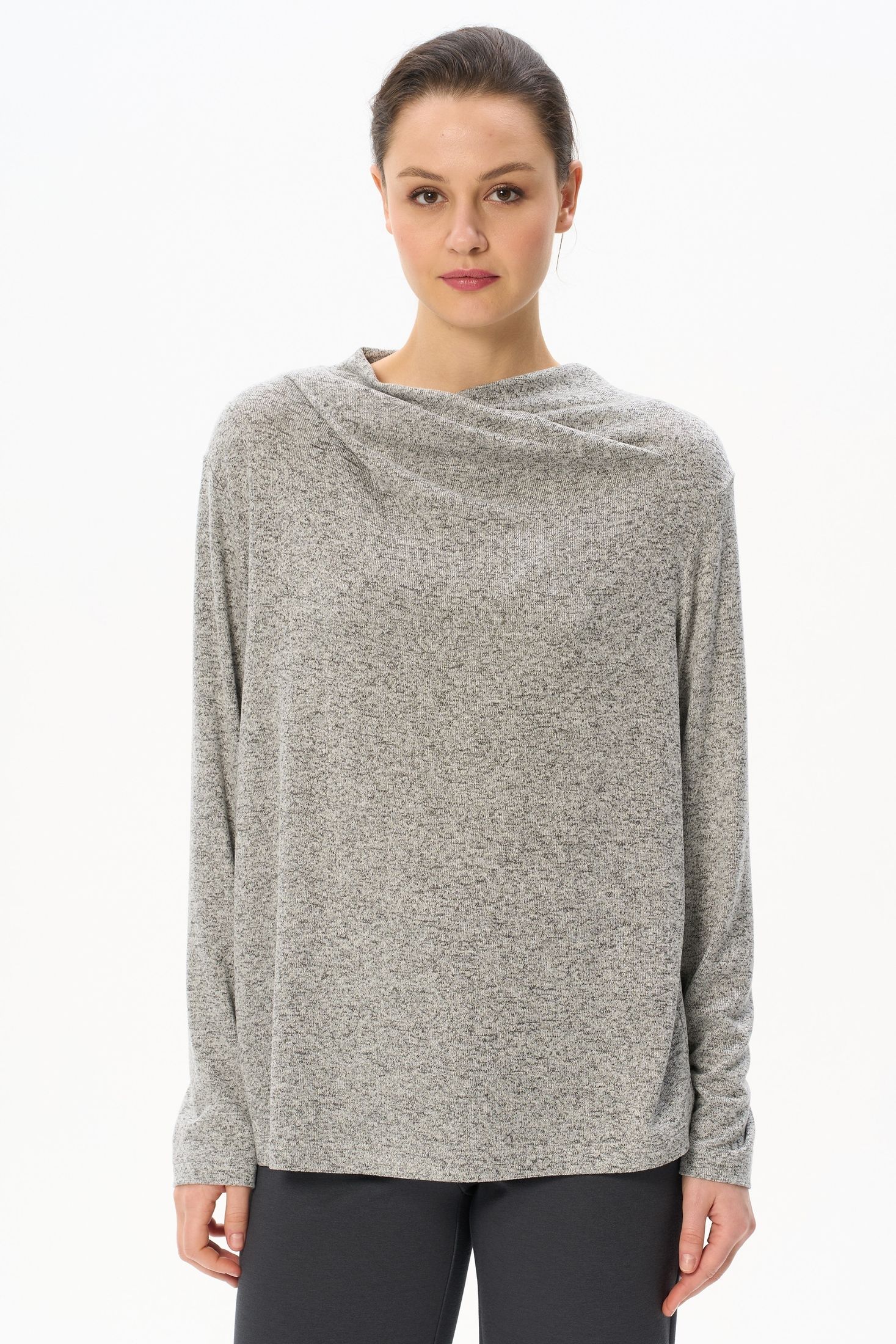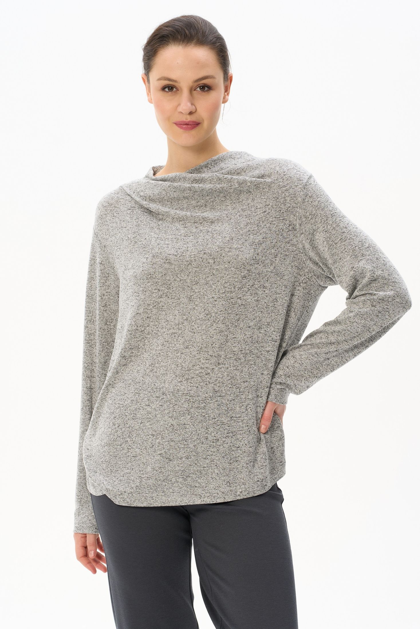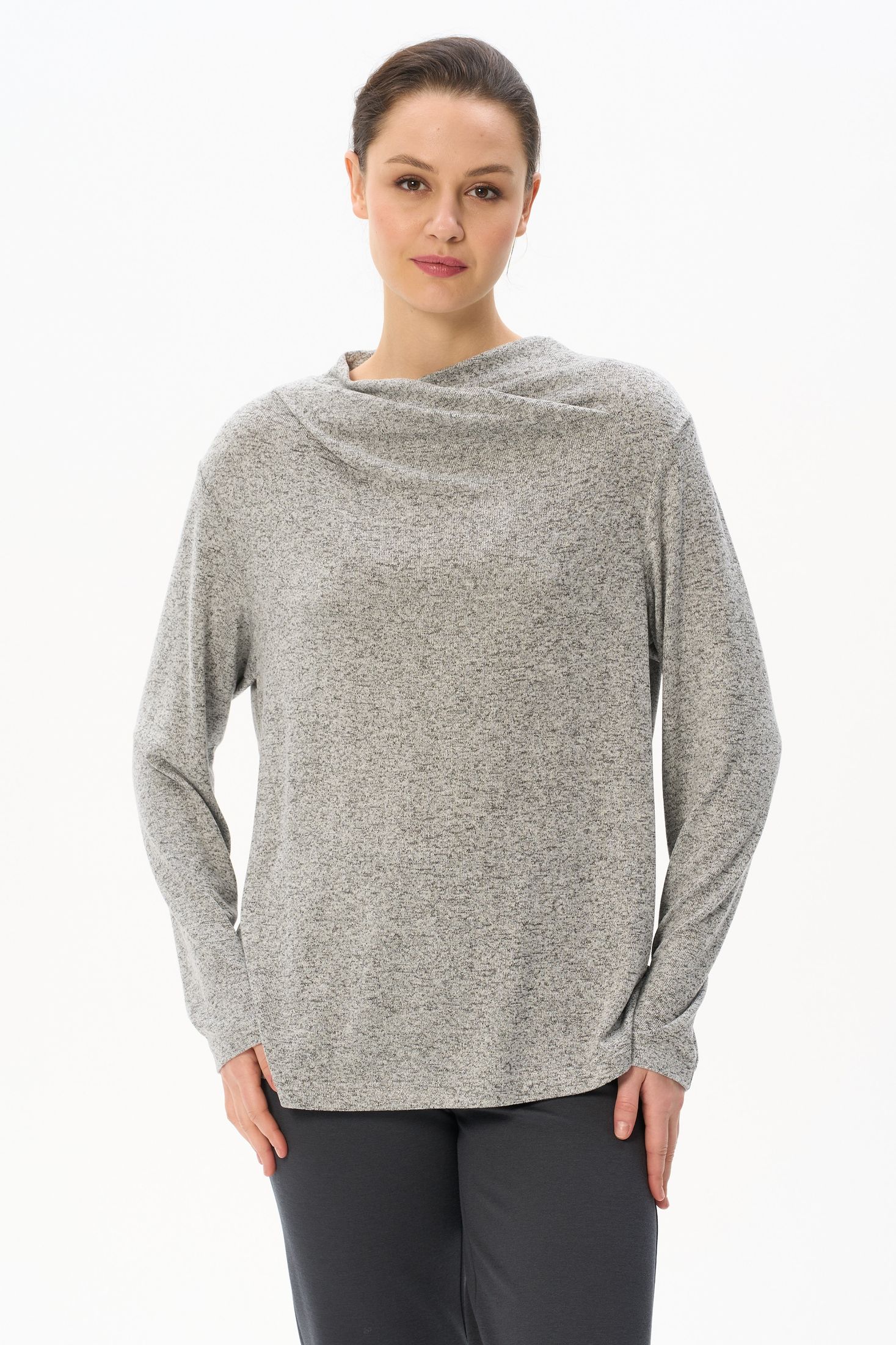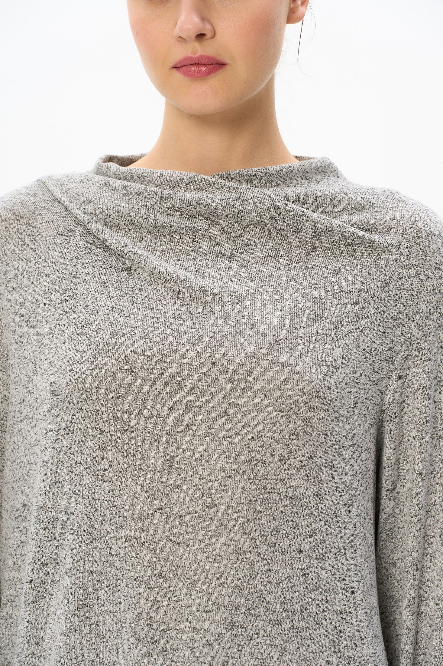 Описание: Джемпер выполнен из вискозного меланжа. Вырез горловины драпируется и закладывается естественными складками. Спущенная линия плеча, втачные рукава. Рост модели на фото 178 см