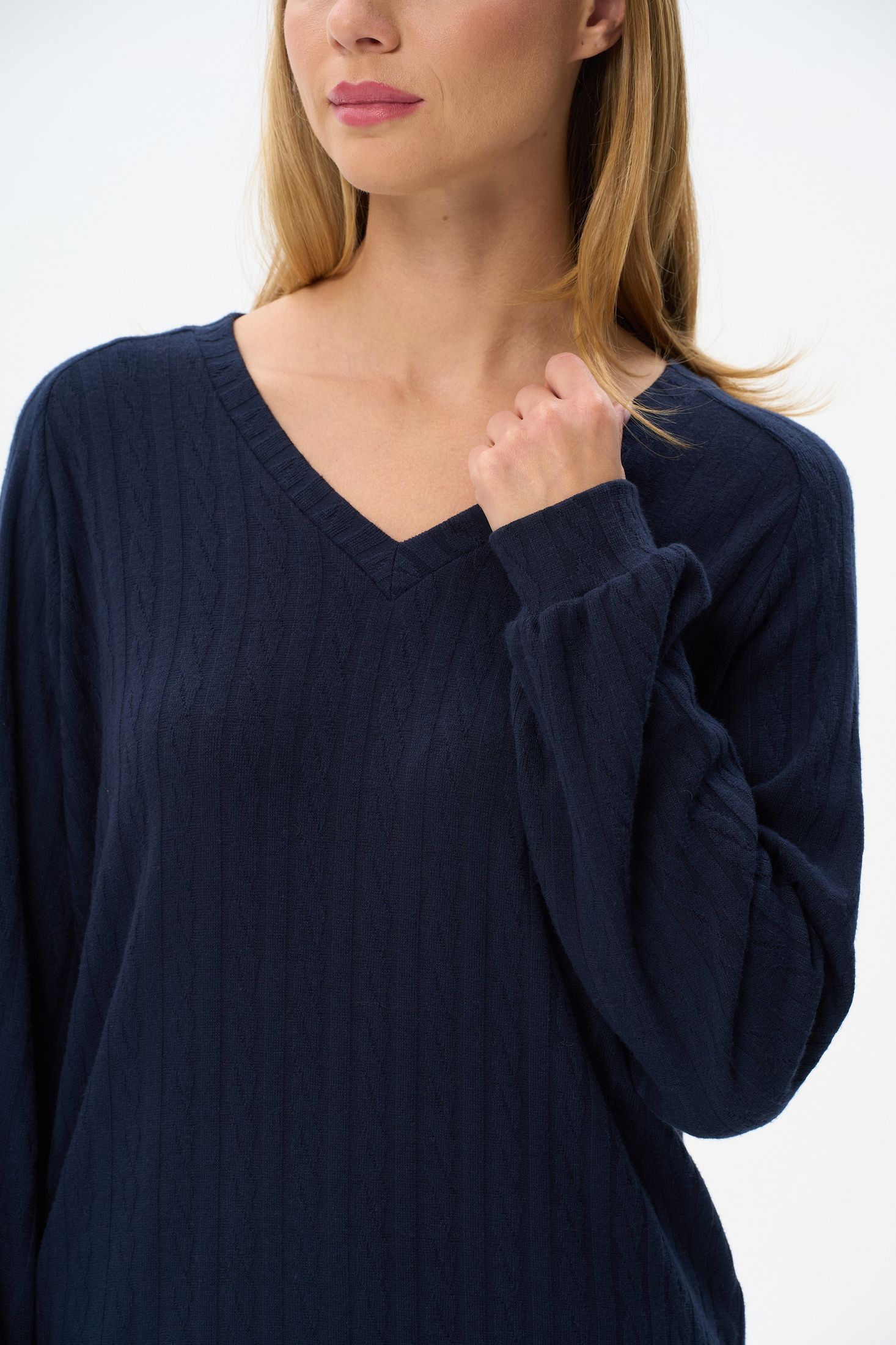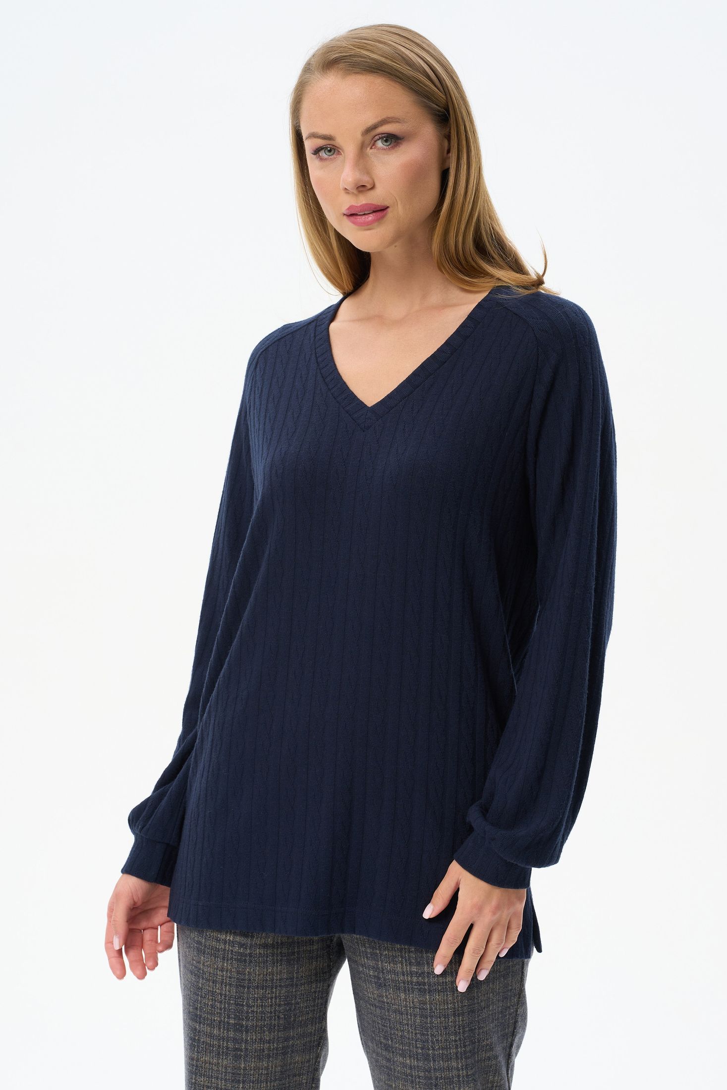 Описание: Теплый джемпер из фактурного вискозного полотна. V-образный вырез горловины, длинные рукава реглан на манжетах, по низу боковых швов разрезы. Рост модели на фото 178см.