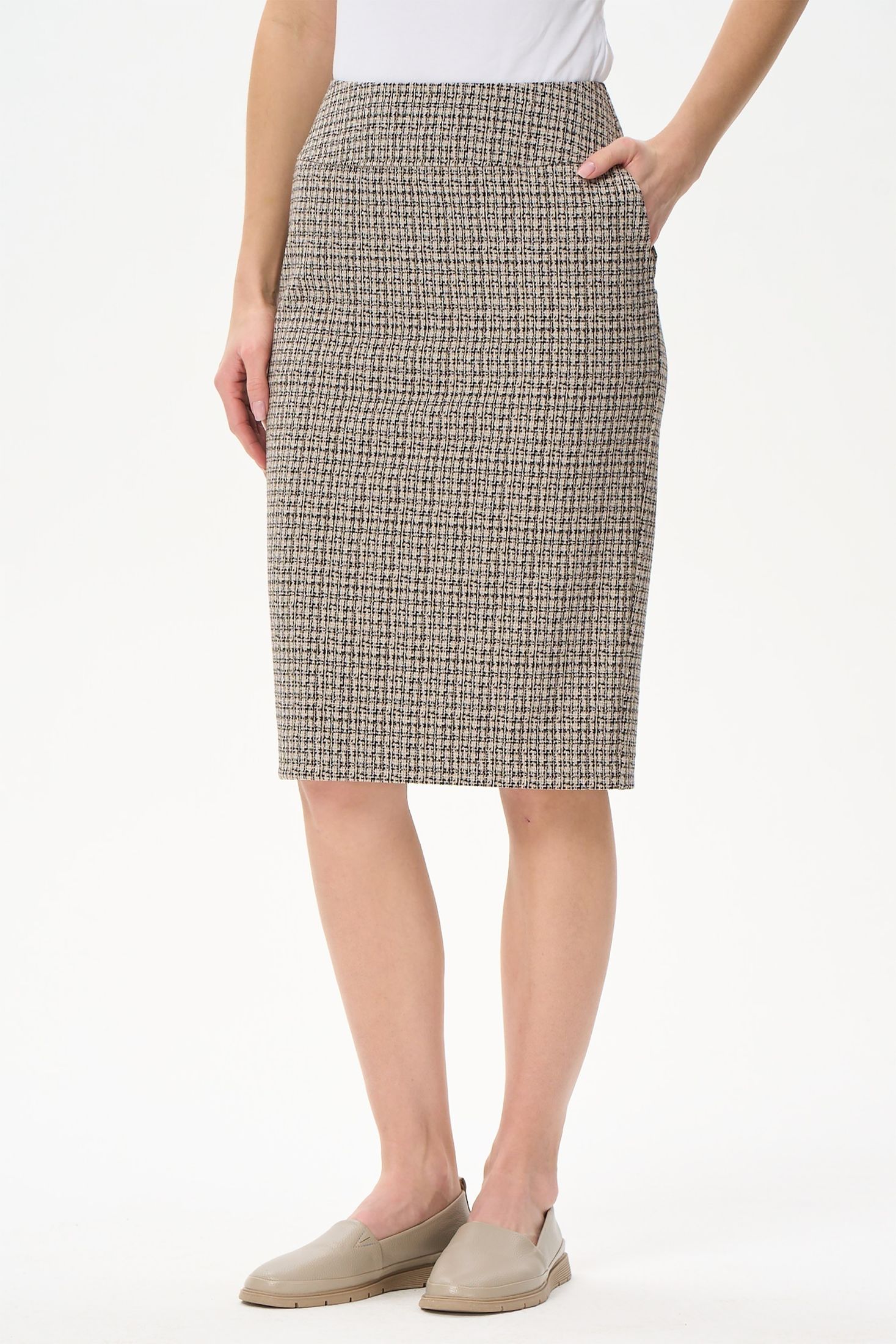 Описание: Классическая юбка со шлицей на подкладке, выполнена из вискозного жаккардового трикотажного полотна. Спереди кокетка и карманы. Застежка на потайную молнию. Длина изделия ниже колена. Рост модели на фото 178см