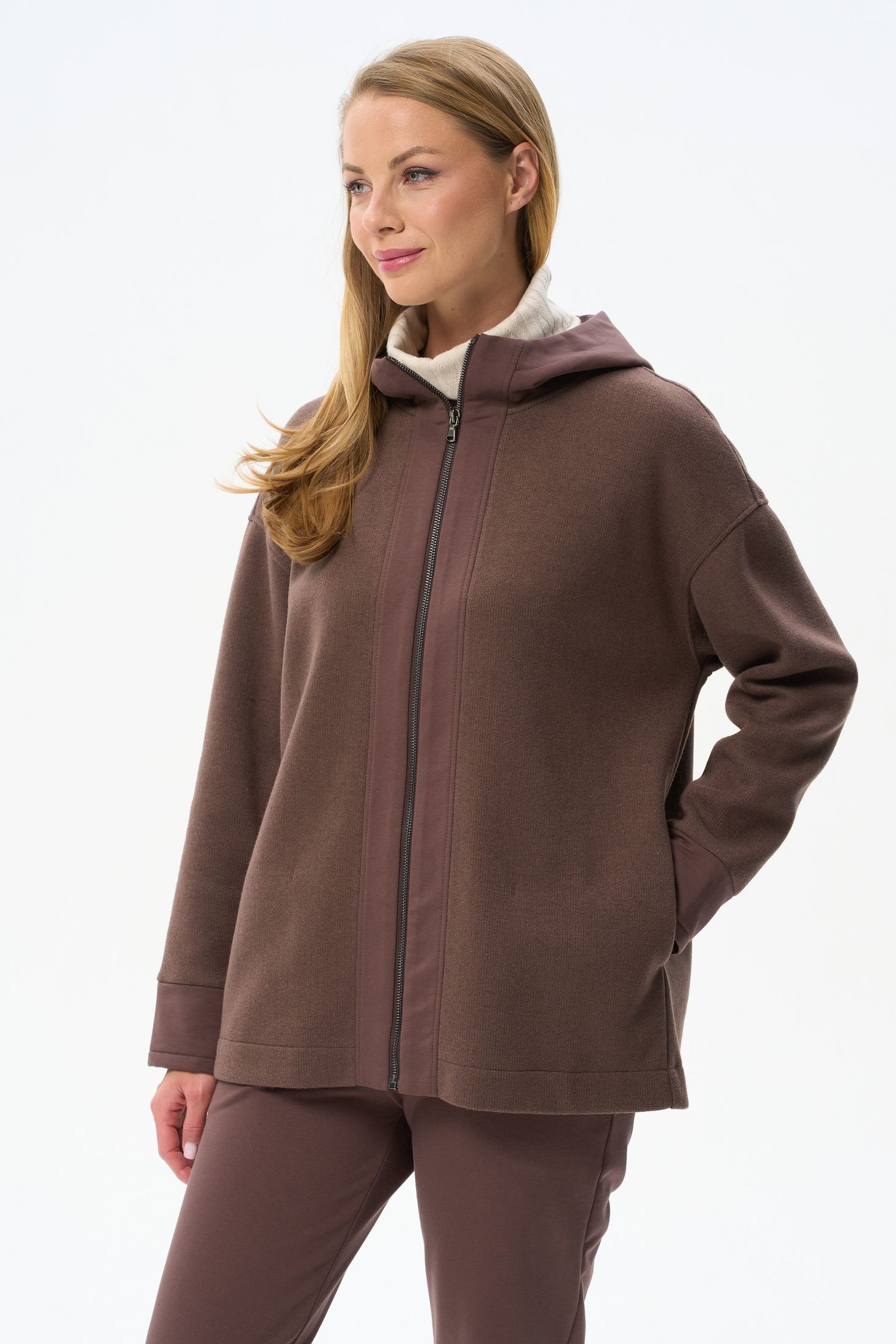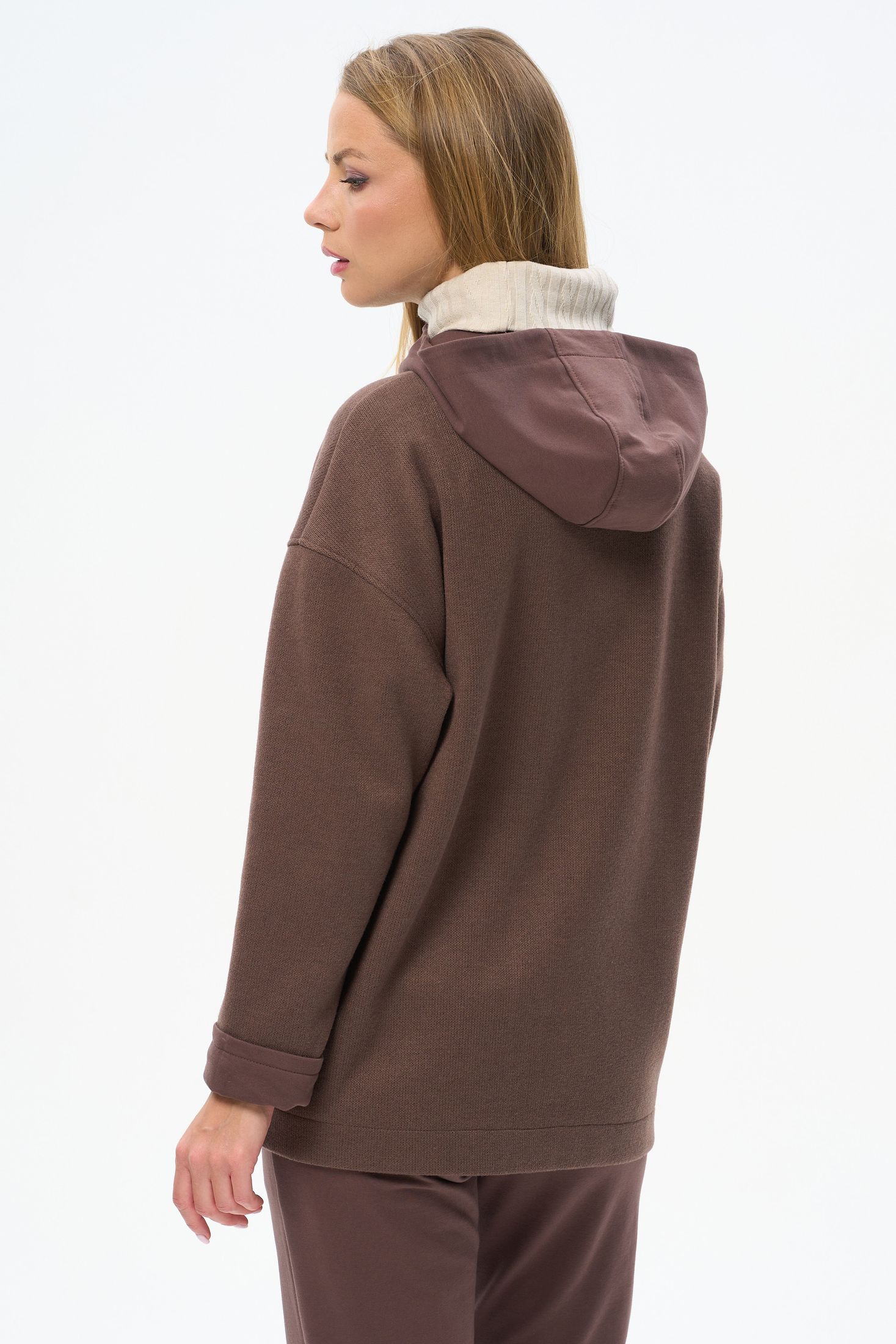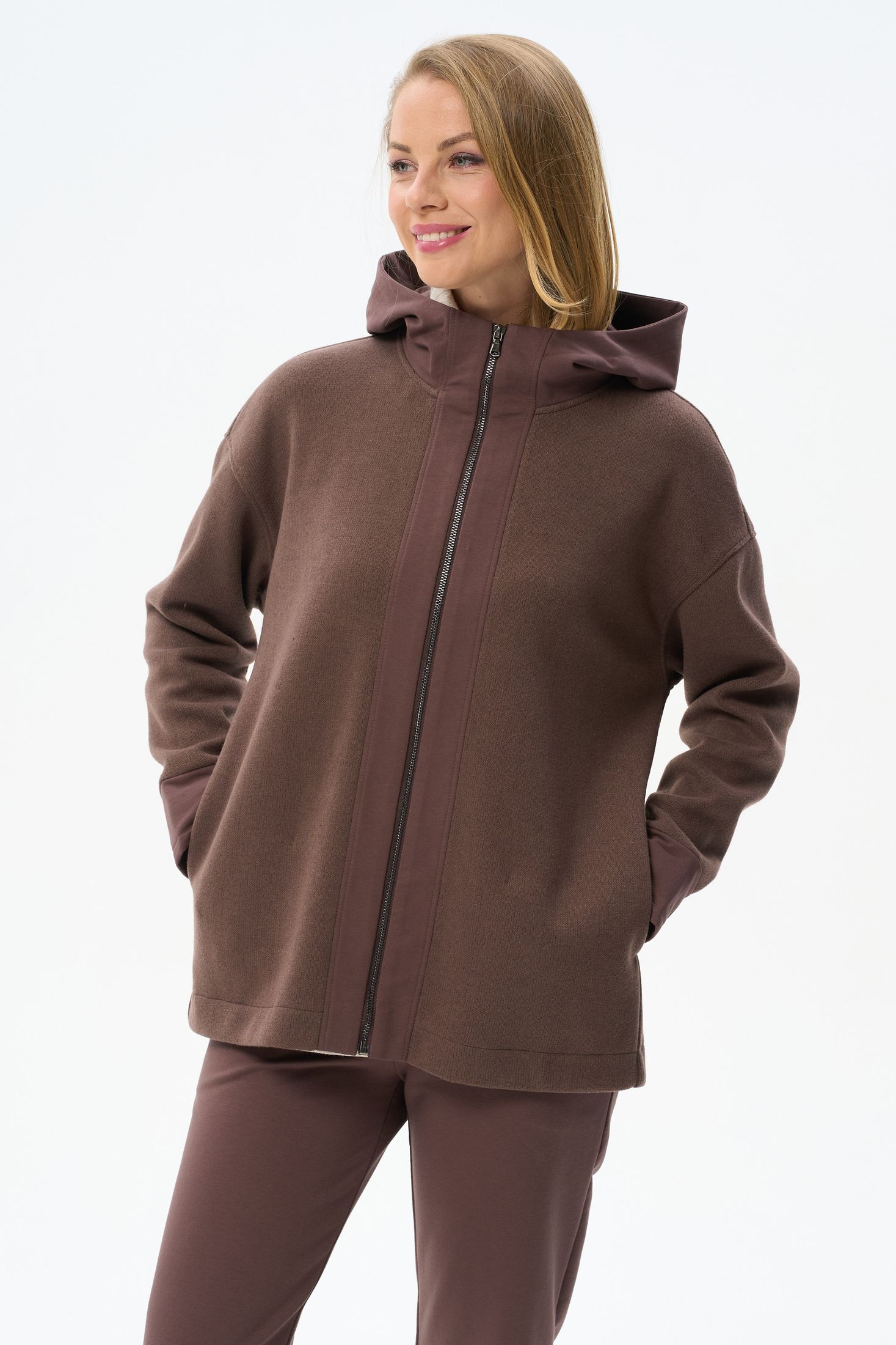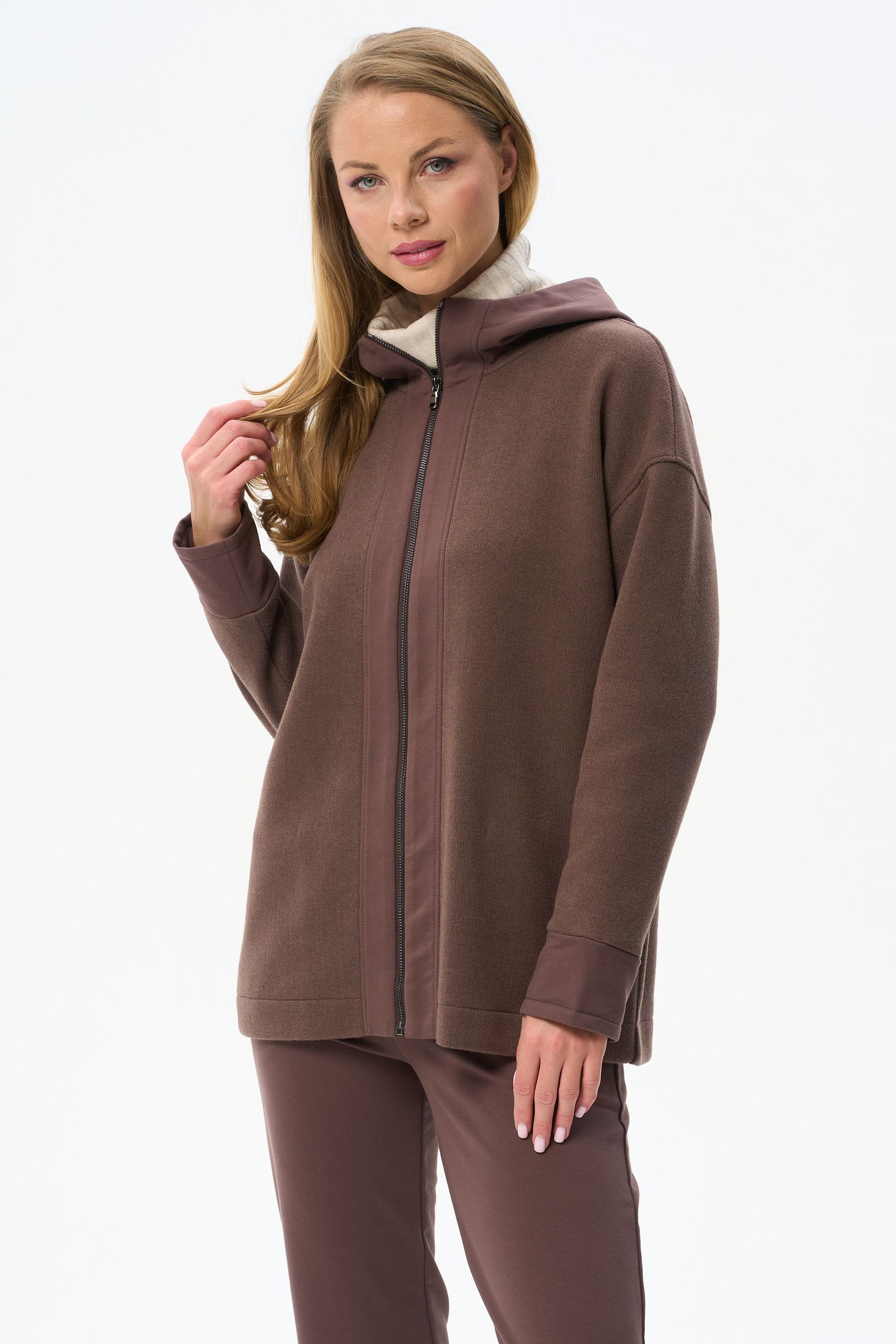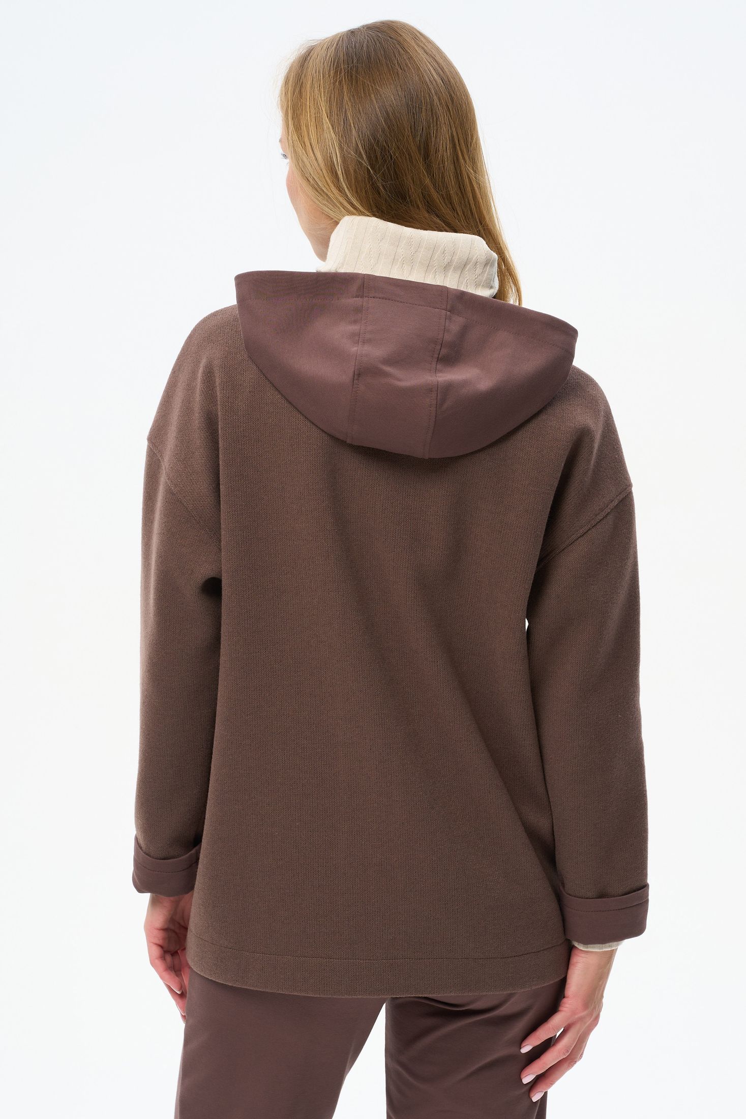 Описание: Комбинированная куртка с втачными рукавами, выполнена с молнией в цвет изделия. Основное полотно жаккард - с лицевой стороны как вязаное полотно, с изнанки - с гладкой поверхностью. Капюшон, планка, подборт и манжеты - из гладкого тонкого футера. Манжеты - с наполнением из мягкого синтепона. Рост модели на фото 178 см.
