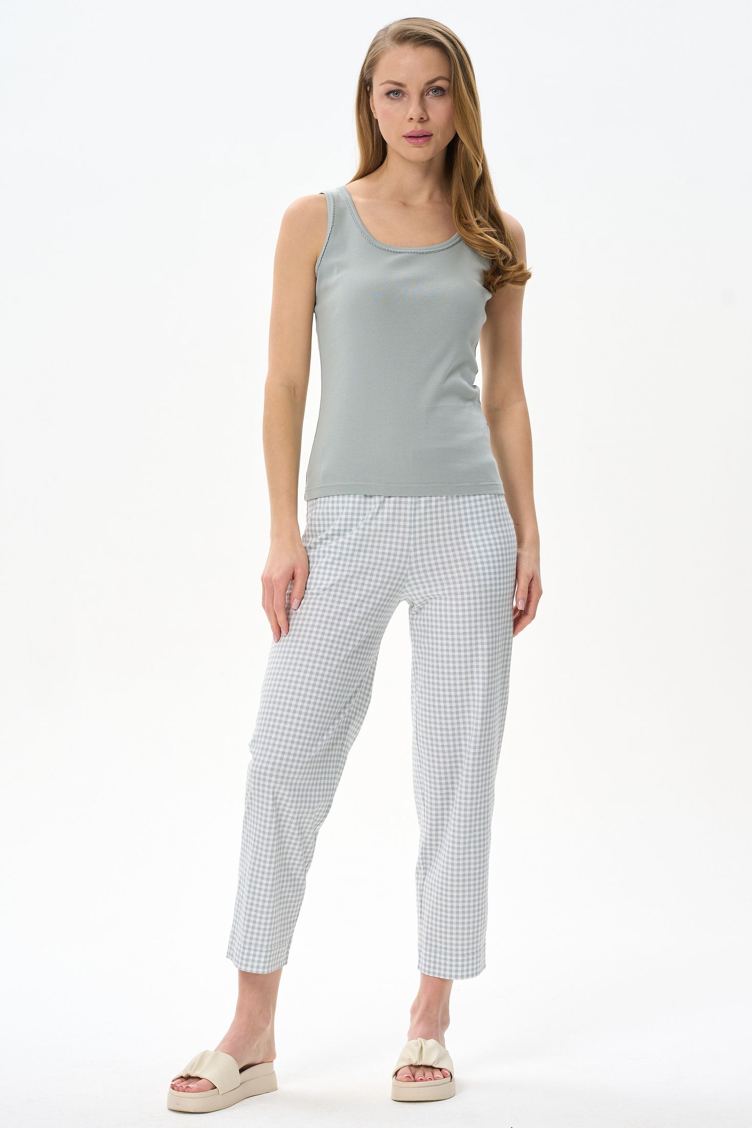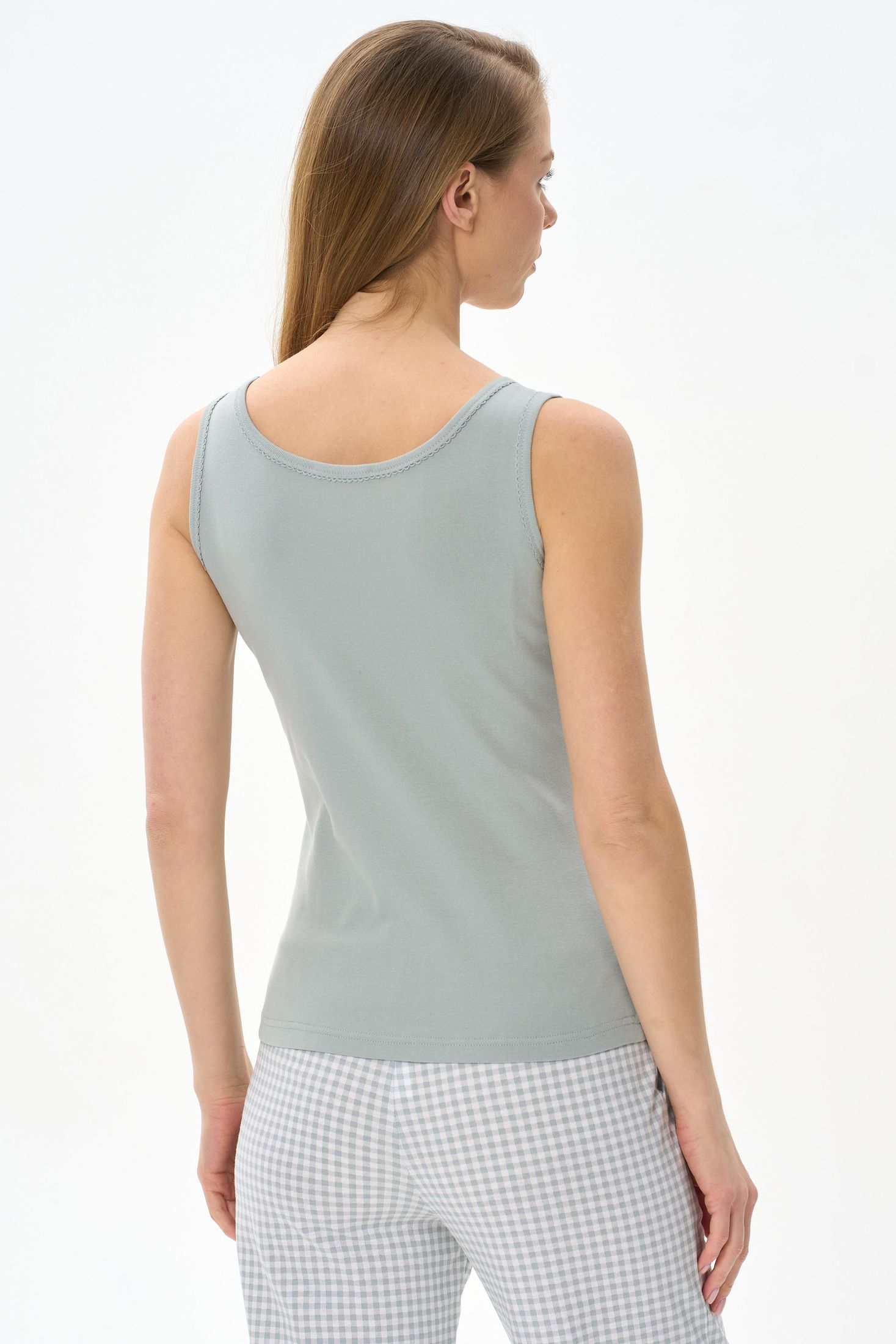 Описание: Комфортная майка из хлопкового трикотажного полотна рибана. Вырез горловины и проймы окантованы. Рост модели на фото 175 см.