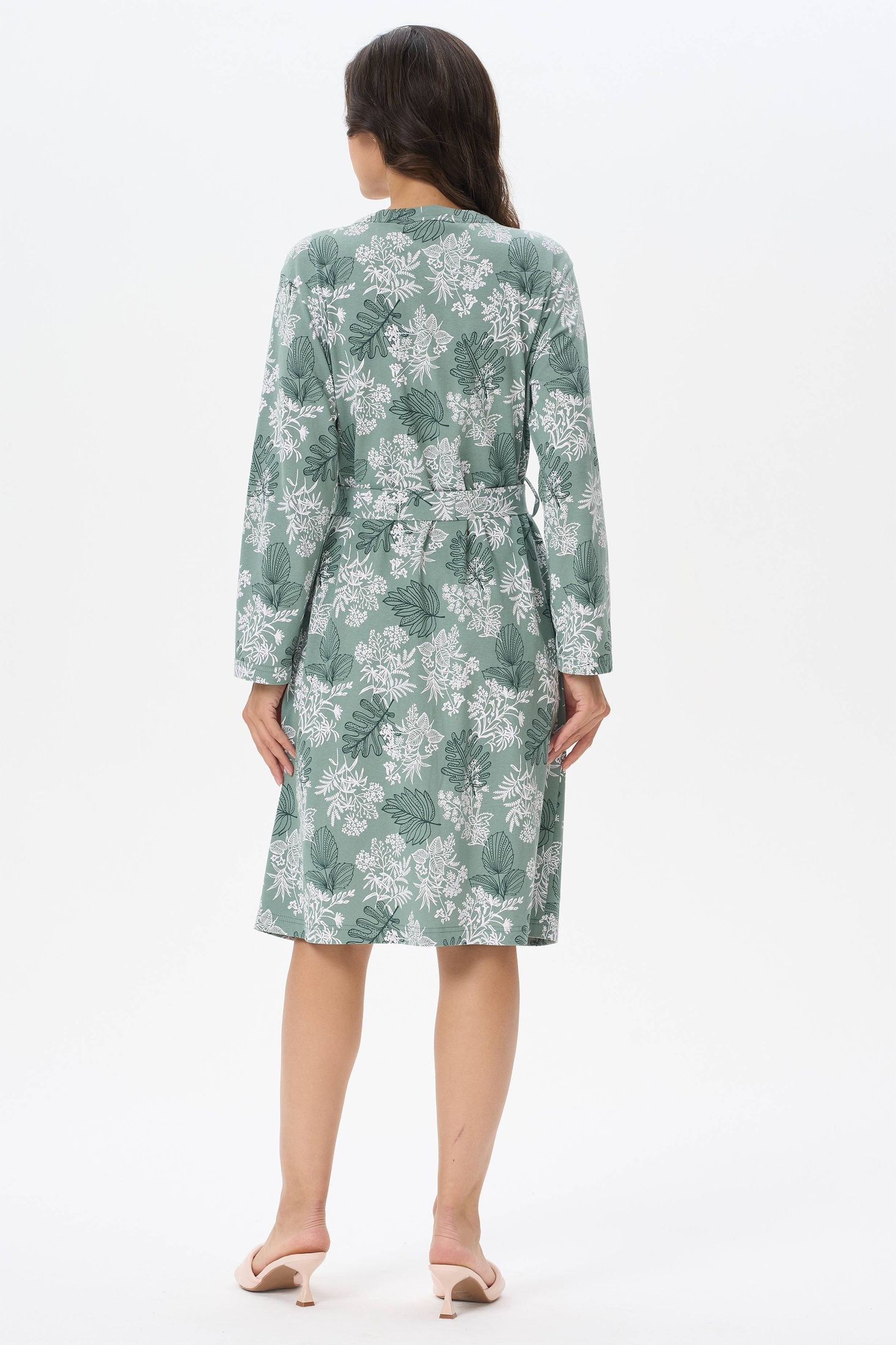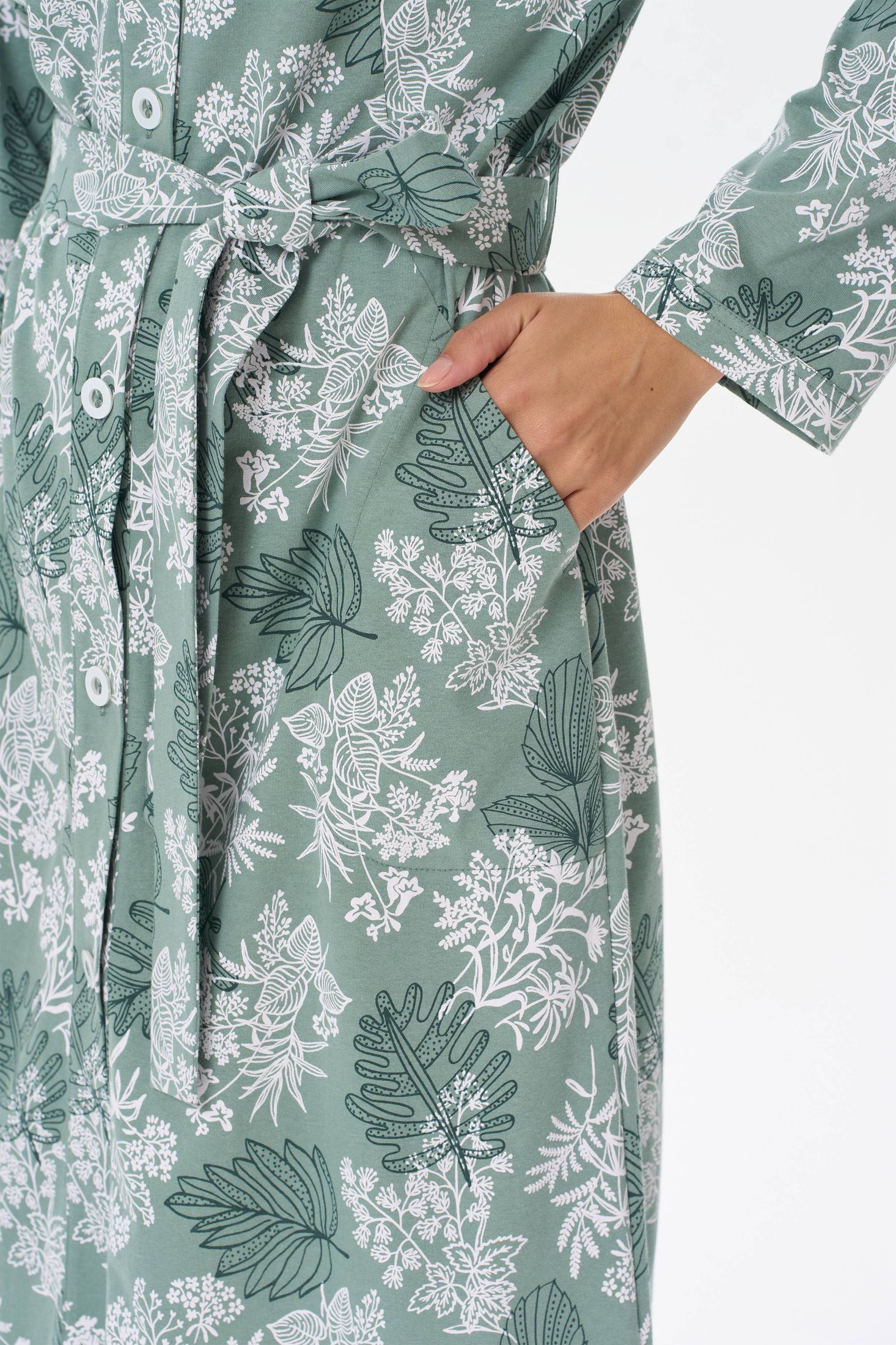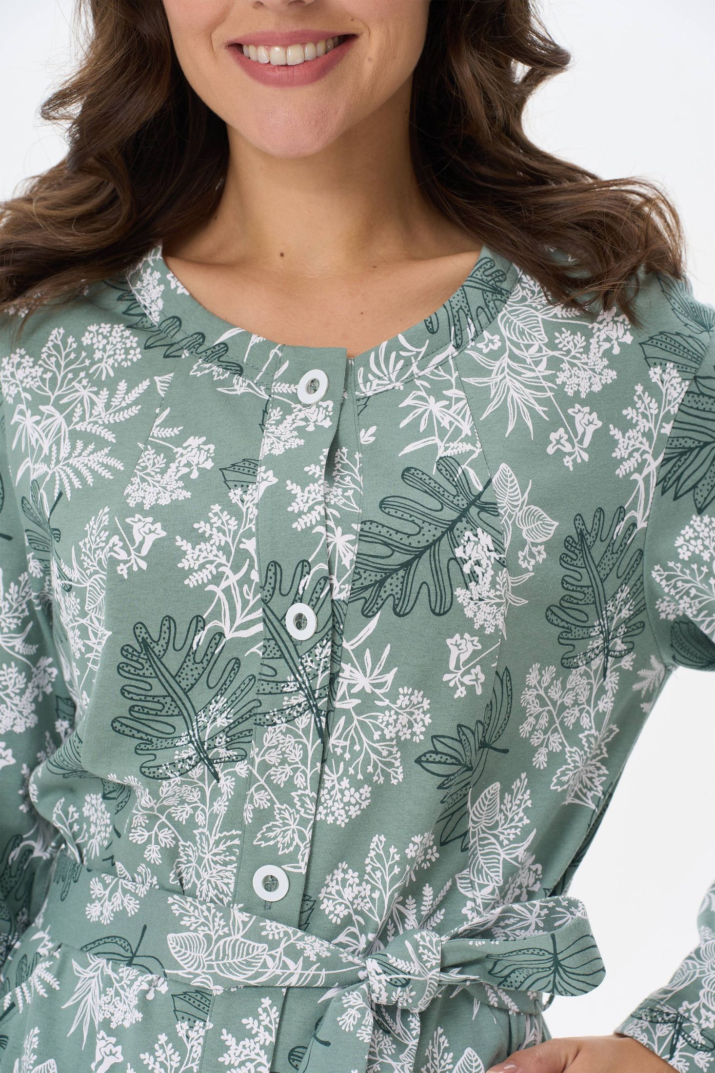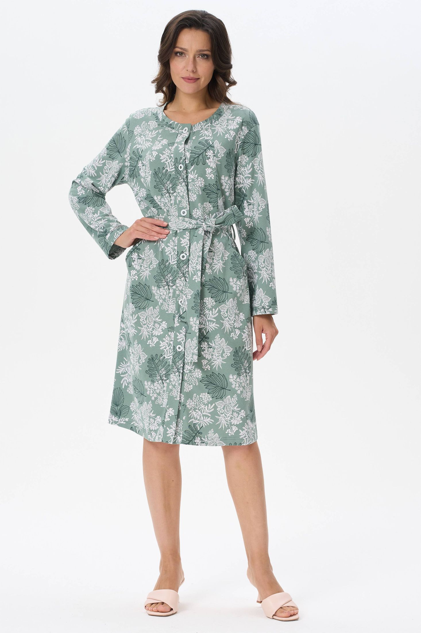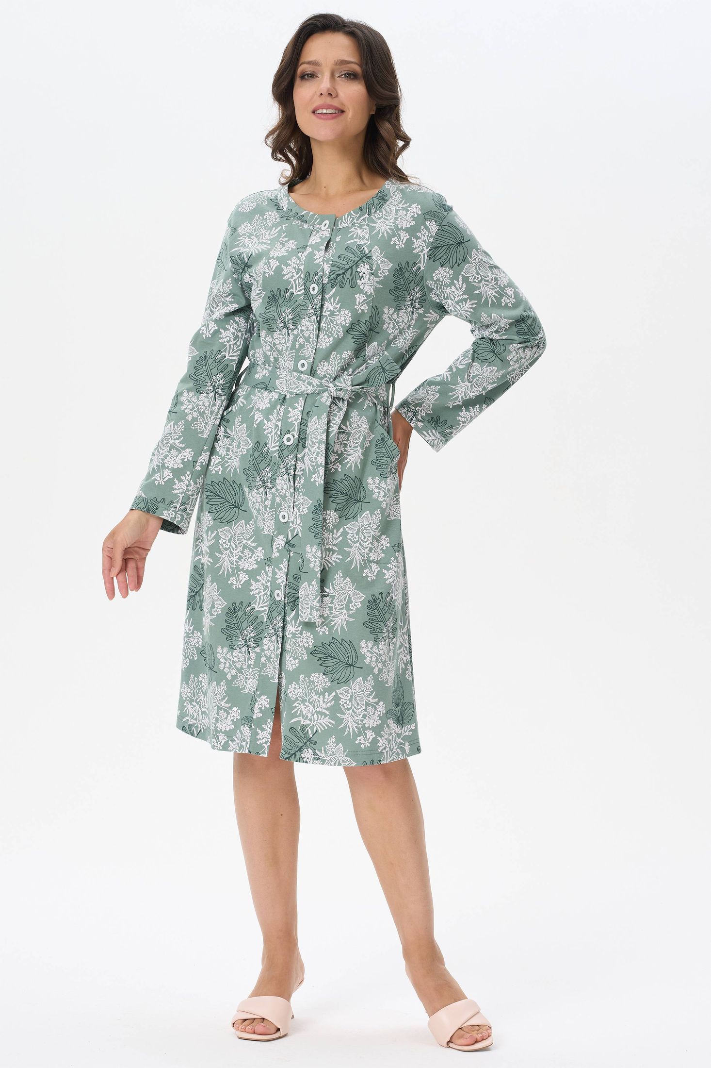 Описание: Халат с поясом, полуприлегающего силуэта из хлопкового трикотажного полотна. Круглый вырез горловины, центральная застежка на пуговицы. В подрезах полочки карманы. Длиные втачные рукава. Длина изделия до колена. Рост модели на фото 178 см.