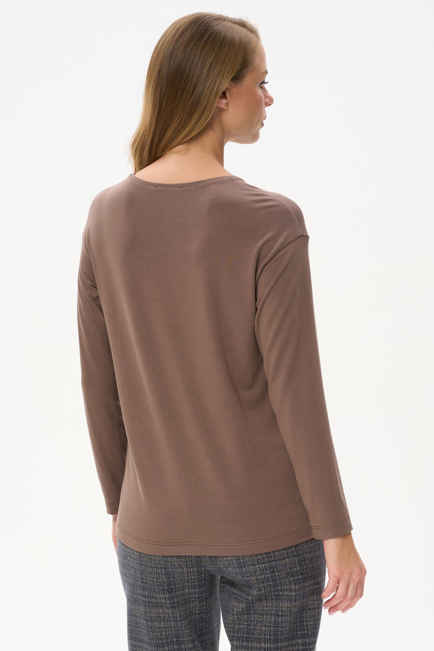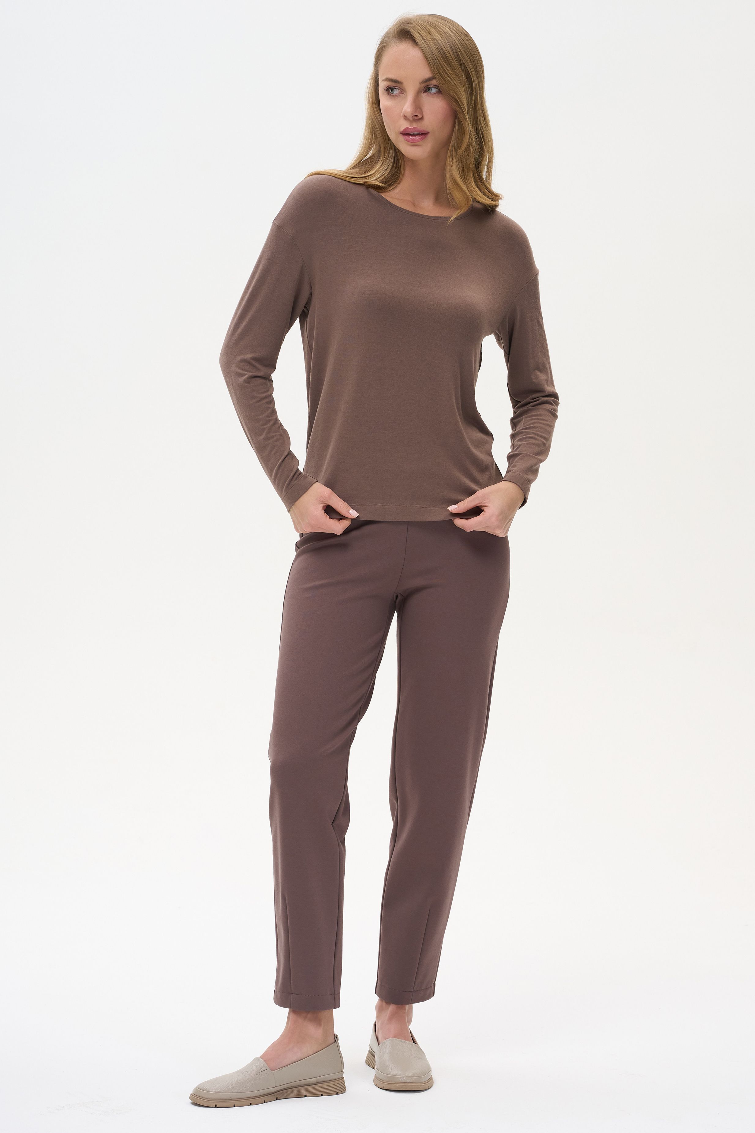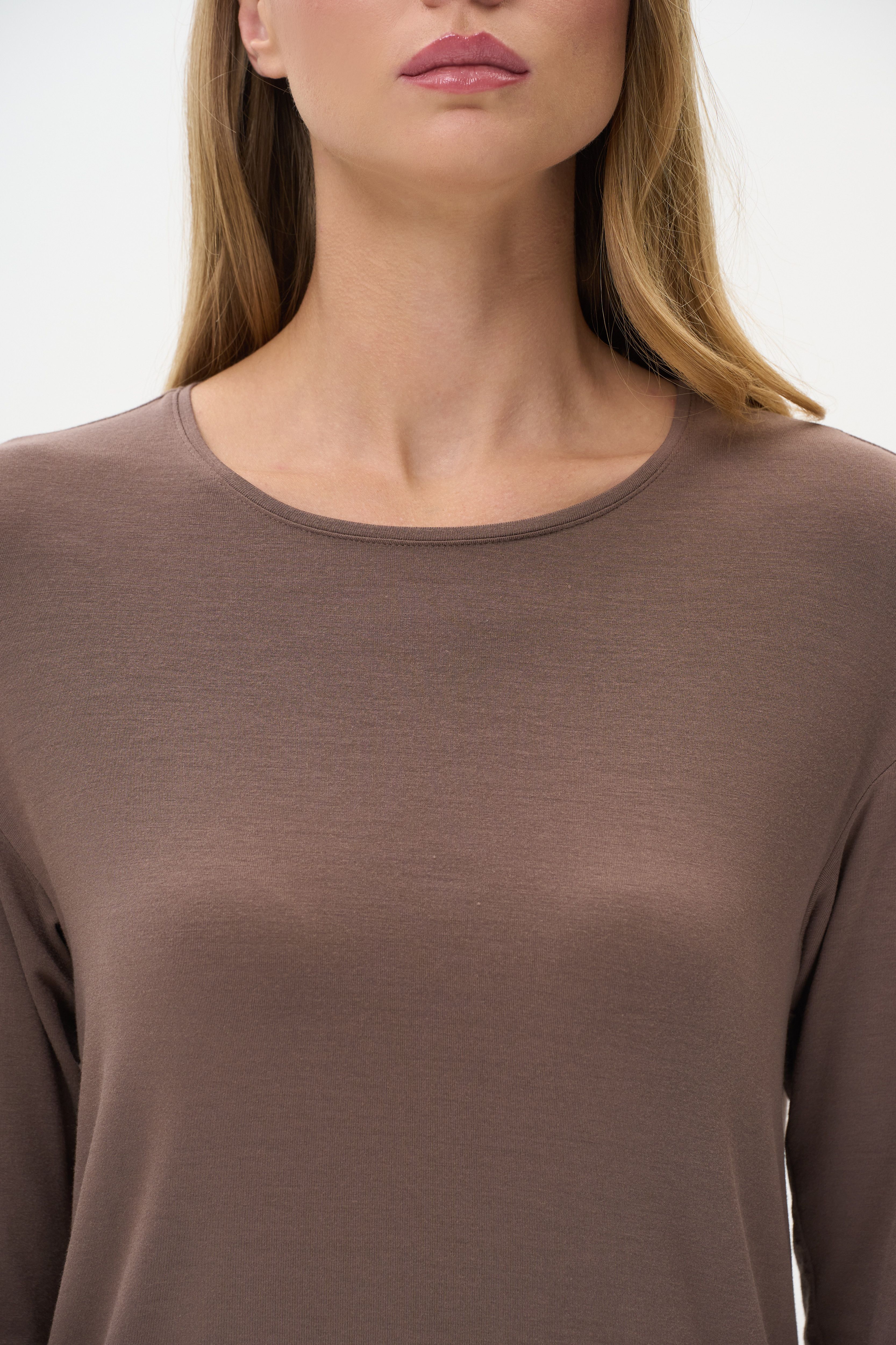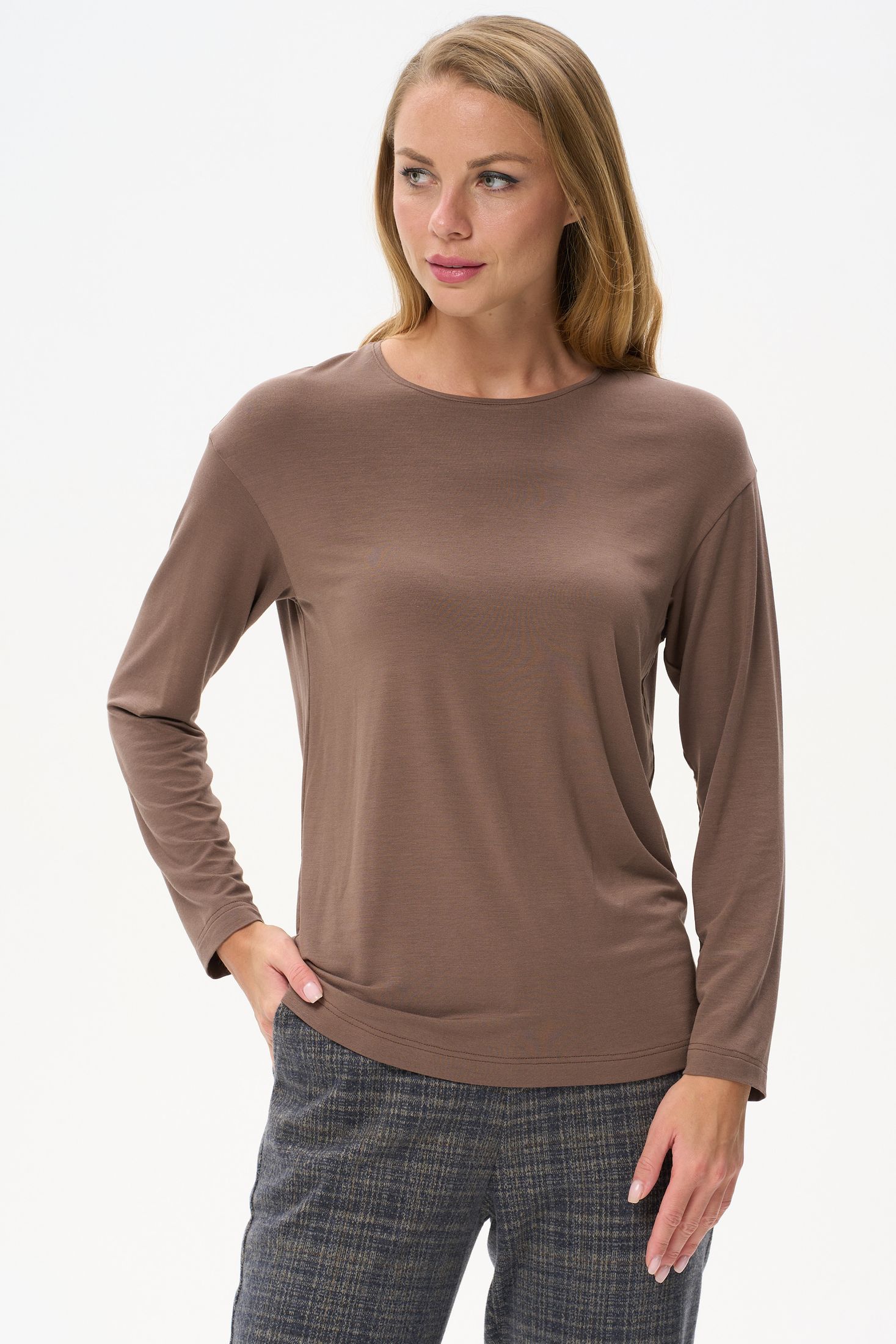 Описание: Комфортный лонгслив из вискозного трикотажного полотна - модал (экологически чистая ткань нового поколения). Прямого силуэта с длинными втачными рукавами и круглой формой горловины. Рост модели 178 см