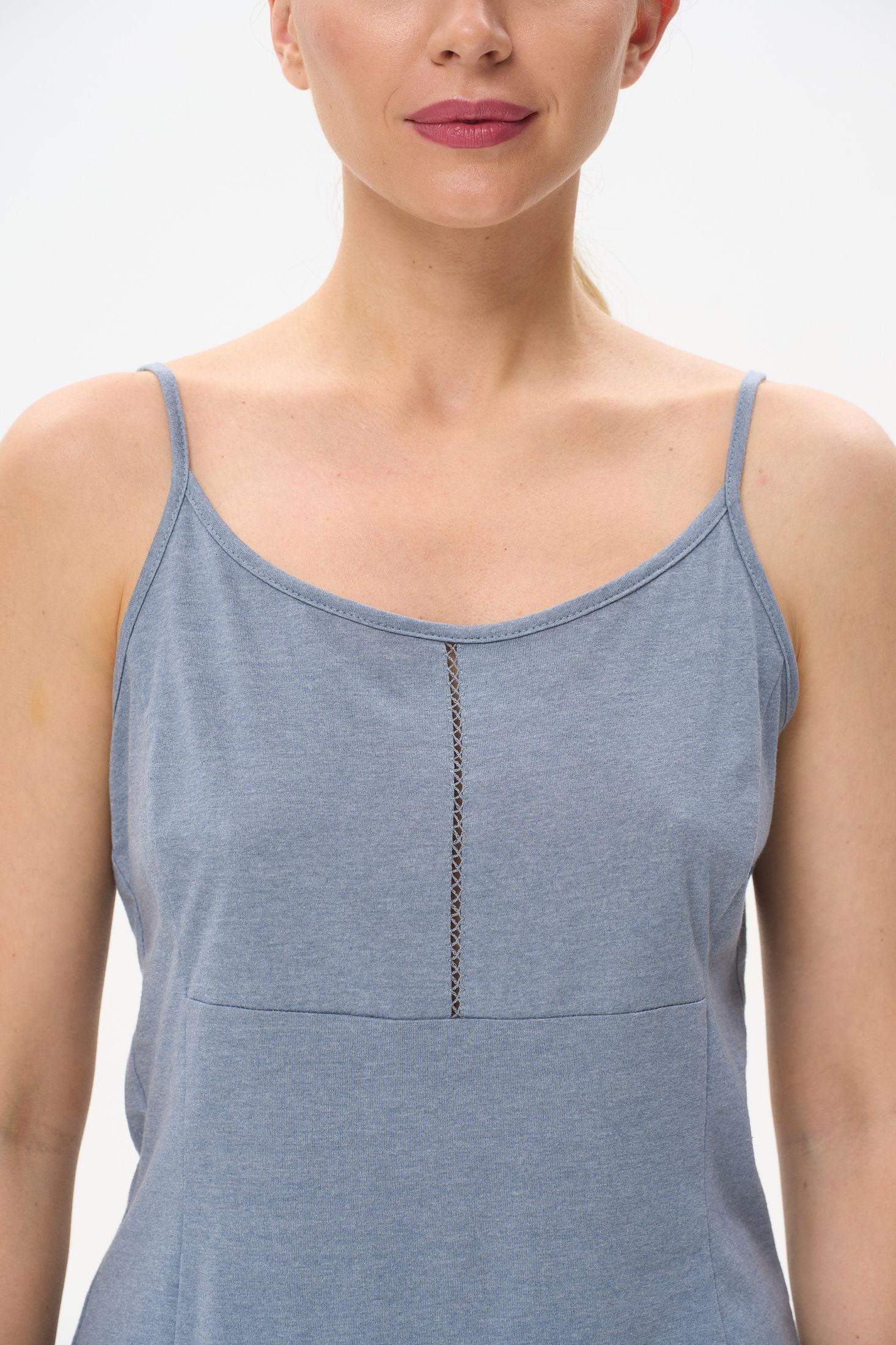 Описание: Комплект выполнен из хлопкового меланжевого полотна. Майка с круглым вырезом горловины. Спереди подрез и средний шов декорирован мережкой. Шорты без карманов, пояс с эластичной лентой внутри. Боковые швы шорт декорированы мережкой. Рост модели на фото 178см.