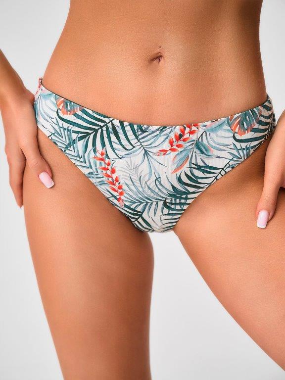 Раздельный купальник из эластичного полотна с тропическим принтом с чашкой soft bra. Бюстгальтер с мягкими чашками, без каркасов и без боковых корсетный вставок. Съемные формованные вкладыши. Спереди декоративная металлическая вставка.Широкие бретели, несъемные и нерегулируемые. Металлическая застежка. Плавки двусторонние. Одна сторона в цвет купльника с тропическим принтом, вторая в цвет подклада - темно-зеленая. Завышенная талия. Подгиб и плоский шов по талии и срез.