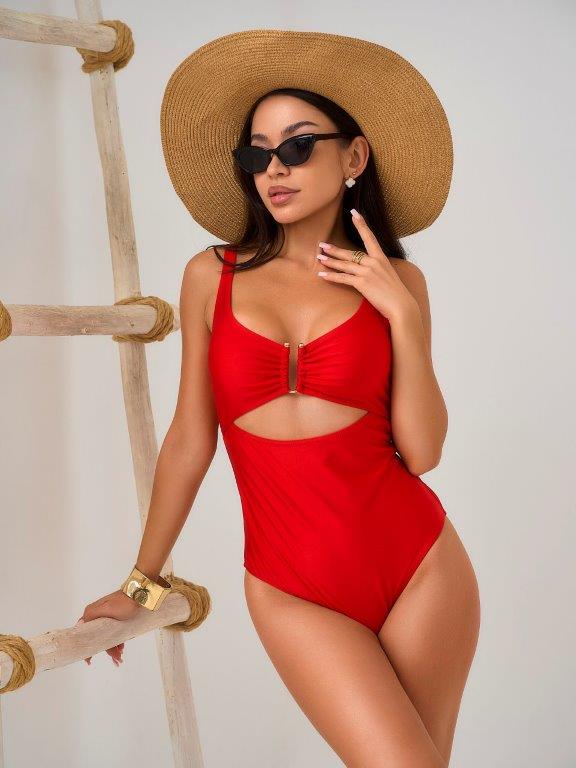 Слитный купальник на подкладе из эластичного полотна с мягкой формованной чашкой soft bra. Мягкая чашка с формованными съемными вкладышами. Без каркасов и без боковых корсетных вставок.Спереди декоративная металлическая вставка. Бретели несъемные и нерегулируемые. Без застежки. Тонкие резинки, подгиб и плоский шов по срезу ножек