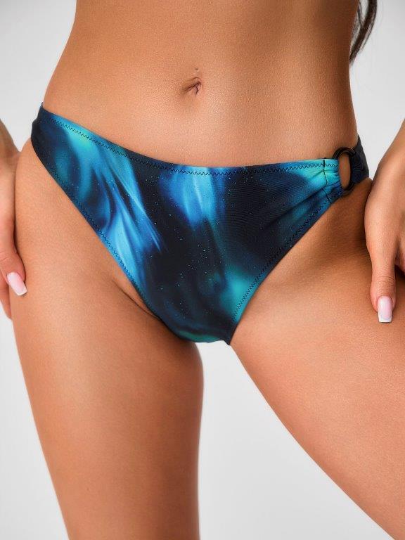 Раздельный купальник с чашкой soft bra. Бюстгальтер - бандо с мягкой чашкой ,с подкладом и съемными формованными вкладышами. Без каркасов, с боковыми корсетными вставками. Кольцо посередине лифа.Съемная бретель закреплена на кольце спереди и завязывается на шее.Застежка пластиковая. Плавки на подкладе, со средней посадкой. Декоративное пластиковое кольцо слева на перелней части плавок. Тонкие резинки, подгиб и плоский шов по талии и вырезу ножек.