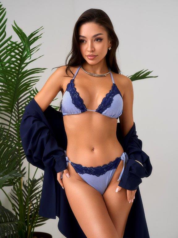 Раздельный купальник из эластичного полотна с блеском и кружевом на подкладе с мягкой чашкой soft bra. Бюстгальтер с мягкой чашкой, со съемными формованными вкладышами. Без каркасов и без боковых корсетных вставок. Верхняя линия чашек декорирована мягким кружевом. Бретели и застежка на завязках. Плавки на подкладе,с завышенной талией. По бокам декоративные завязки. По линии талии декоративное мягкое кружево. Тонкая резинка, подгиб и плоский шов по талии и срезу ножек.