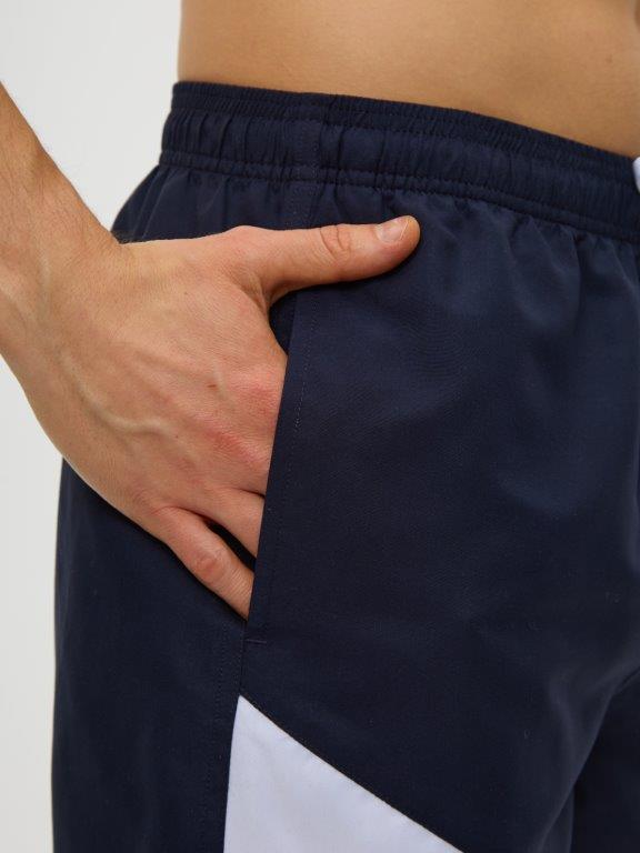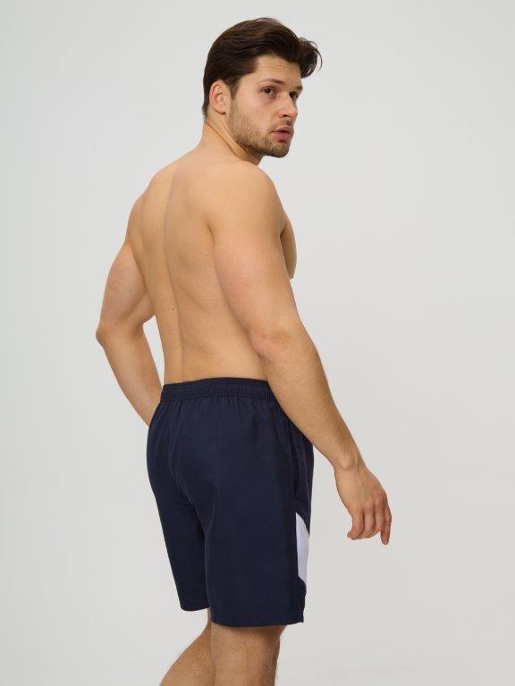 Мужские шорты с боковыми караманми из мягкого полотна без эластана. Контрасные вставки двух цветов на правой части шорт. Внутренние плавки из мягкой эластичной сетки. По линии талии широкая резинка и регулируемый шнурок. Подгиб по нижнему краю шорт.