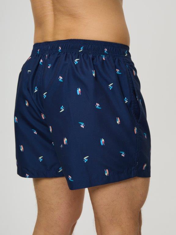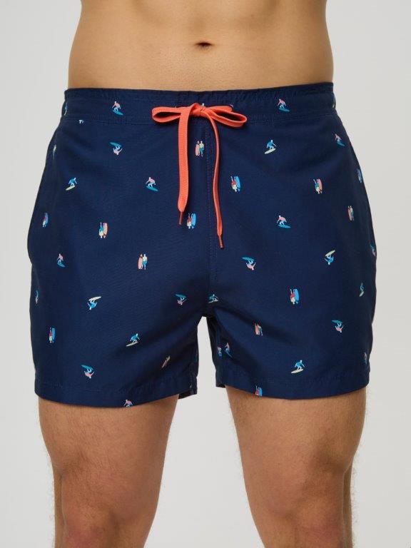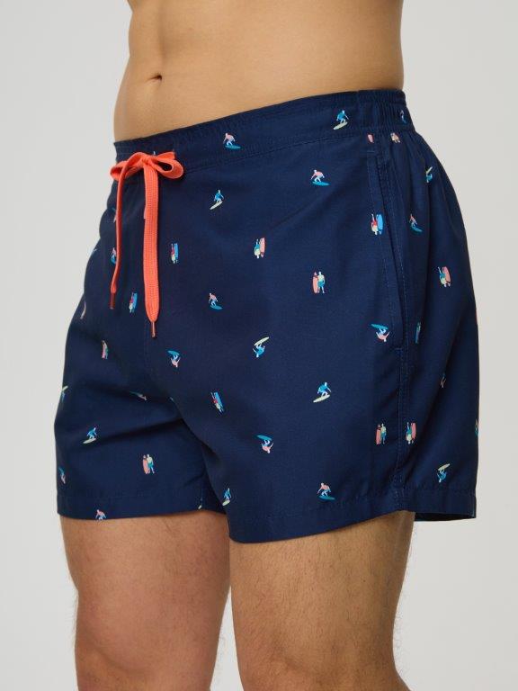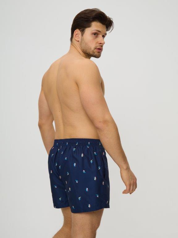 Мужские укороченные плавки из мягкого полотна без эластана, с принтом - серфер. Боковые карманы с двух сторон. Внутренние плавки из мягкой эластичной сетки. Сзади, по линии талии широкая резинка, спереди - регулируемый шнурок. Подгиб по нижнему краю шорт.